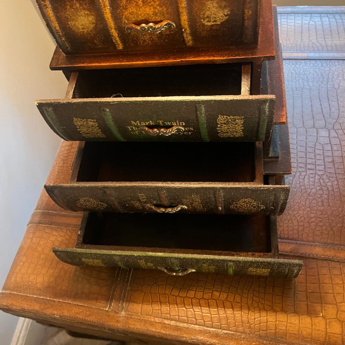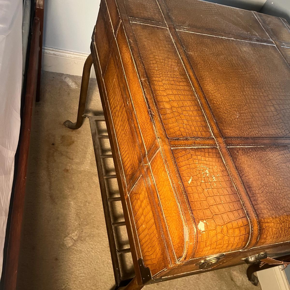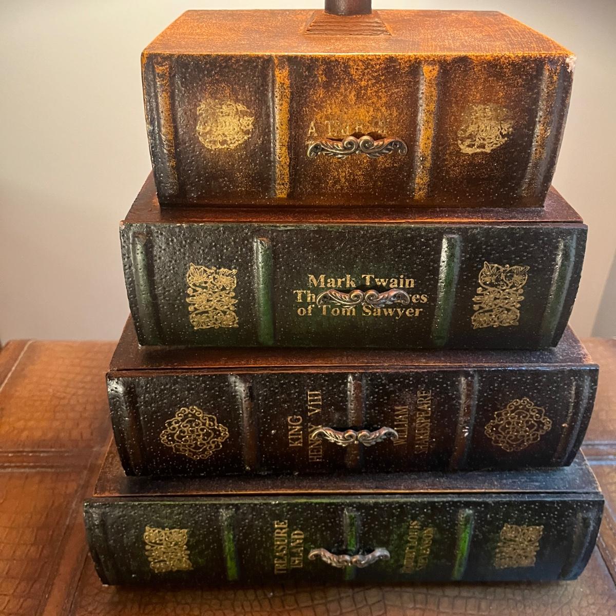 Lot a Universal Furniture end table that has an iron base with a faux leather suitcase for the top with drawer and a faux book table lamp with three drawers. Table measures 26” x 31” x 26”H and lamp without shade measures 11” x 9” x 26”H. Table