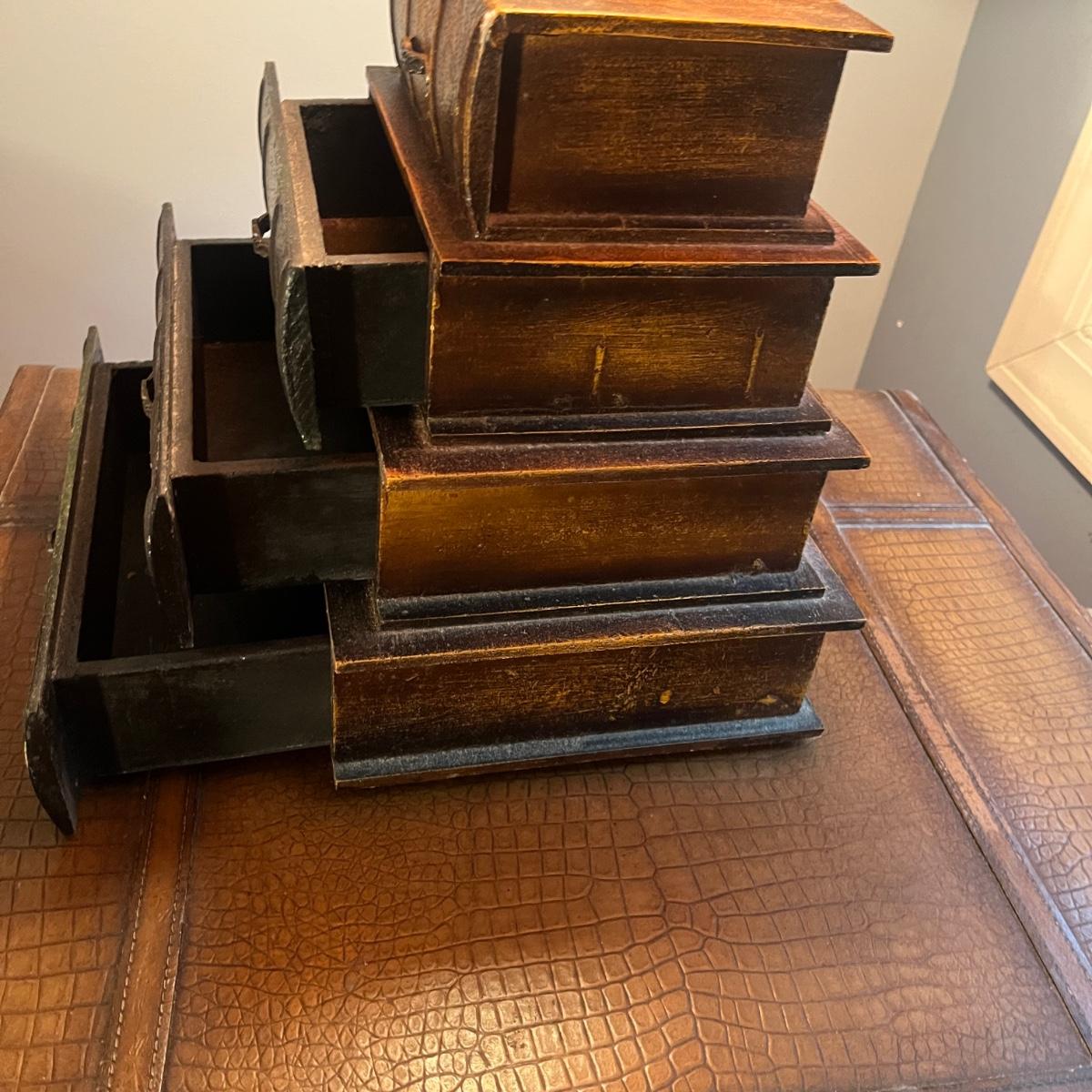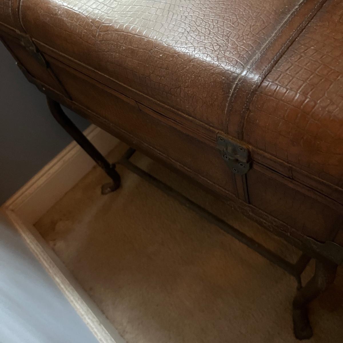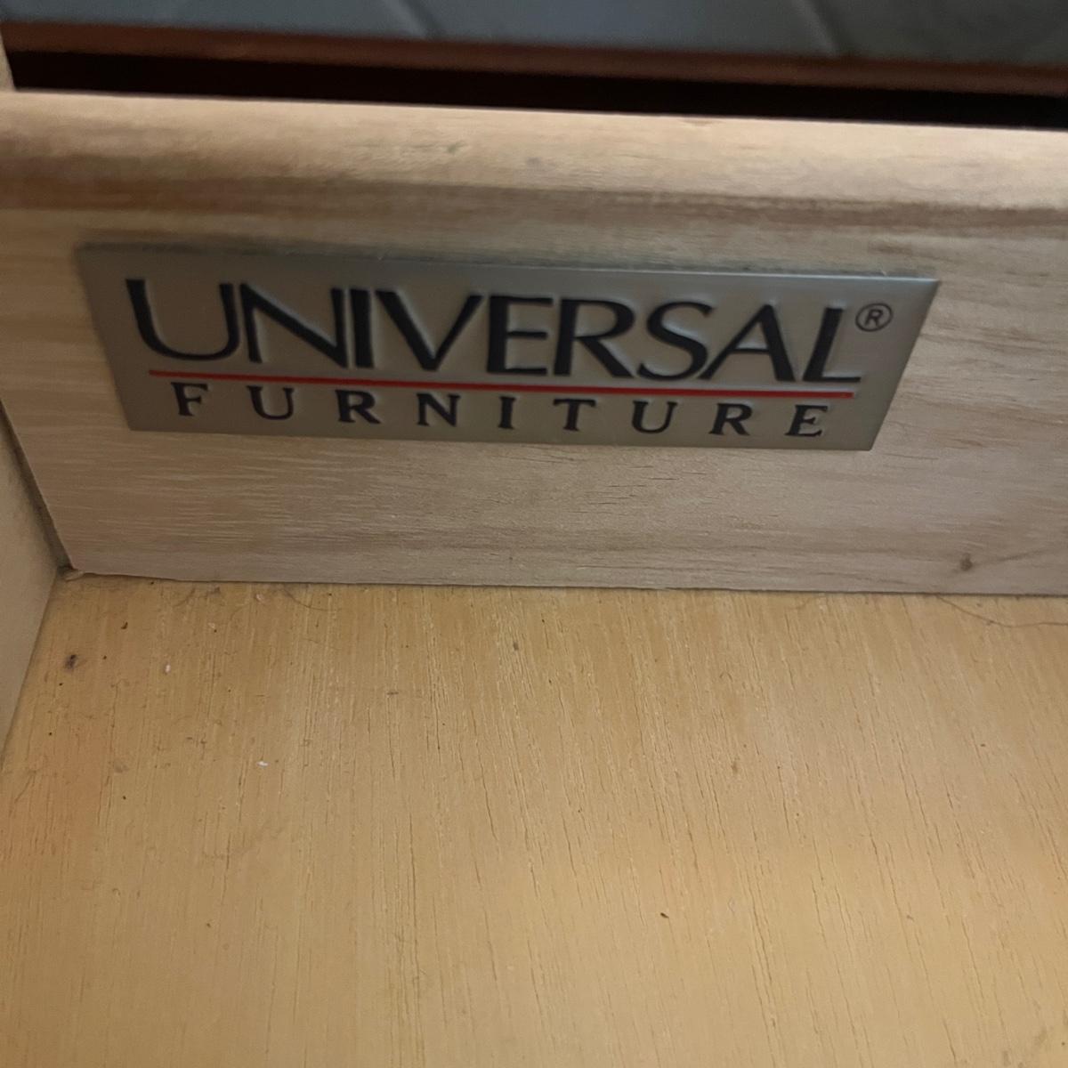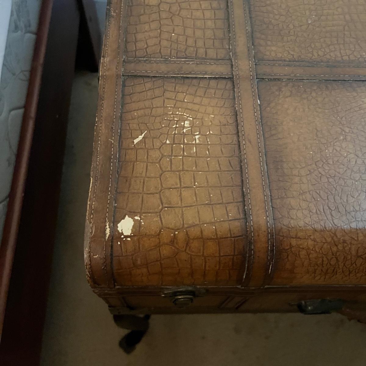 Lot a Universal Furniture end table that has an iron base with a faux leather suitcase for the top with drawer and a faux book table lamp with three drawers. Table measures 26” x 31” x 26”H and lamp without shade measures 11” x 9” x 26”H. Table