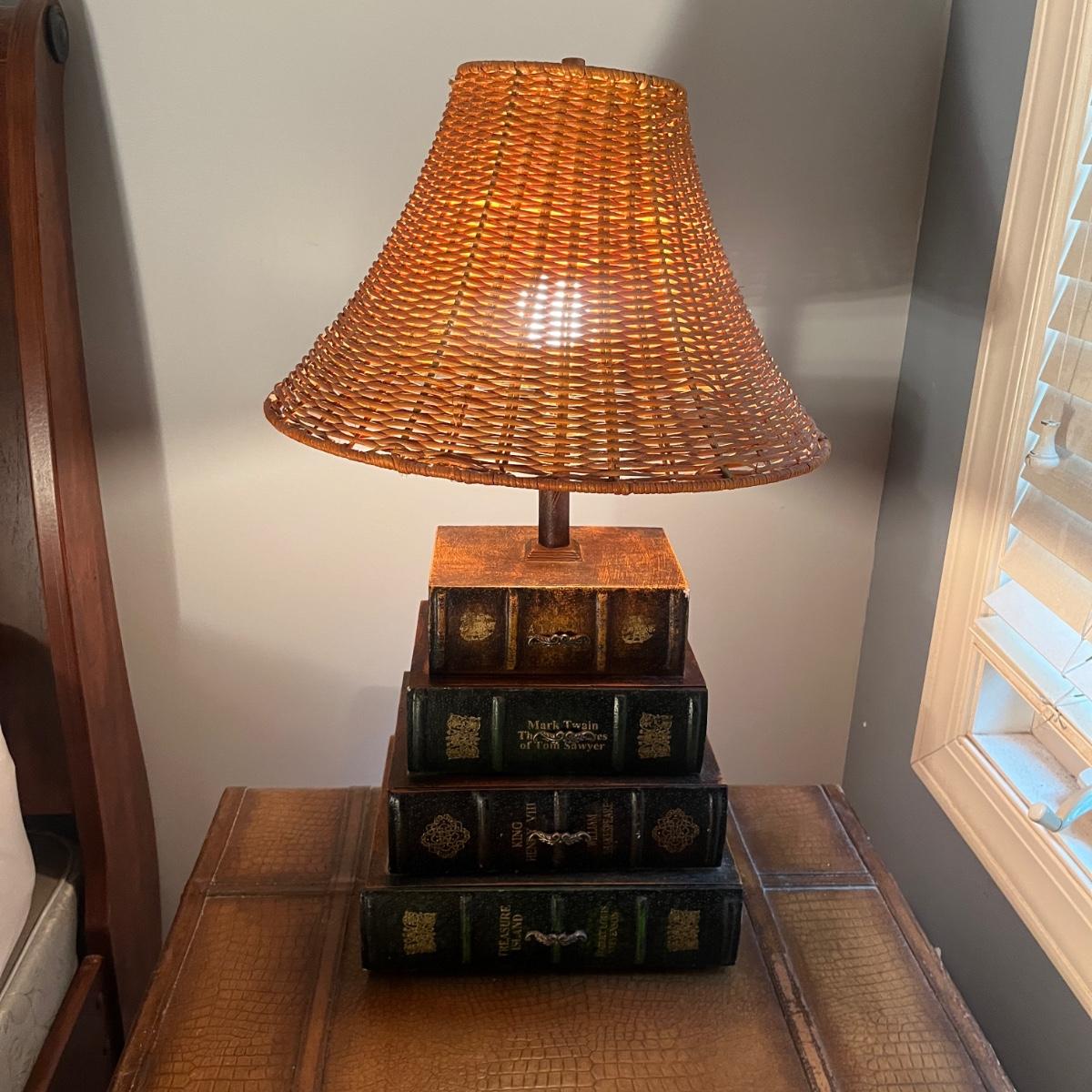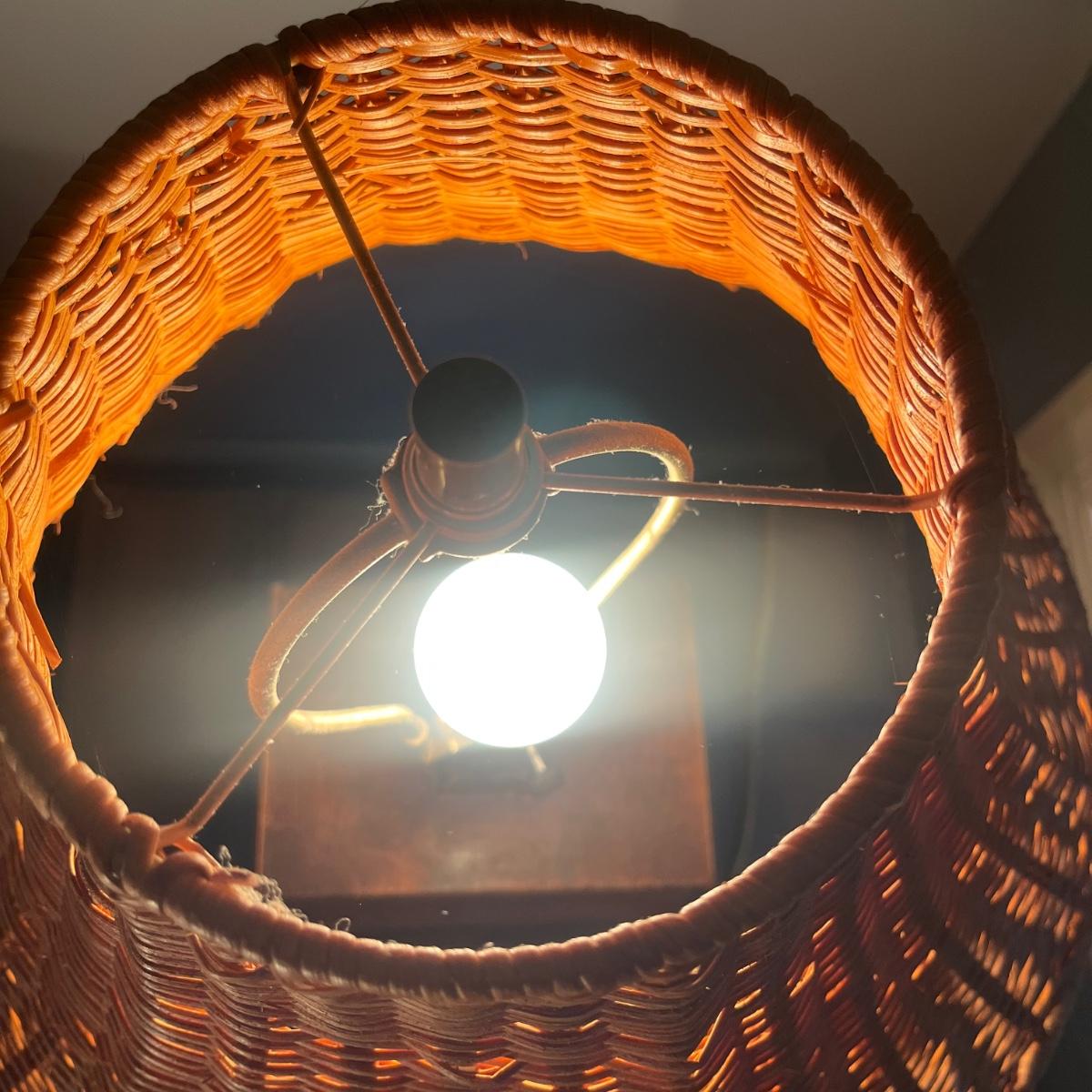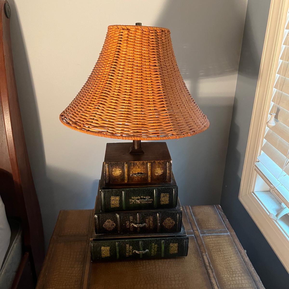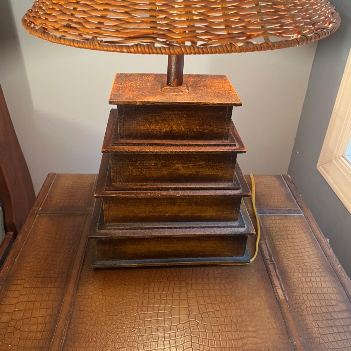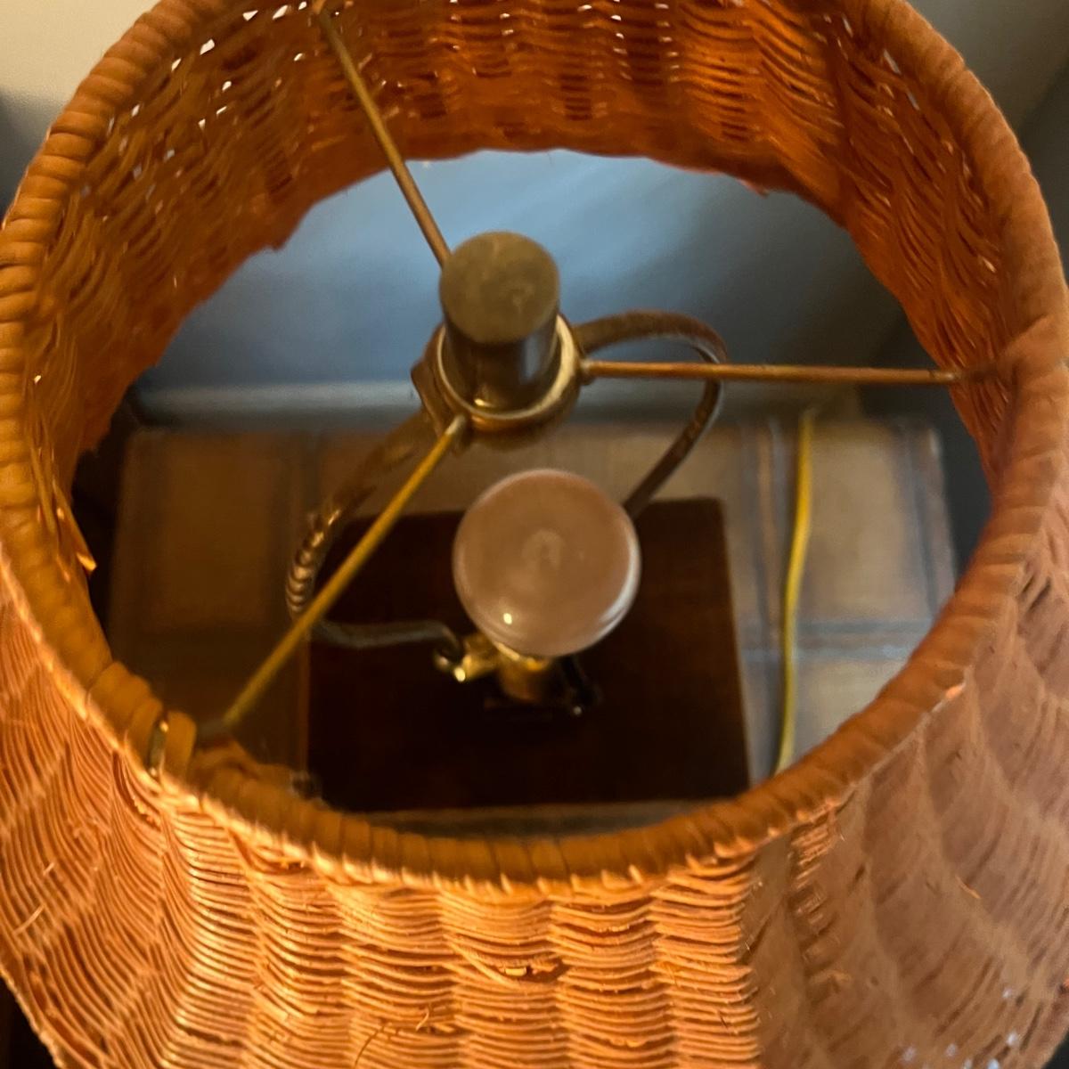 Has a few scuffs (see pix). Lamp shade appears to be wicker.