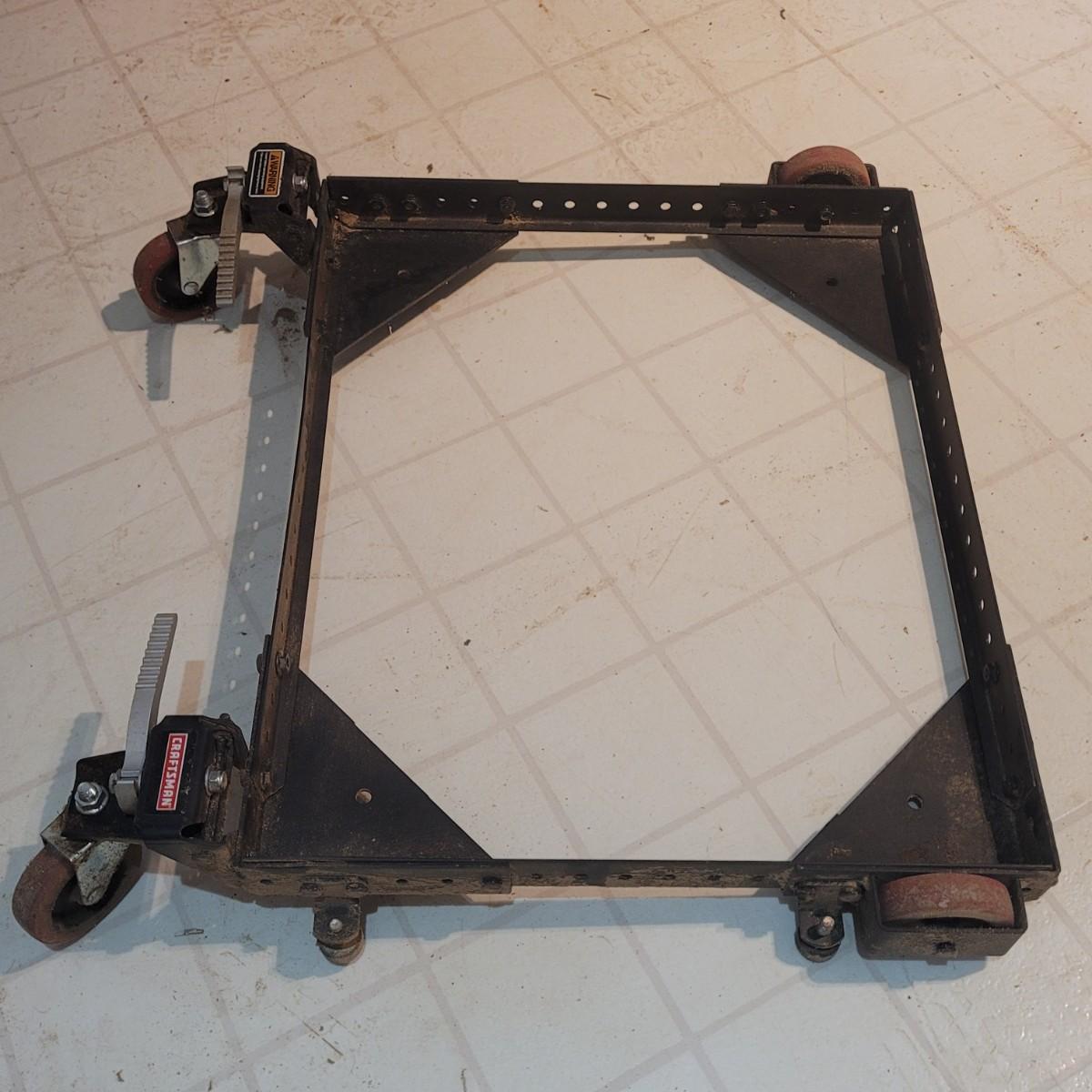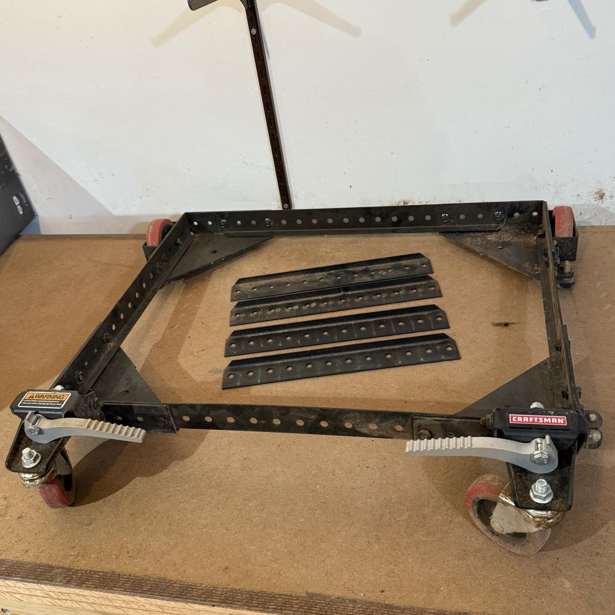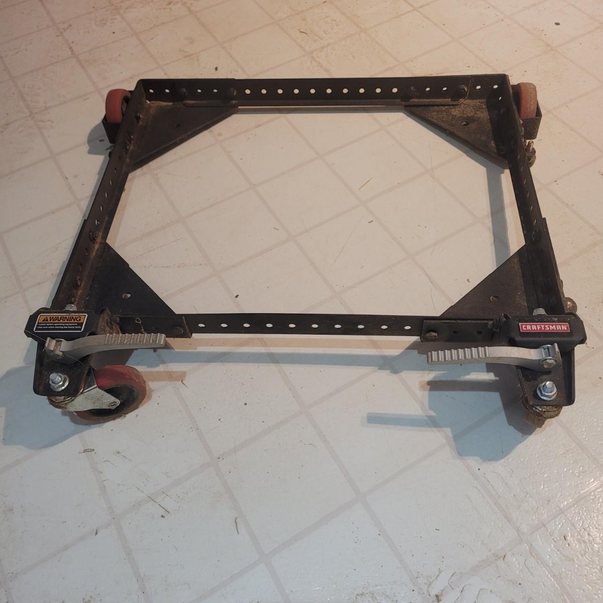 Craftsman brand universal mobile tool base. Features two stationary and two spinning wheels. One set of wheels locks. Made from solid metal. Item measures 25" x 23" x 5"H. Four 12” extension parts are included as well.