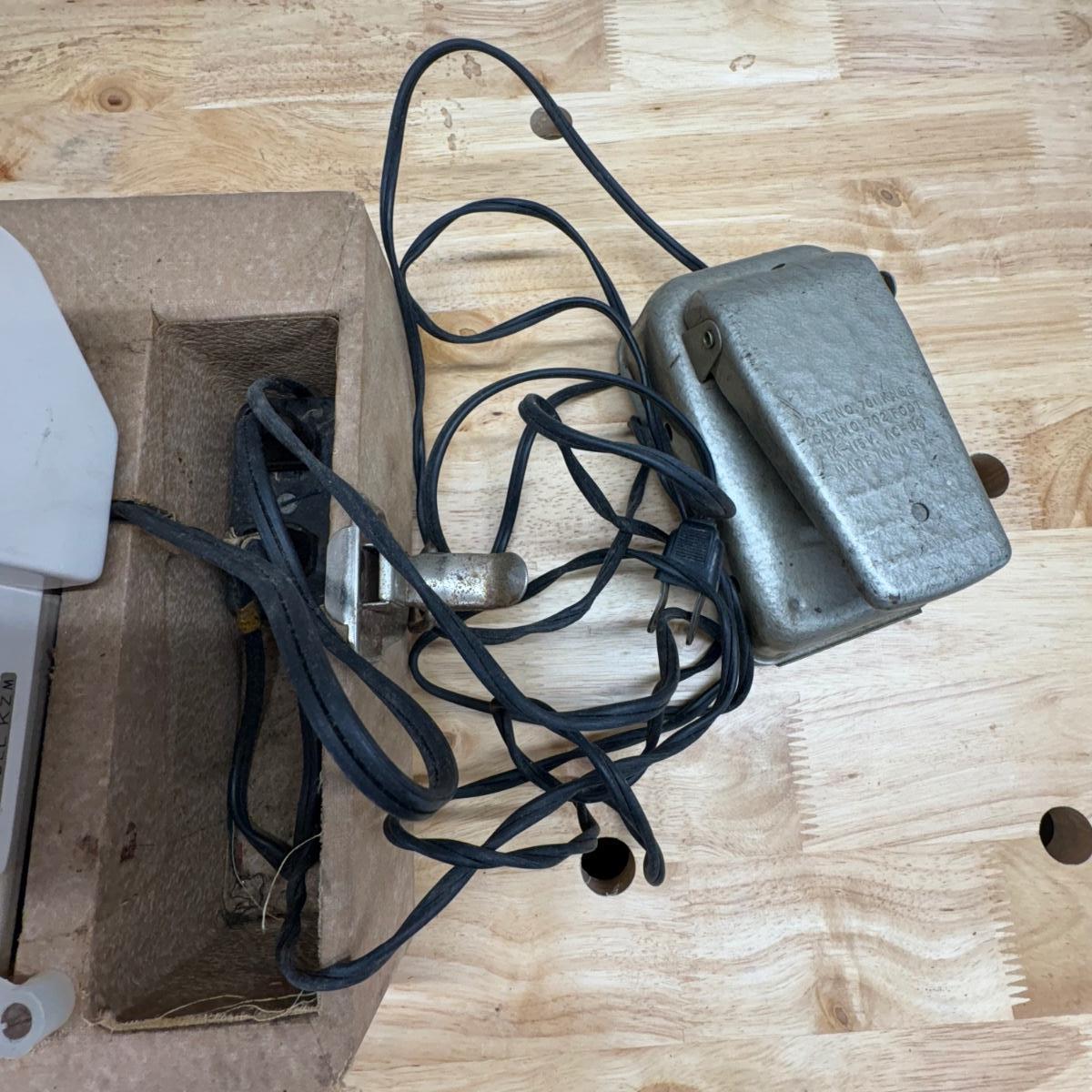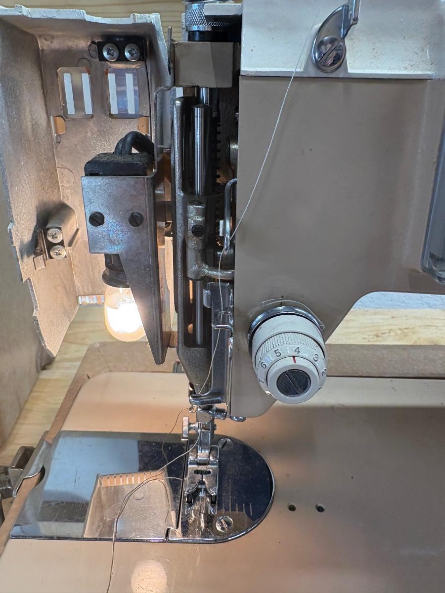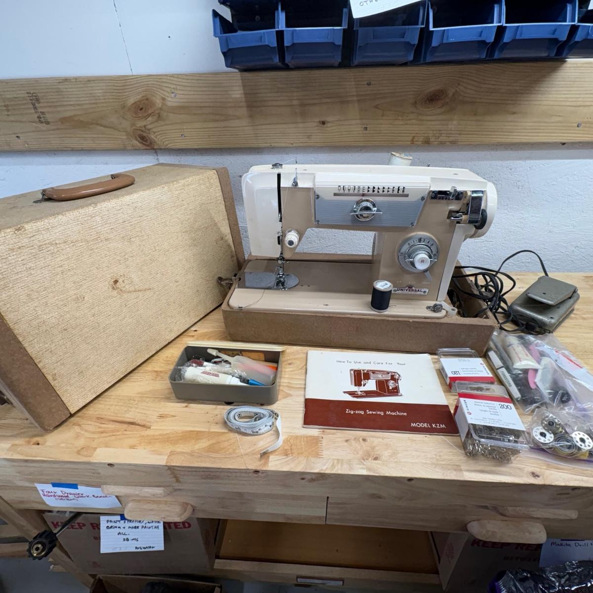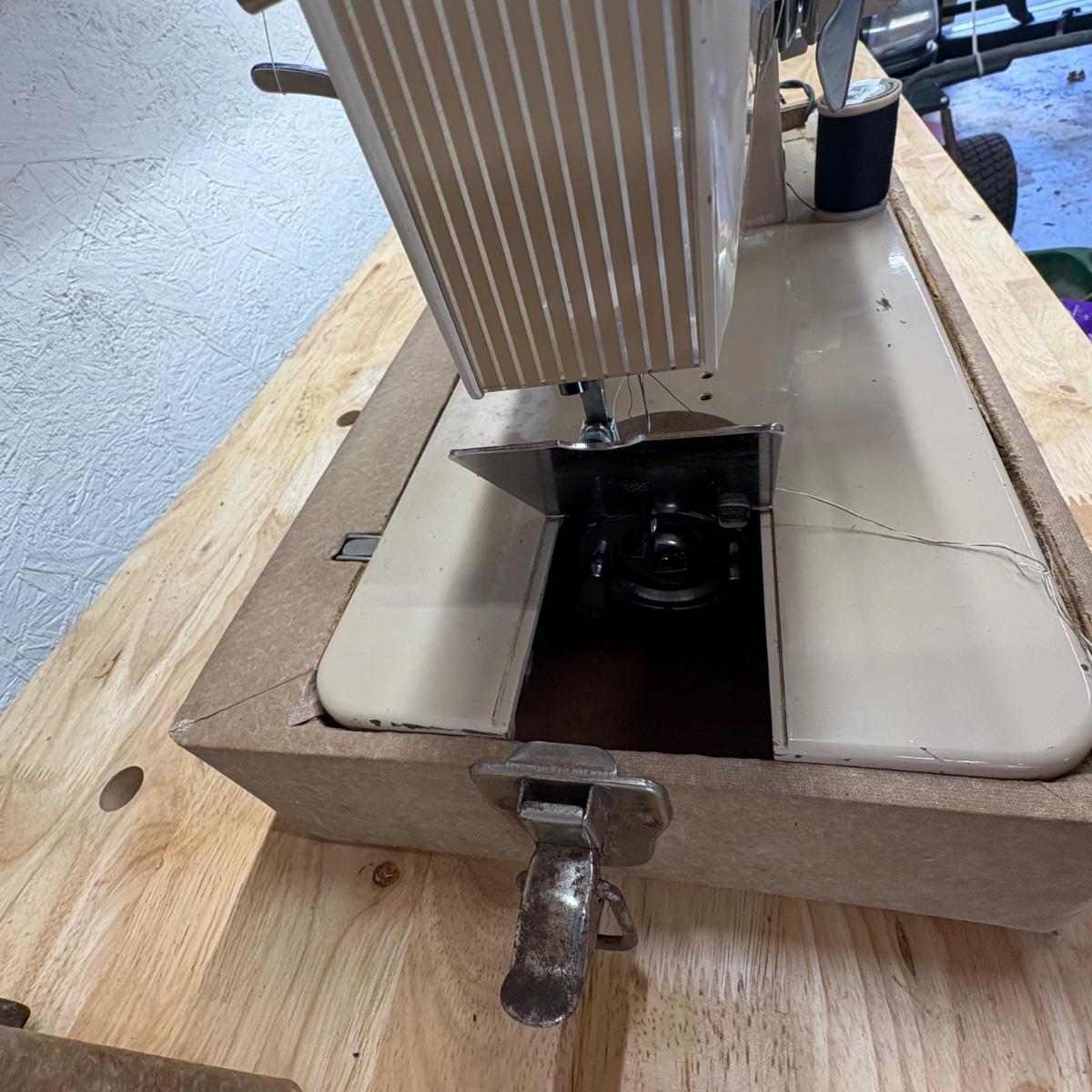 Sewing machine powered on when plugged in. Light came on and the pedal powered the motor. Most switches/ knobs turned except stitch selector. Accessories include various presser feet, bobbins, lubricant, pins and more. The case itself is quite heavy and has a slight mildew smell. Machine is primarily metal with plastic parts.