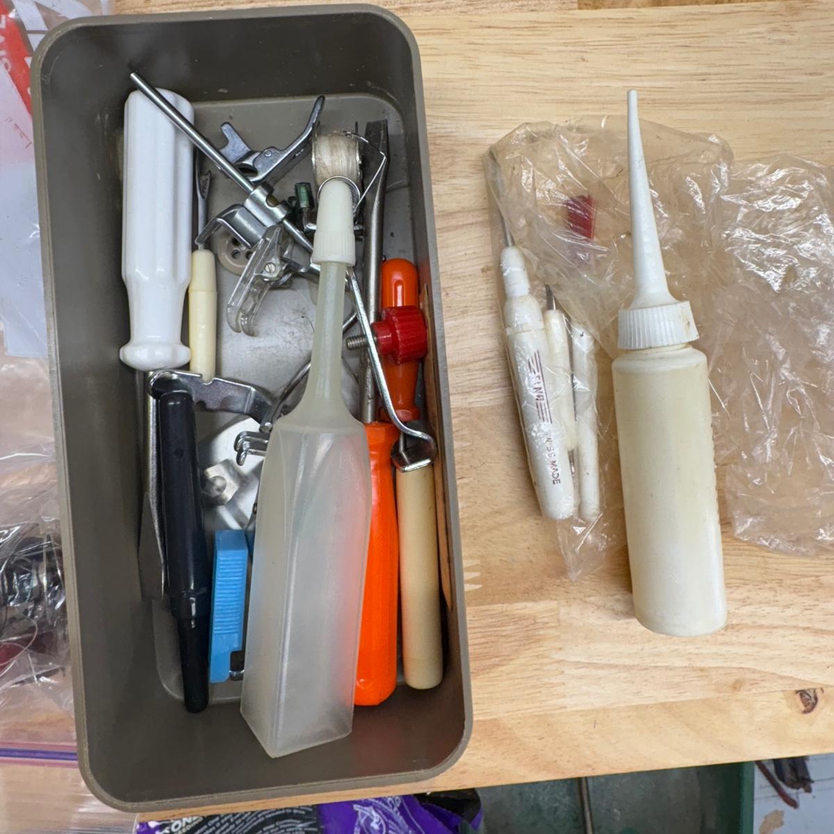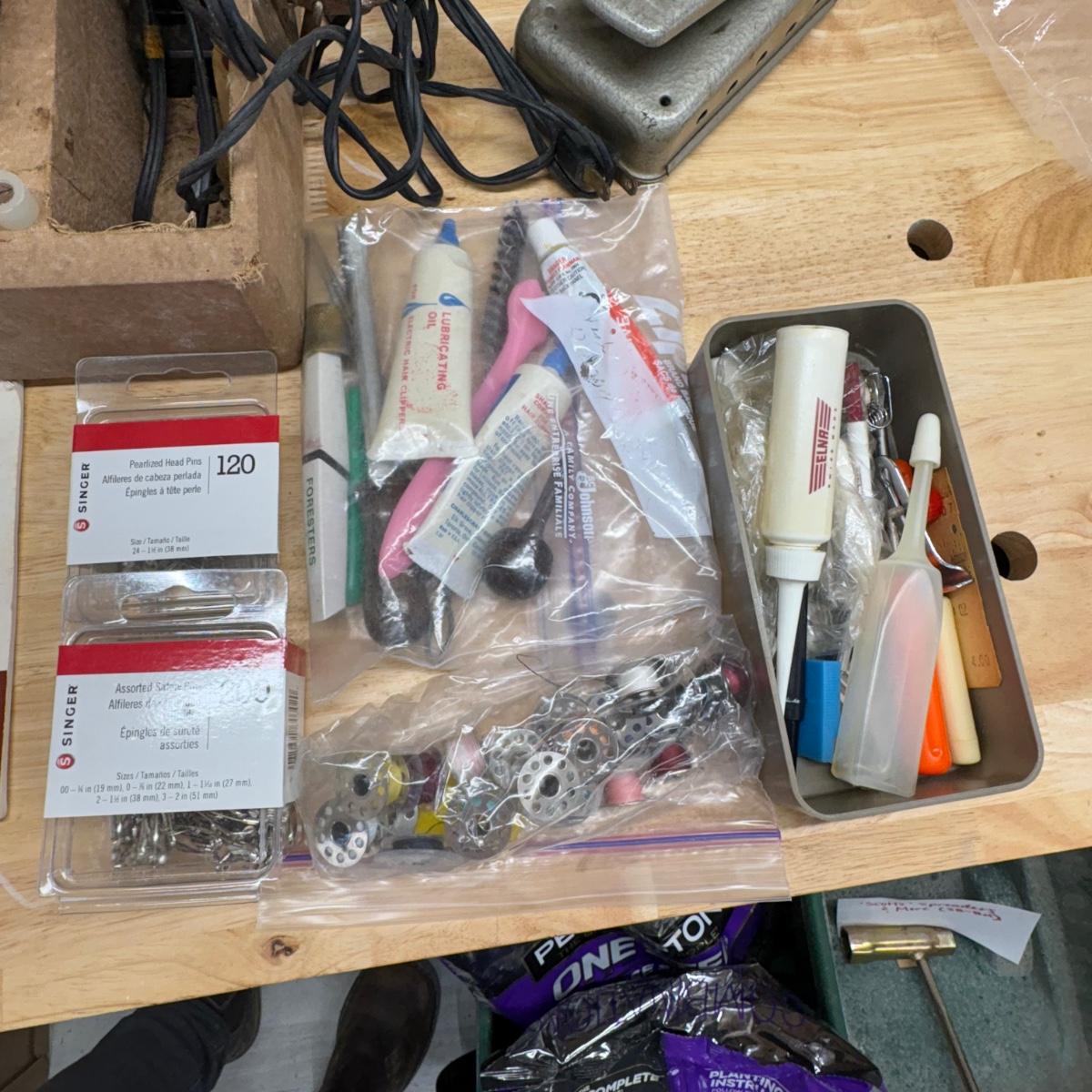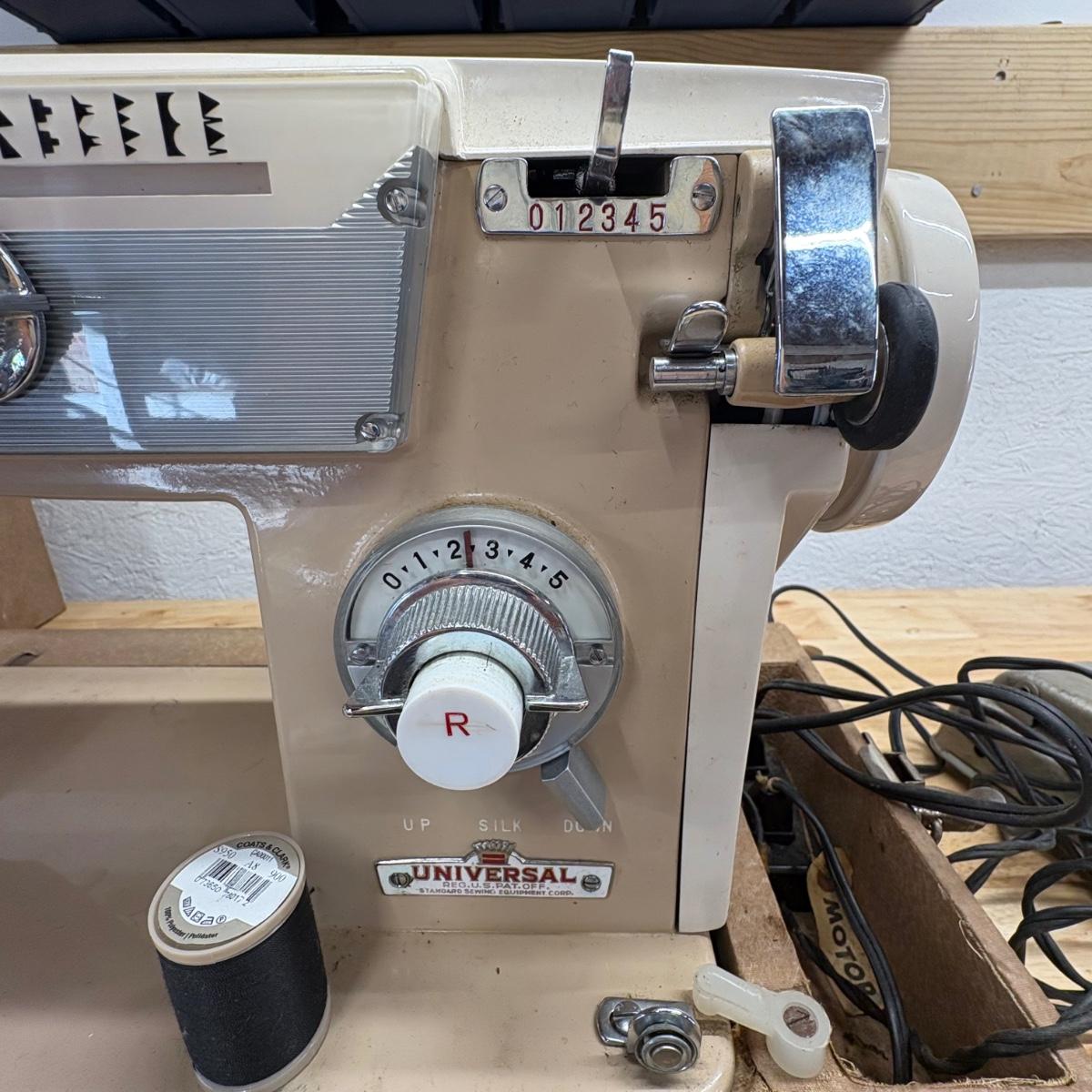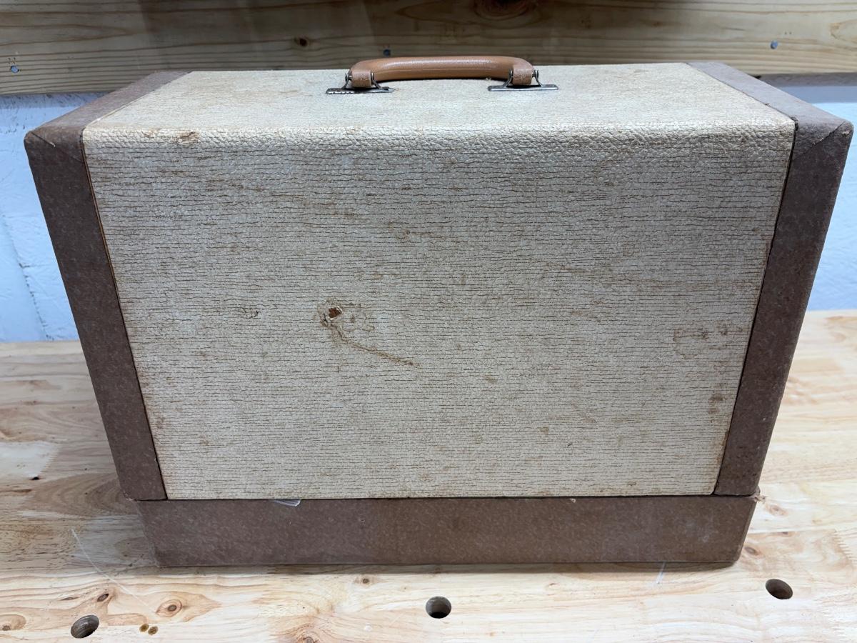 Sewing machine powered on when plugged in. Light came on and the pedal powered the motor. Most switches/ knobs turned except stitch selector. Accessories include various presser feet, bobbins, lubricant, pins and more. The case itself is quite heavy and has a slight mildew smell. Machine is primarily metal with plastic parts.