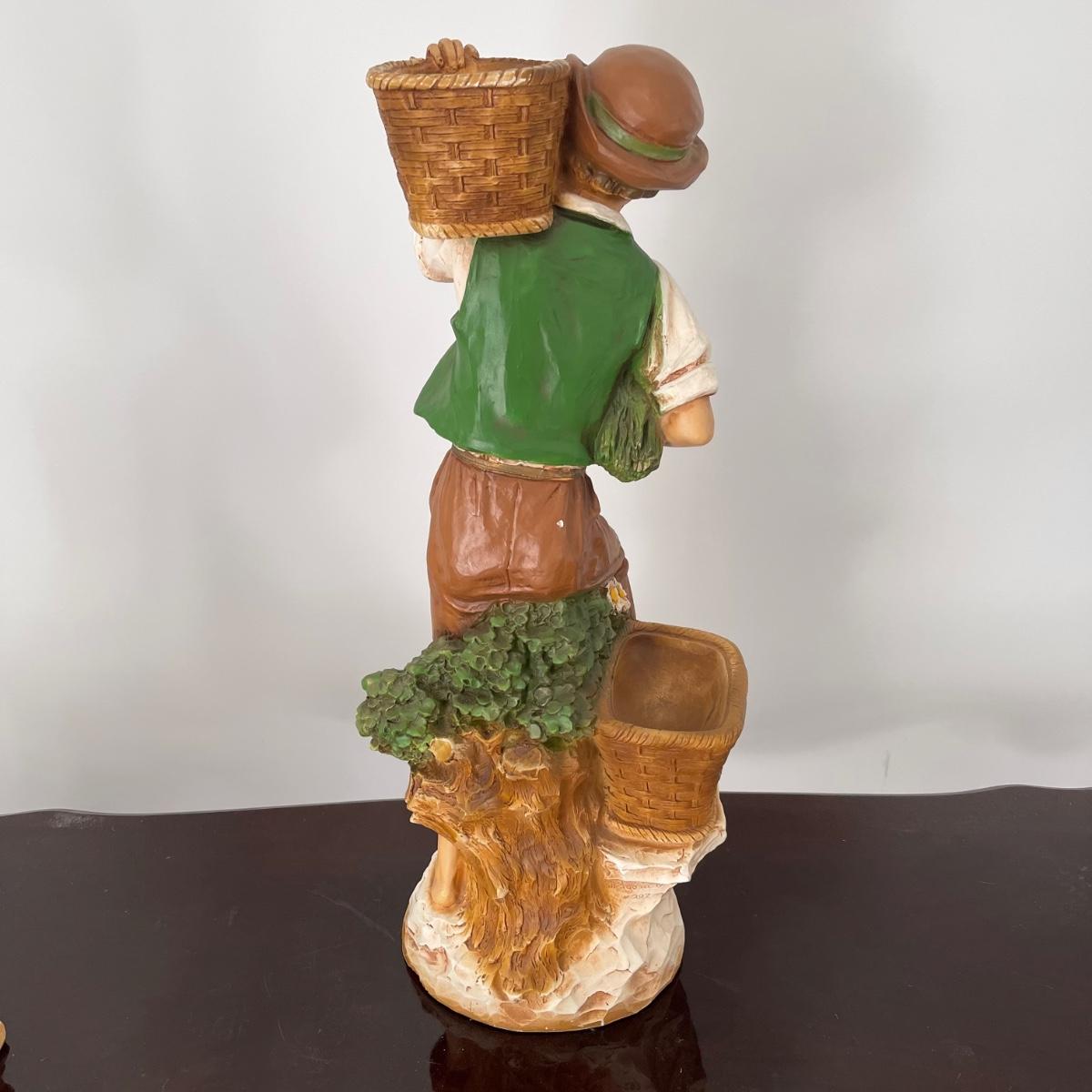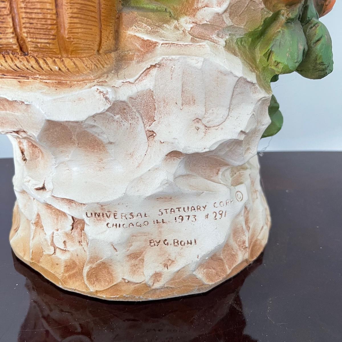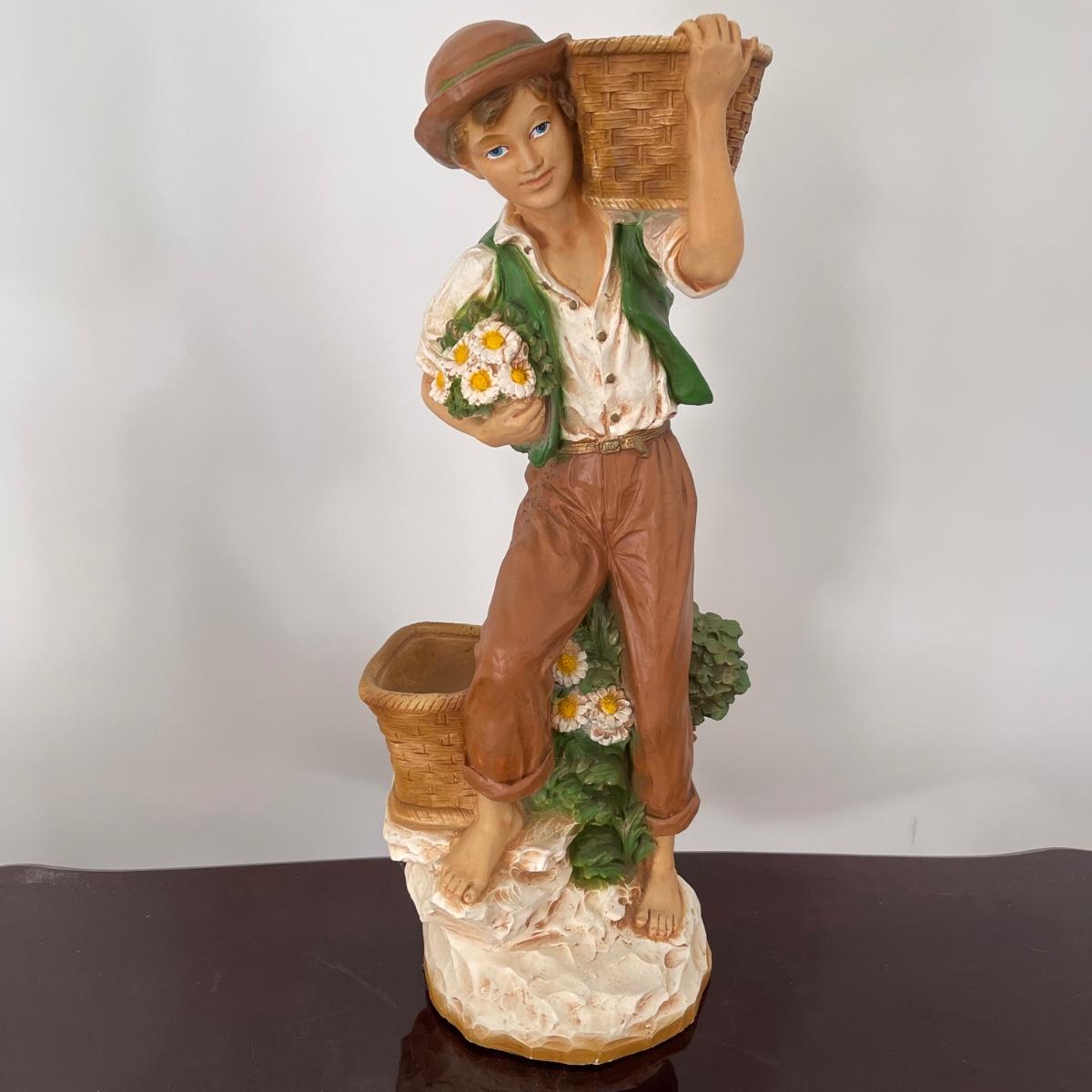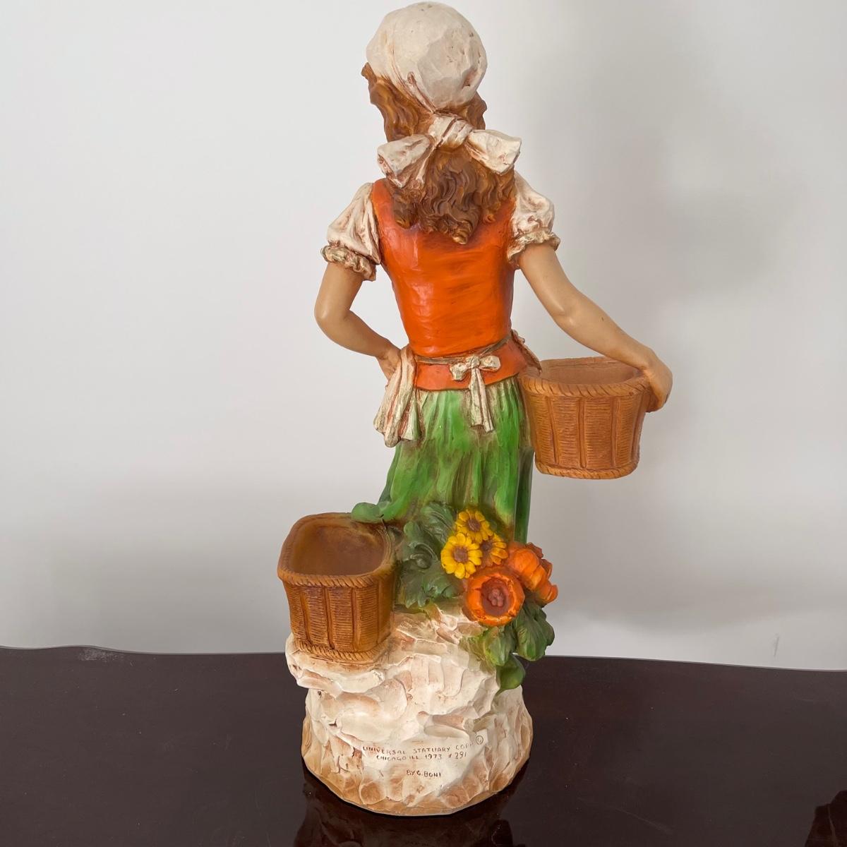 These two Universal Statuary Corp statues stand at about 22 inches tall. The first is a peasant girl with baskets and the inscription identification year and number of 1973 #291 by G. Boni. The second is a peasant boy with baskets and the inscription of 1974 #292, no signature. Shipping available.