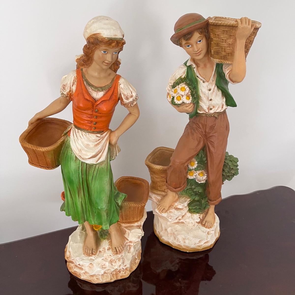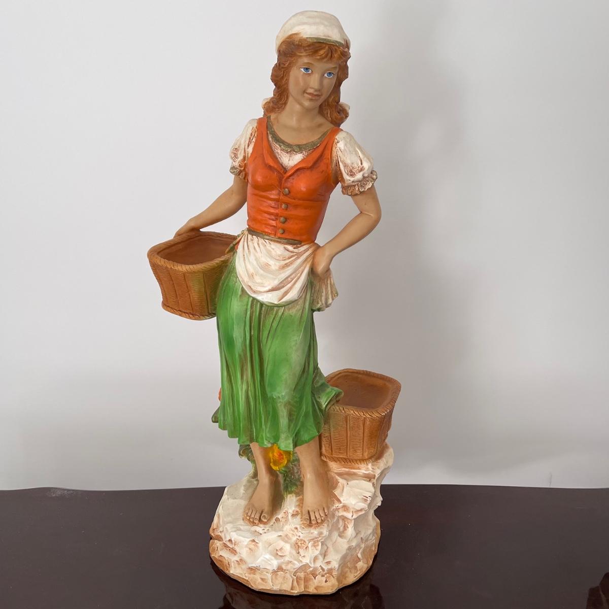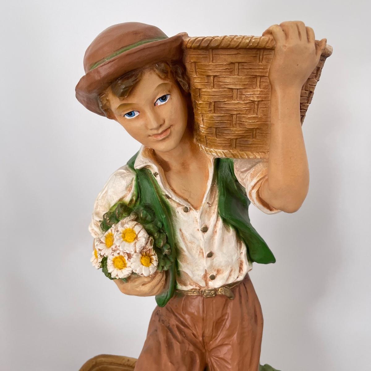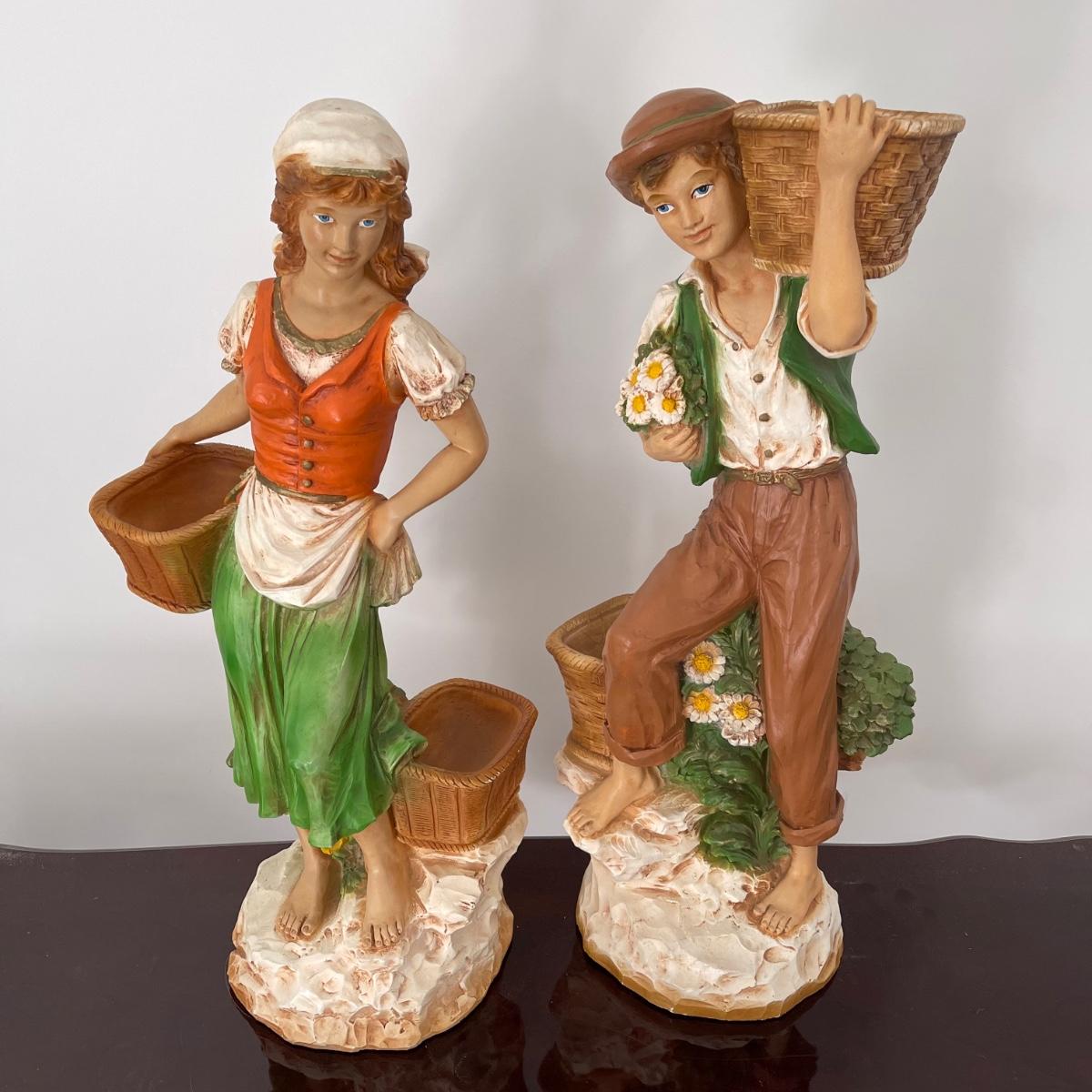 These two Universal Statuary Corp statues stand at about 22 inches tall. The first is a peasant girl with baskets and the inscription identification year and number of 1973 #291 by G. Boni. The second is a peasant boy with baskets and the inscription of 1974 #292, no signature. Shipping available.