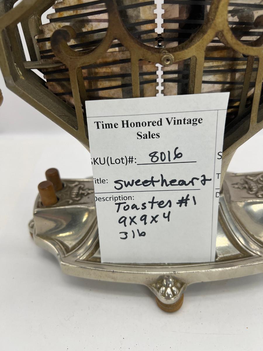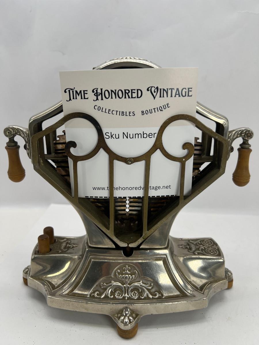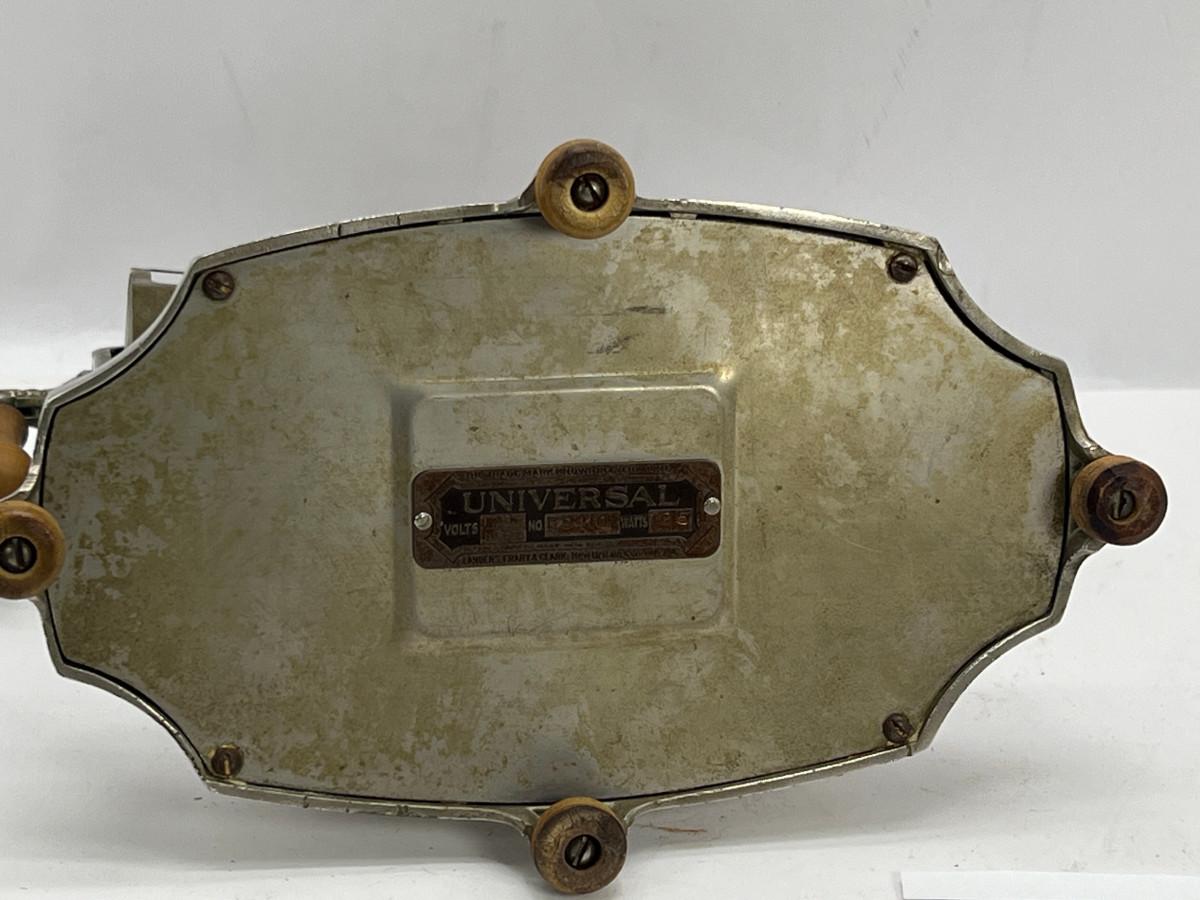 This “Universal” toaster model E9410 was patented in 1929. Fondly called the “Sweetheart,” the toaster has a feminine appeal with its earring-like handles, diamond-shaped body, and floral and arabesque decoration. The delicate design of this metal casing helped to shield the industrial nature of the electrical heating element behind it. Therefore the toaster became an attractive addition to the kitchen as well as to the dining table at the time of a meal. This toaster not only exhibits an eye-catching design but also incorporates clever mechanics. The toaster cooks two slices at a time in cages that swivel out with the touch of the raised buttons at the base, one button for each side of the contraption. Releasing the button swings the cage back against the toaster. Each subsequent pushing of a button then makes the basket rotate in the opposite direction, This unit is missing the cord,Unit is being sold as a "non-working" vintage electronic device that should be gone over by a qualified technician prior to use. May have rust, corrosion or other flaws see pictures.