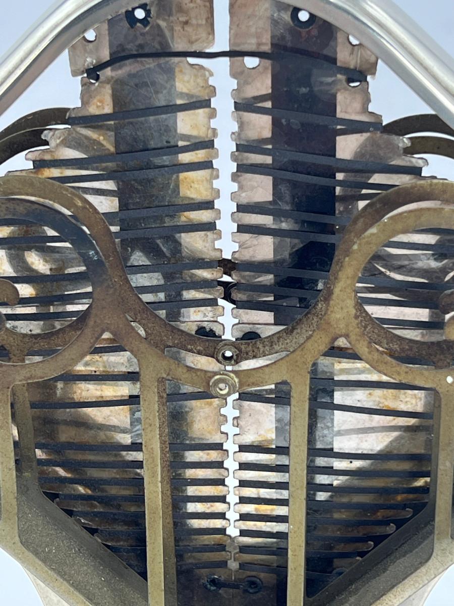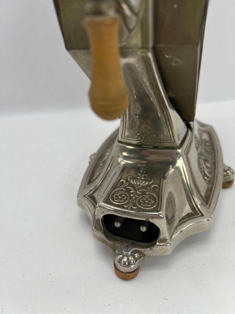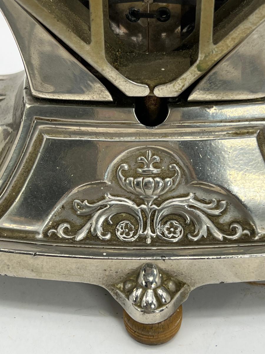 This “Universal” toaster model E9410 was patented in 1929. Fondly called the “Sweetheart,” the toaster has a feminine appeal with its earring-like handles, diamond-shaped body, and floral and arabesque decoration. The delicate design of this metal casing helped to shield the industrial nature of the electrical heating element behind it. Therefore the toaster became an attractive addition to the kitchen as well as to the dining table at the time of a meal. This toaster not only exhibits an eye-catching design but also incorporates clever mechanics. The toaster cooks two slices at a time in cages that swivel out with the touch of the raised buttons at the base, one button for each side of the contraption. Releasing the button swings the cage back against the toaster. Each subsequent pushing of a button then makes the basket rotate in the opposite direction, This unit is missing the cord,Unit is being sold as a "non-working" vintage electronic device that should be gone over by a qualified technician prior to use. May have rust, corrosion or other flaws see pictures.