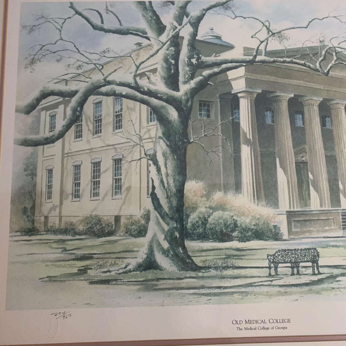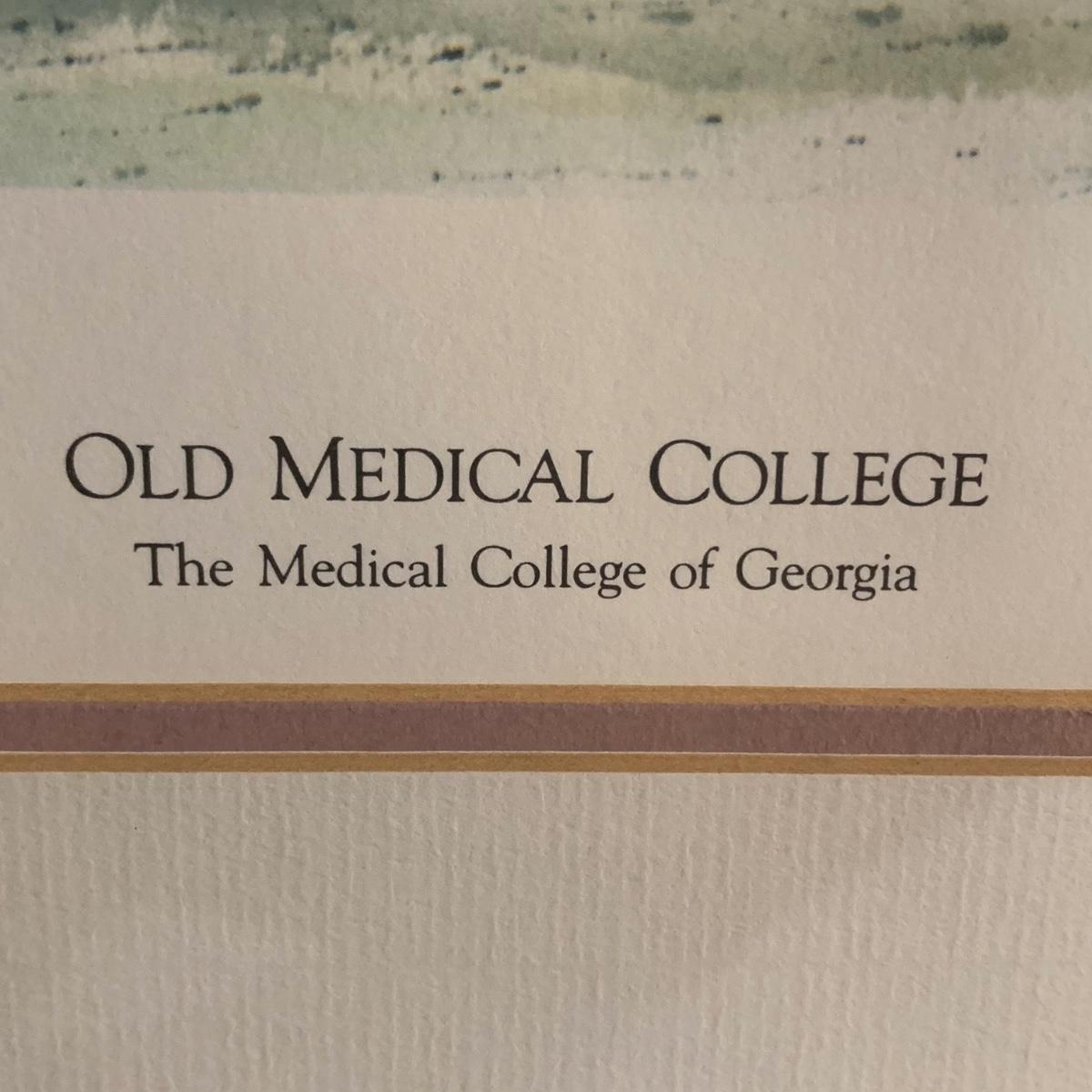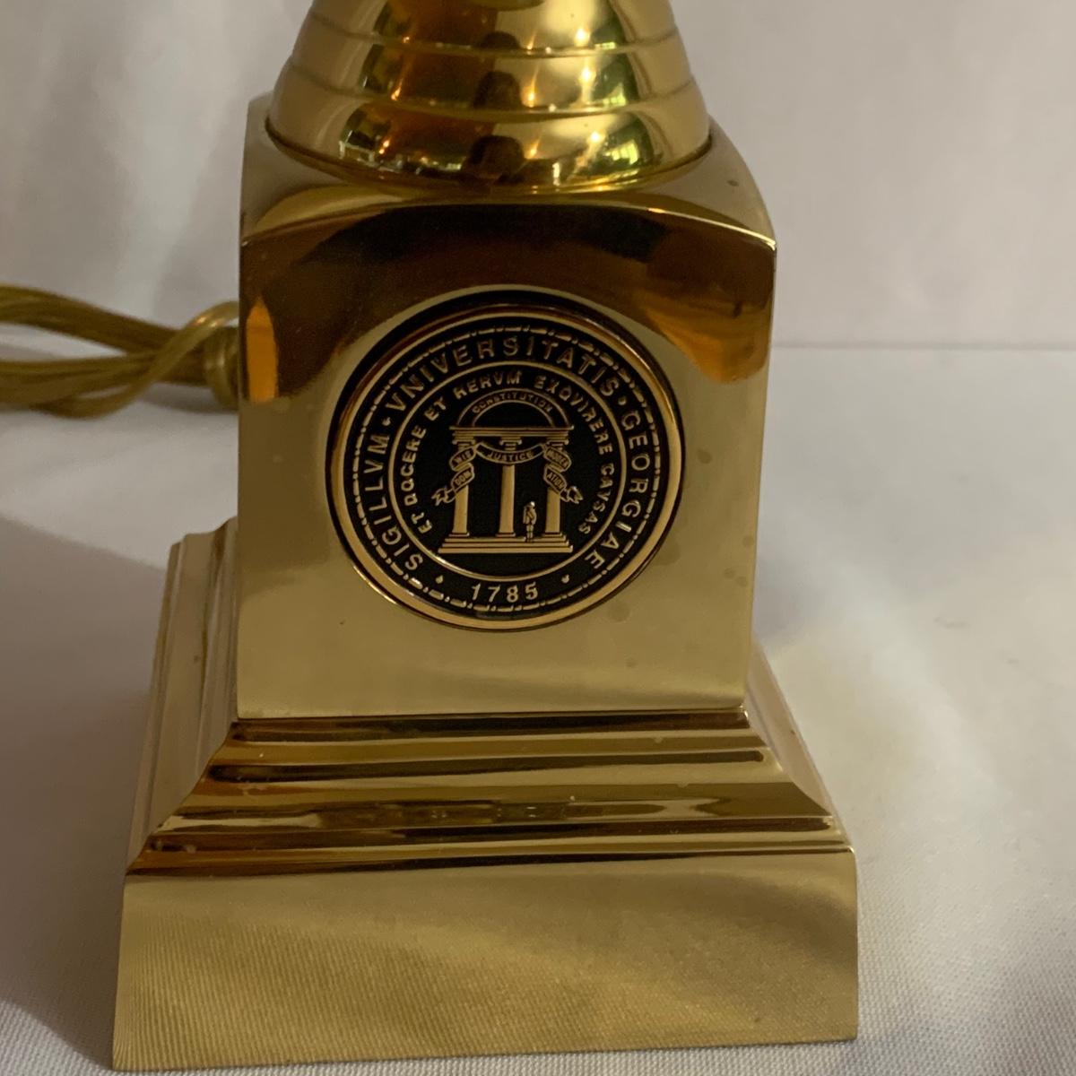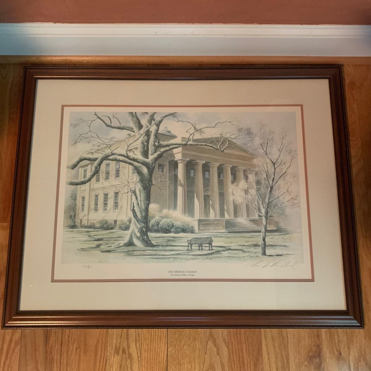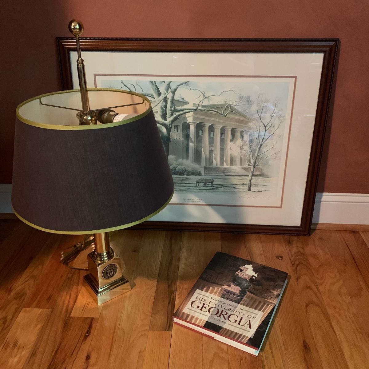 University of Georgia lot includes brass-like lamp with shade that powered on whenplugged in, Pictorial History of The University of Georgia, and framed art. Art is a print of the old Medical College of Georgia. Print is in a wood frame with ivory mat, behind glass. Art is signed and numbered “274/955” in pencil. Frame measures 32” x 25. Please see photos for more details.