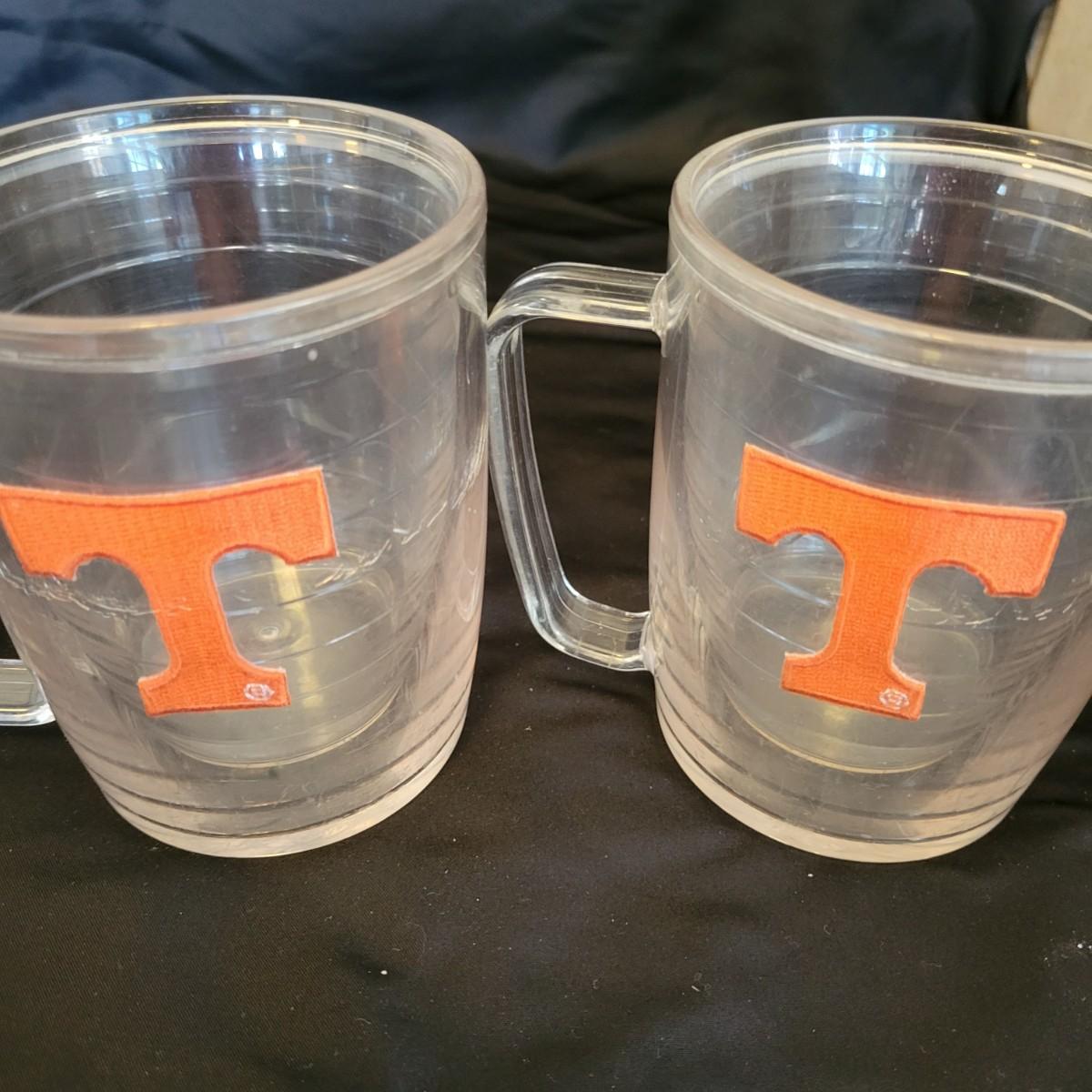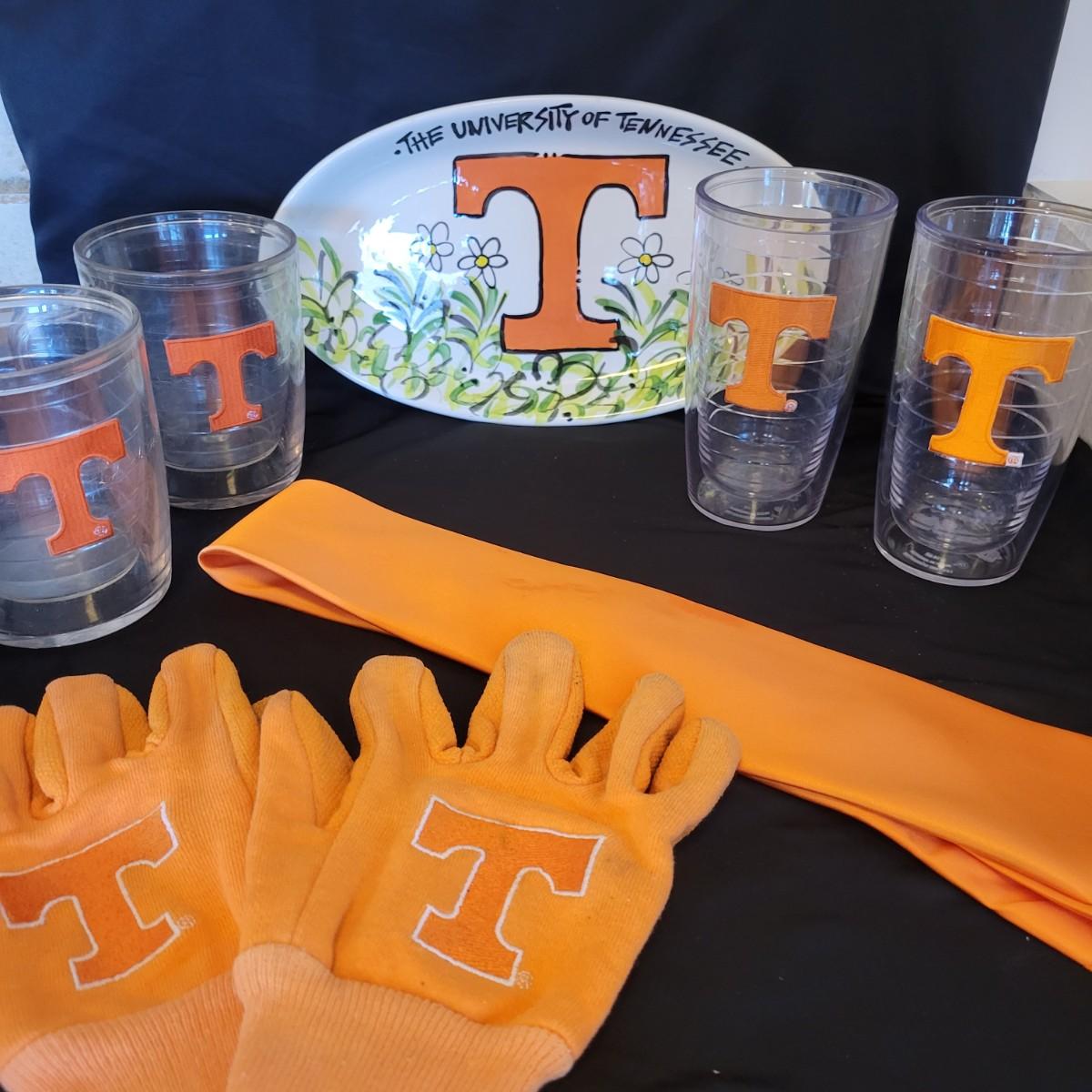 An assortment of University of Tennessee items in good condition but with some minor blemishes. Included is a ceramic plate, four insulated mugs (two have minor cracks), a satin tie (with a stain), and a pair of gardening gloves. Ceramic plate measures approximately 12" x 7" x 1.5". Shipping available
