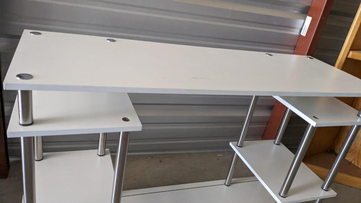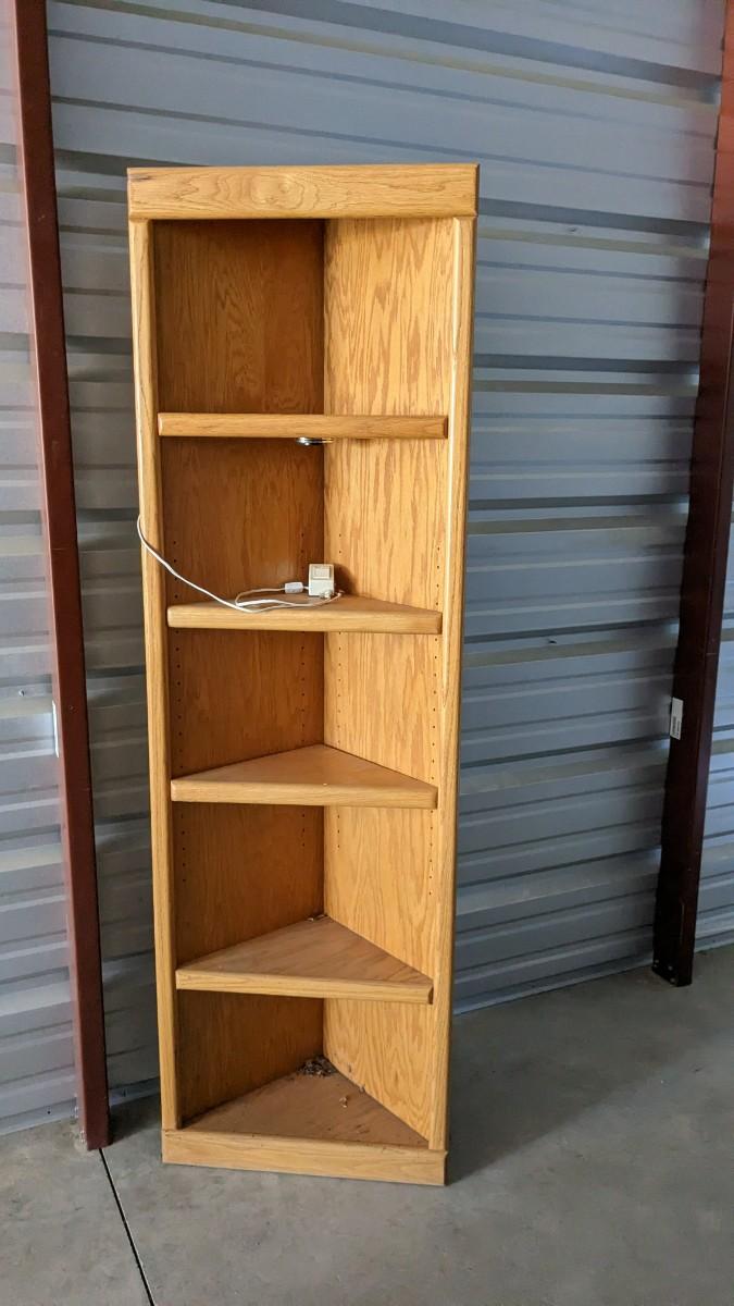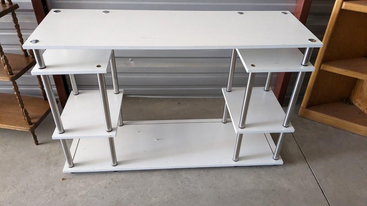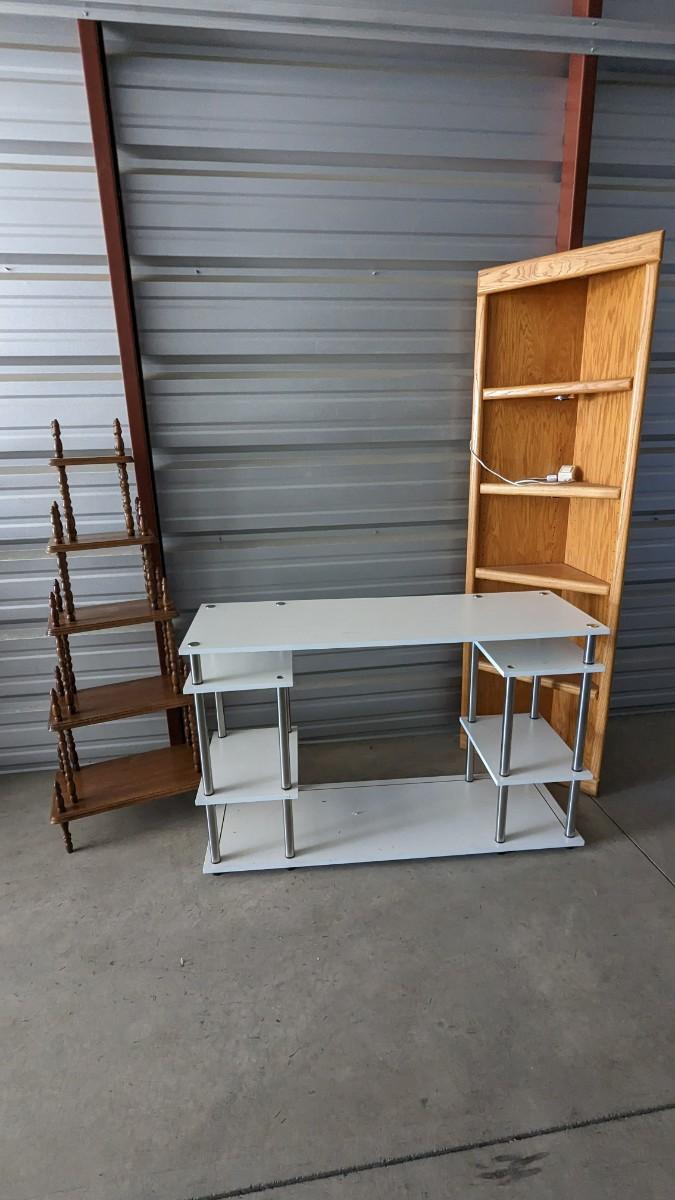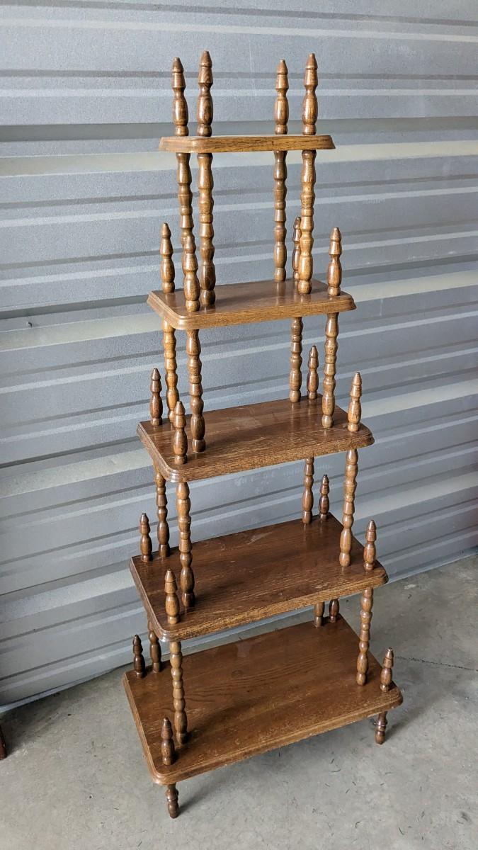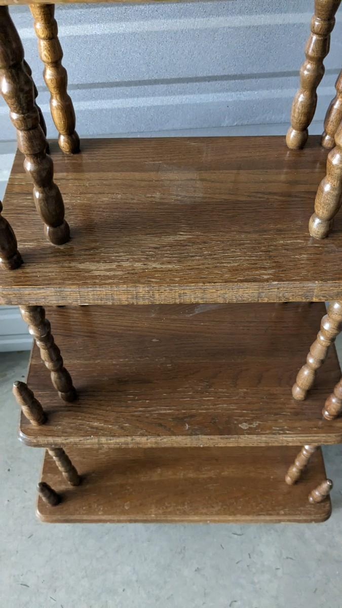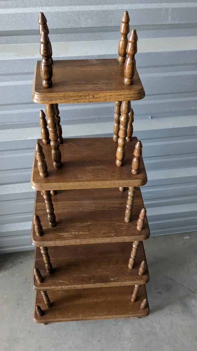3 pieces of wood shelving includes 16"x 22"x 72.25" solid wood lighted corner shelf, adjustable shelves. As well as 47.25"x15.75"x 30" white and chrome shelf. As well as beautiful multi-tier vintage shelf 22"x11.75" at largest part 10"x6.25" at smallest, 54" tall. Surface wear present on all pieces, all in good usable condition. No shipping, 2616