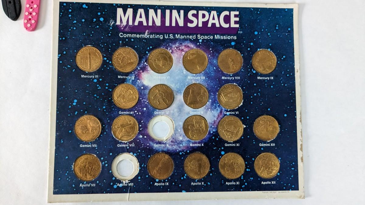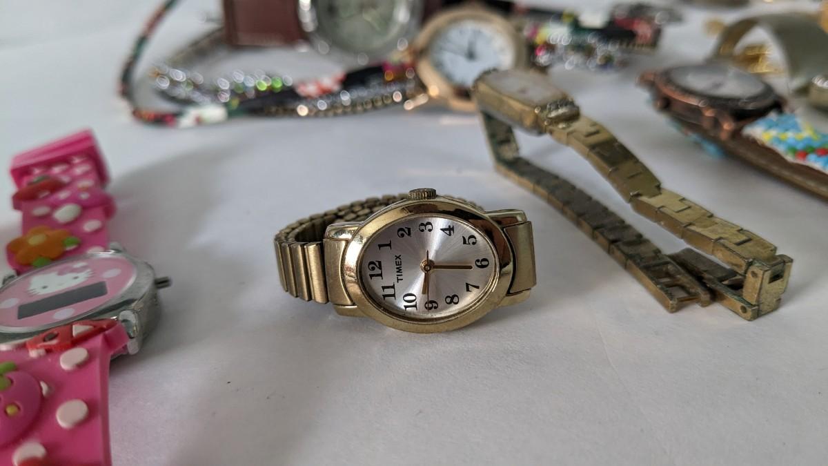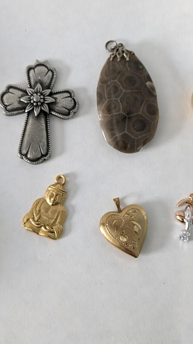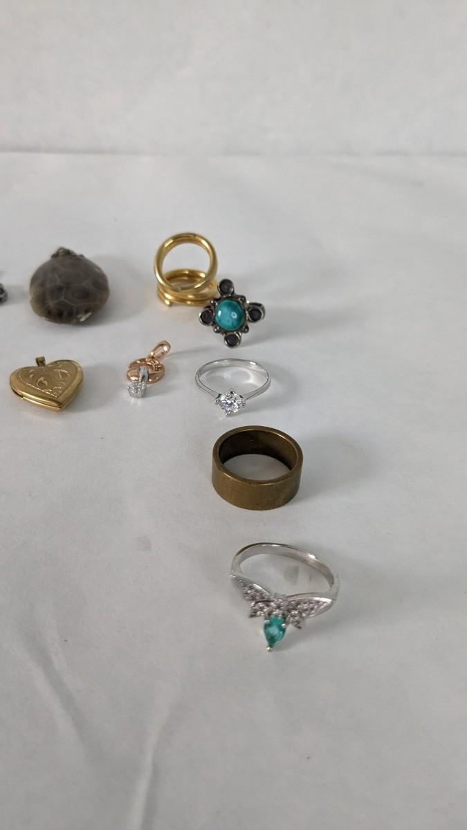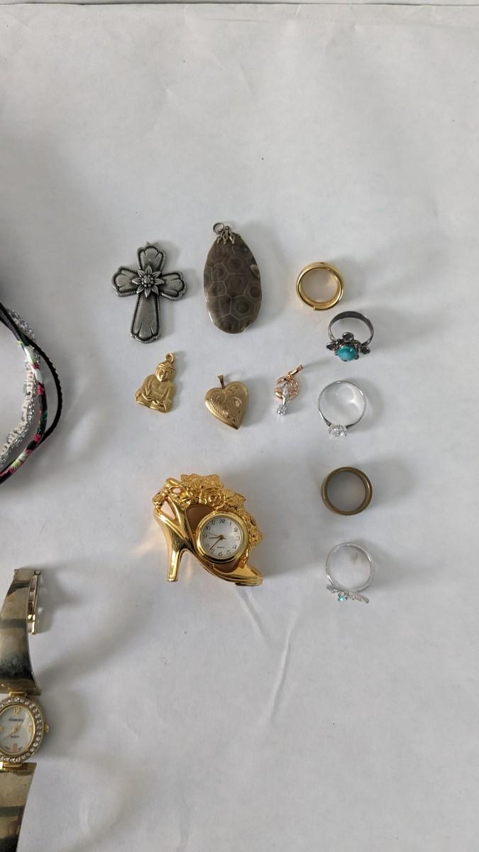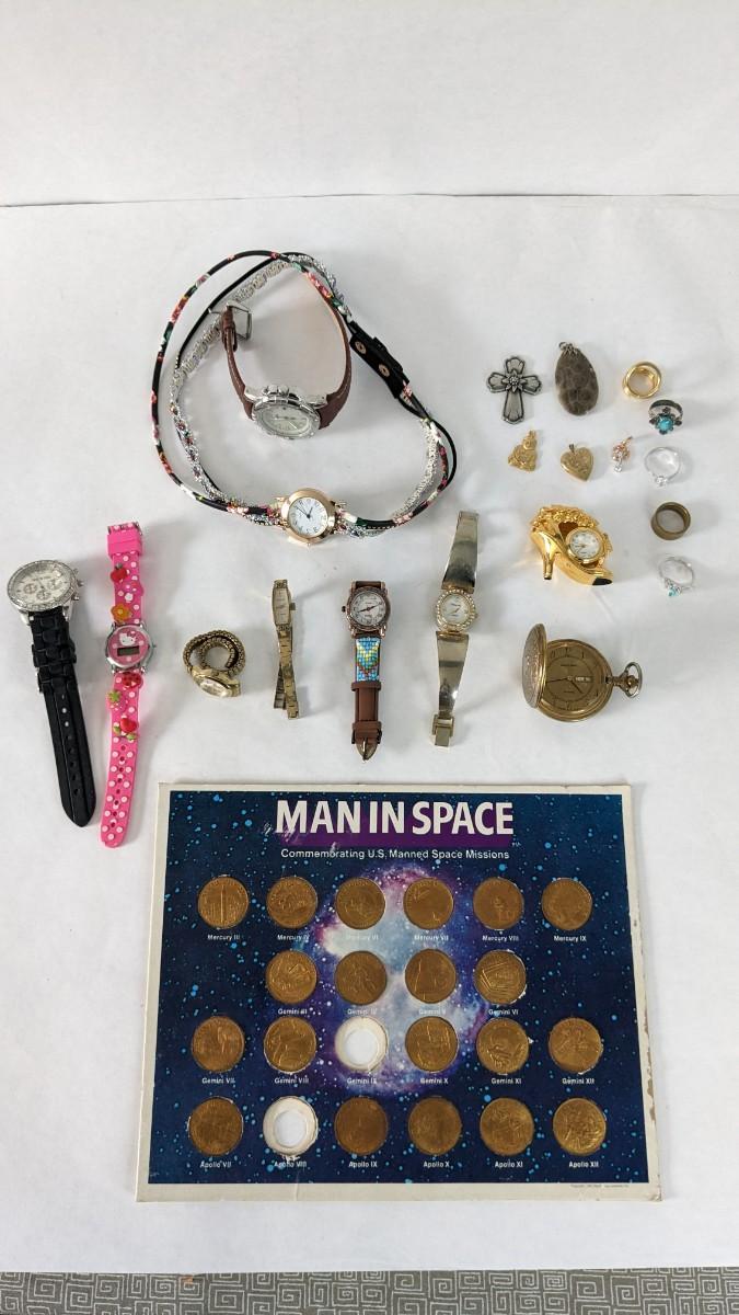 includes rings, pendants, watches, and pocket watch with no glass plate and back wont come off. Includes coin set thats missing 2 pieces. Note wear to 3 of the timepieces outside of pocket watch.