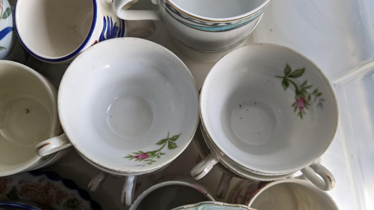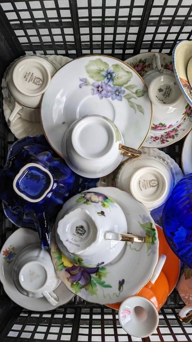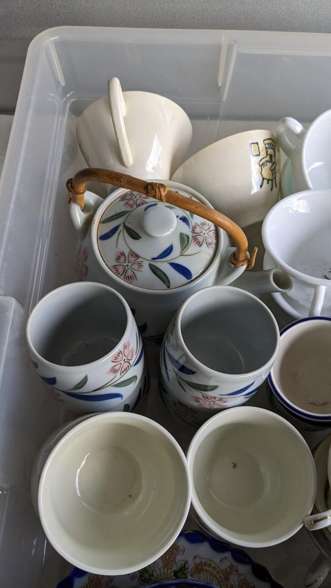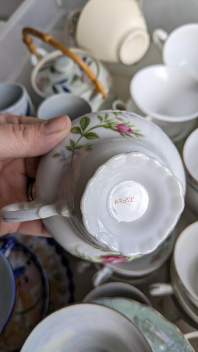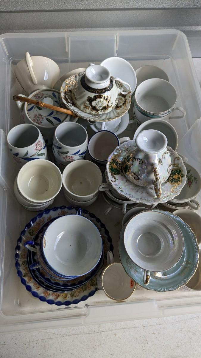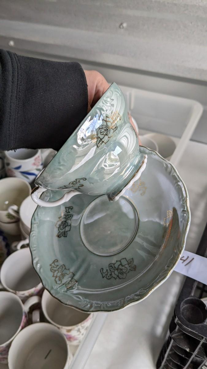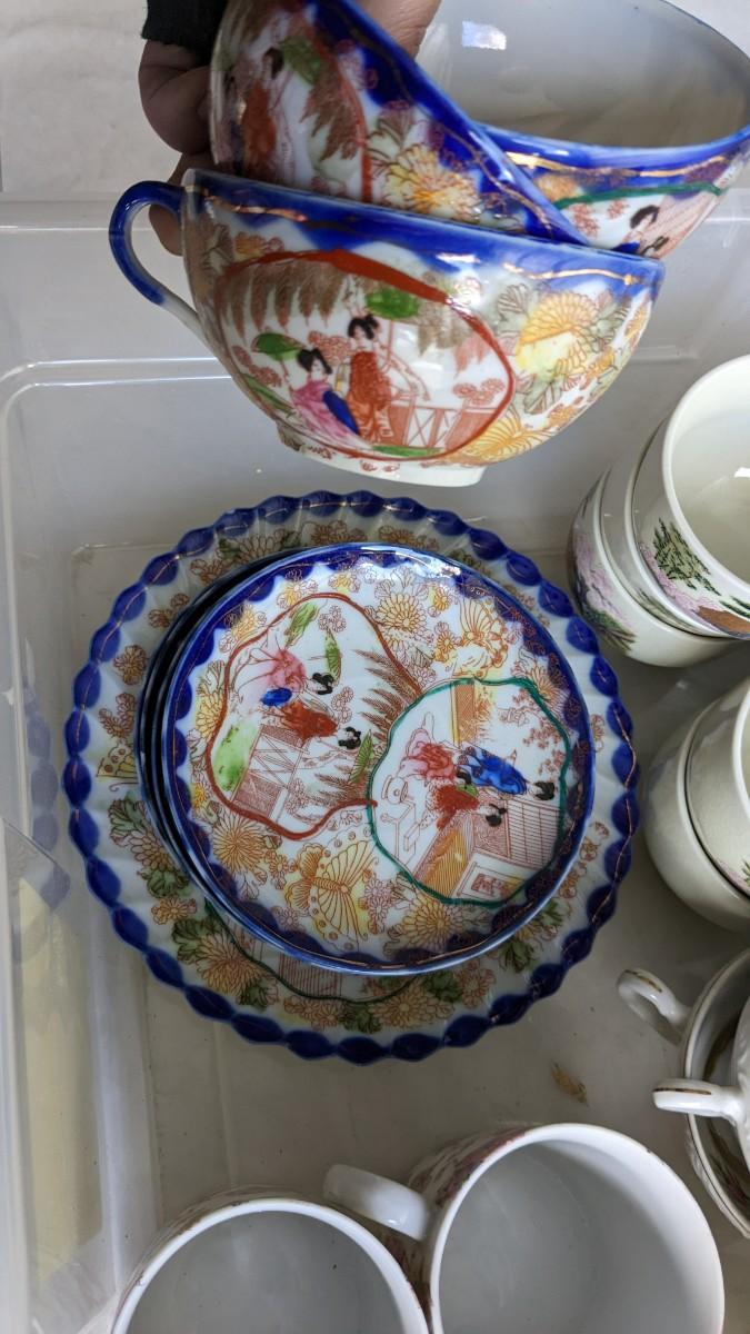 a great assortment of mated tea cups and saucers. includes beautiful asian tea set. No shipping. 2604
