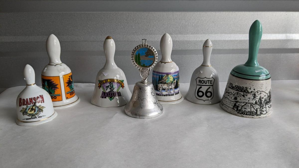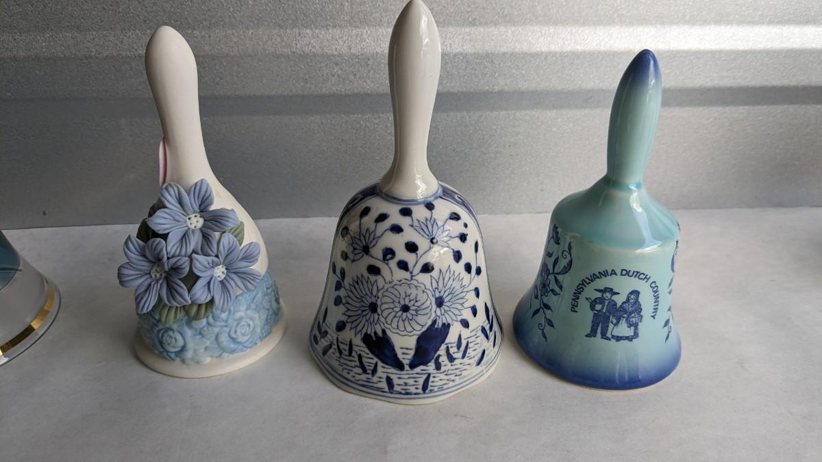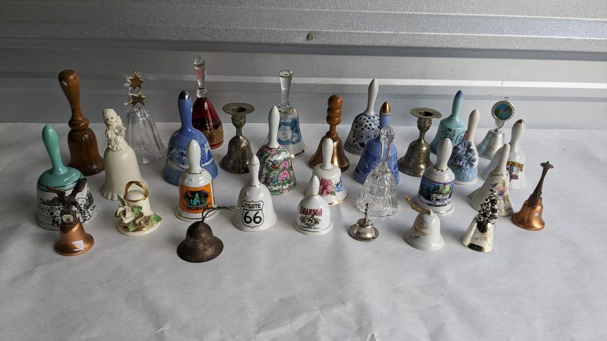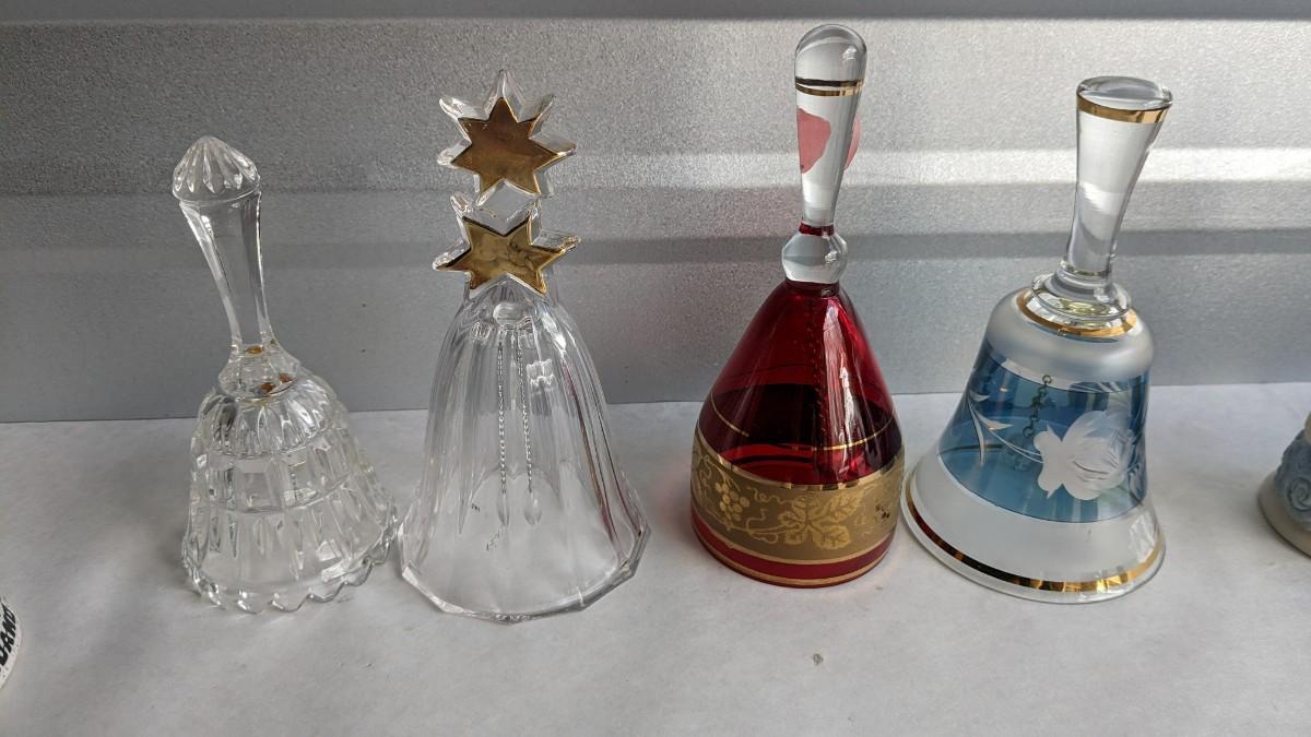 a beautiful collection of varied decade bells. Crystal, ceramic, glass, and silverplate! No shipping. 2604