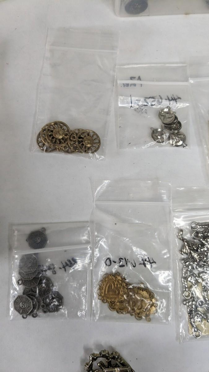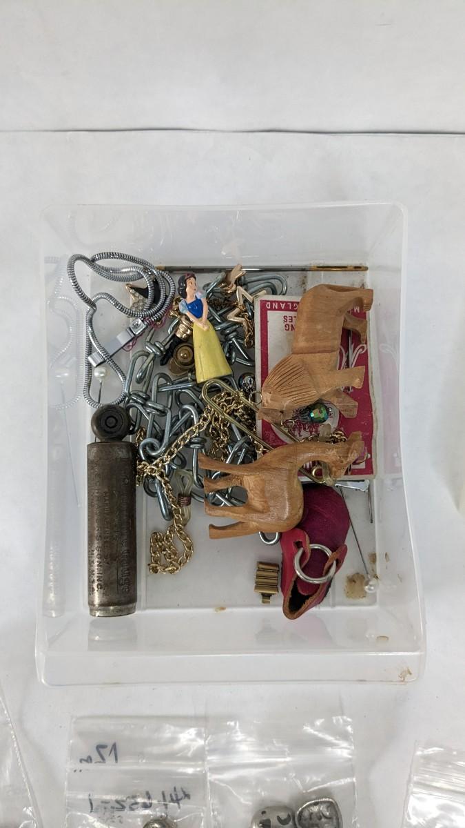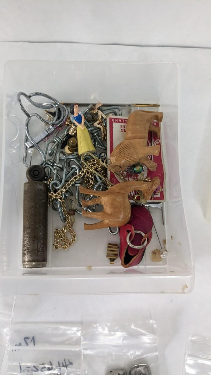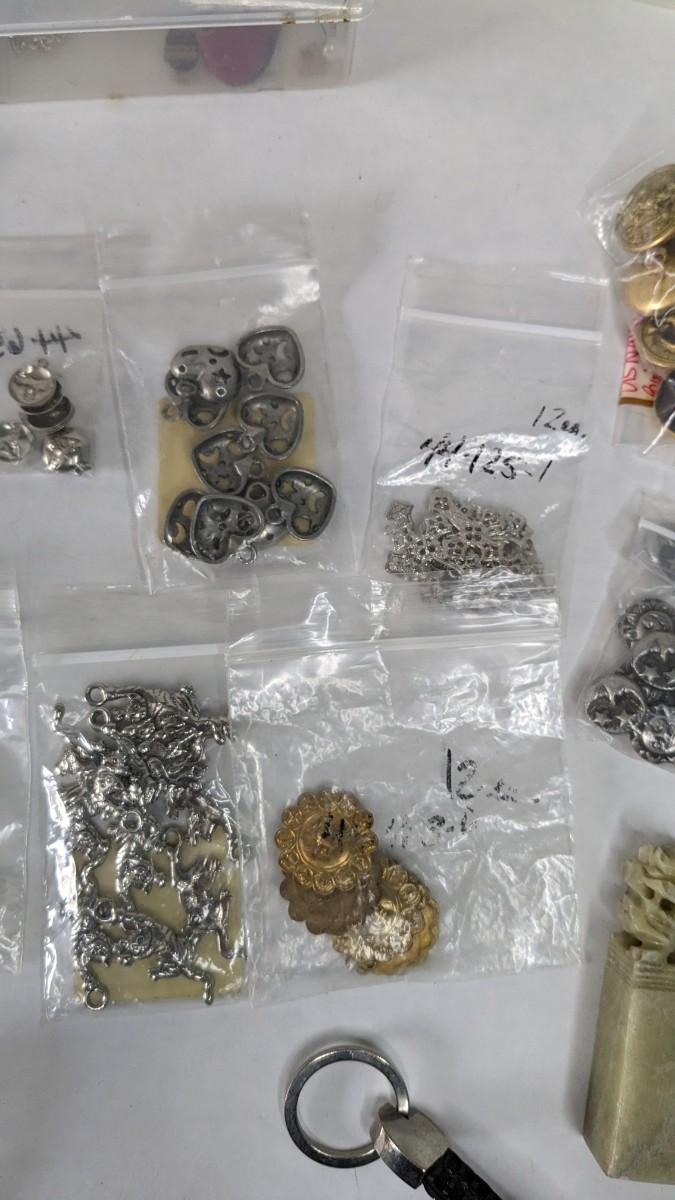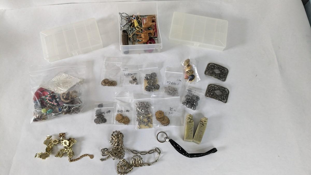 mismatched earrings, smalls, lots of metal beads/charms still in bag, WWII buttons, 2 small plastic divider containers, and more! 2604