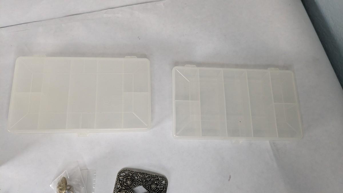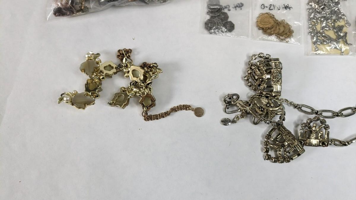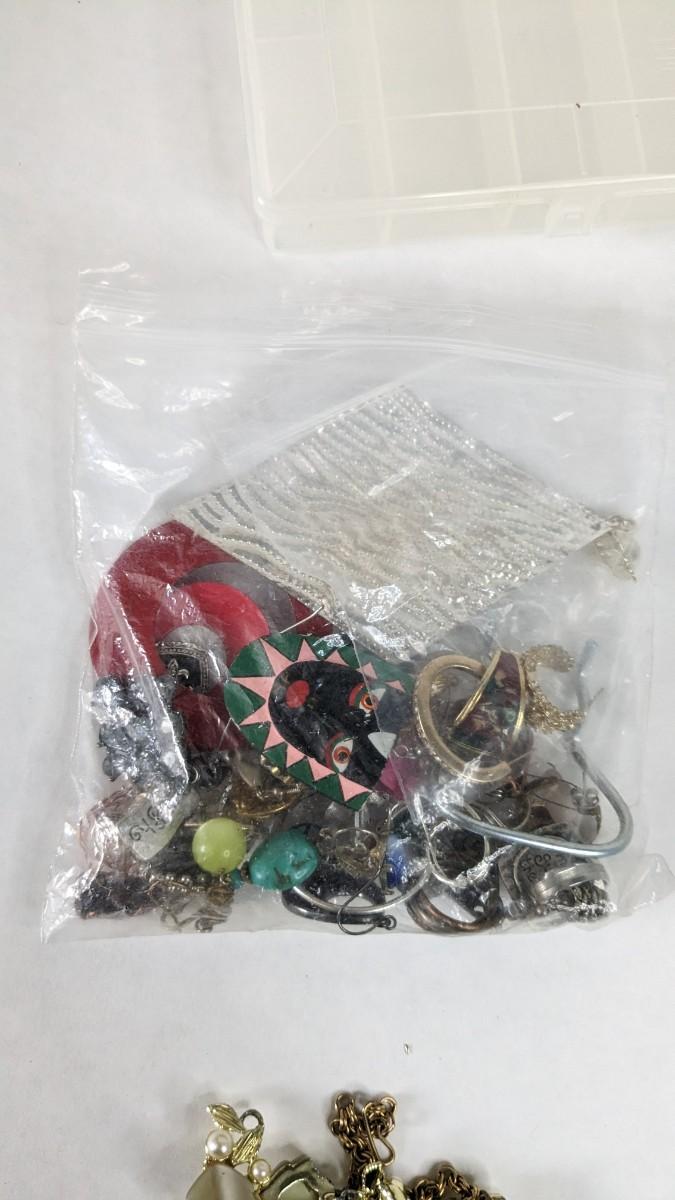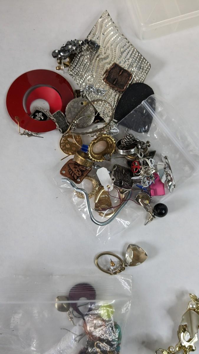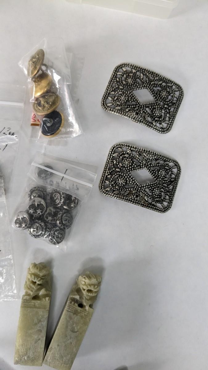 mismatched earrings, smalls, lots of metal beads/charms still in bag, WWII buttons, 2 small plastic divider containers, and more! 2604