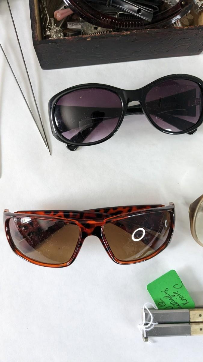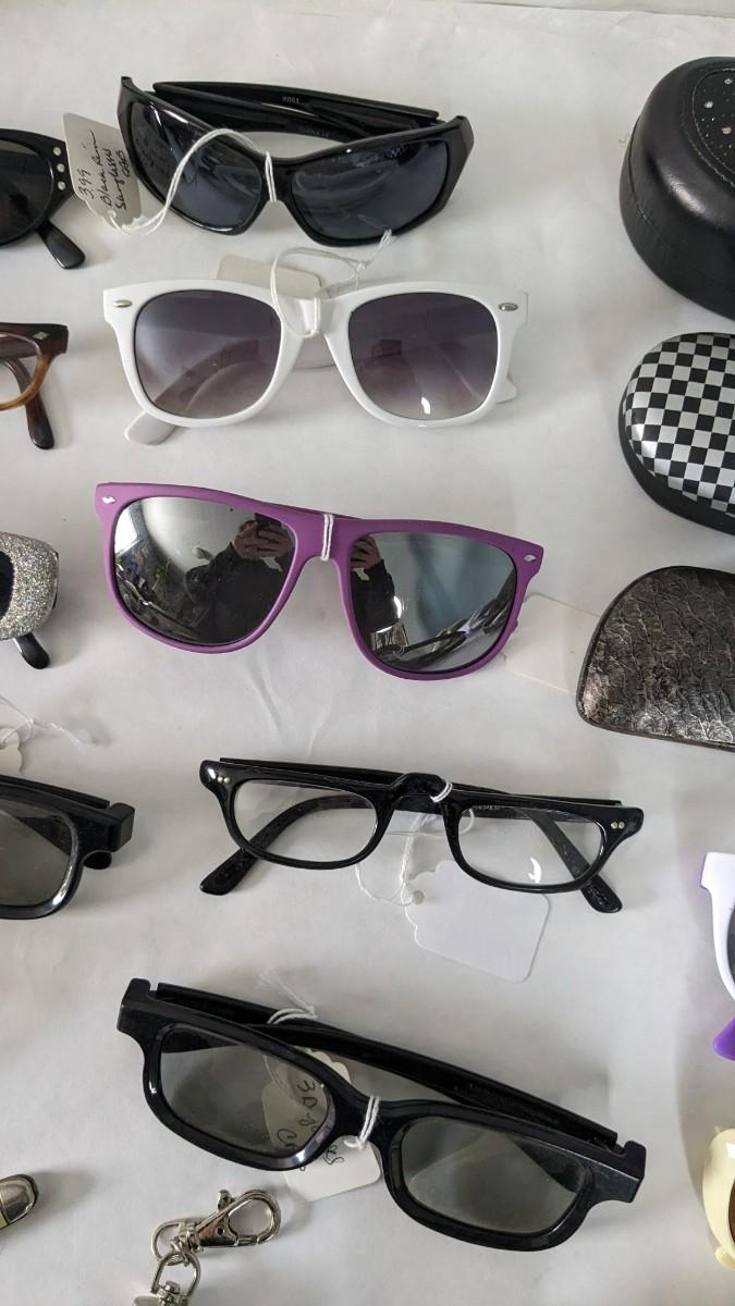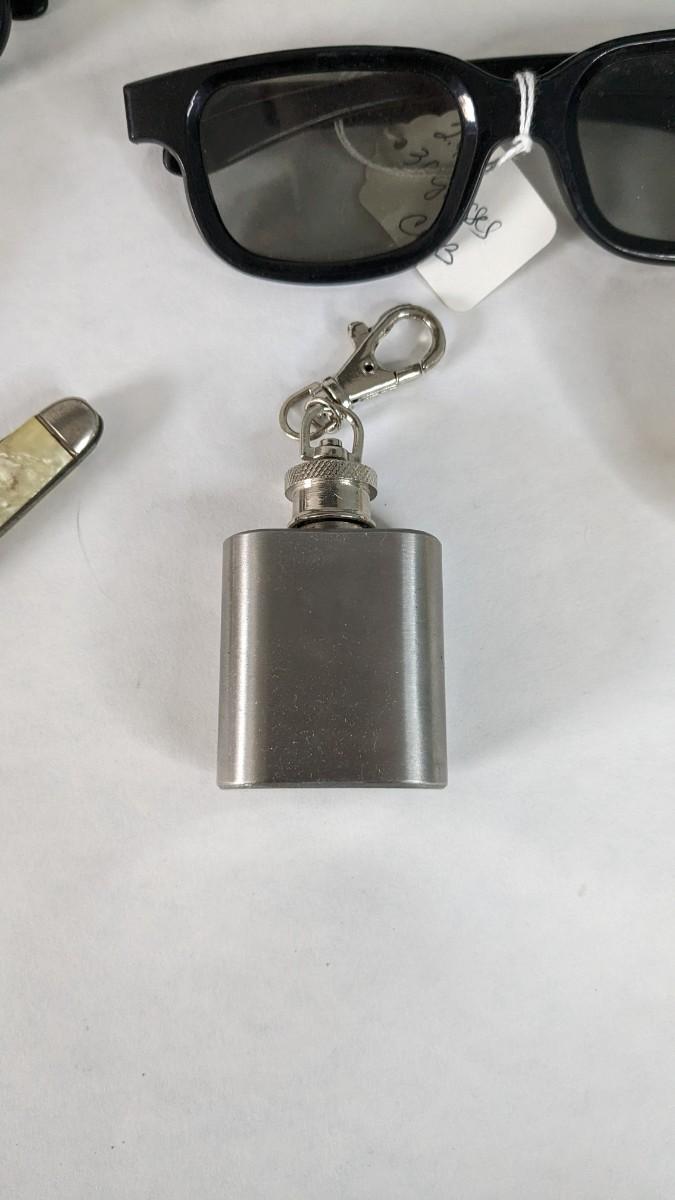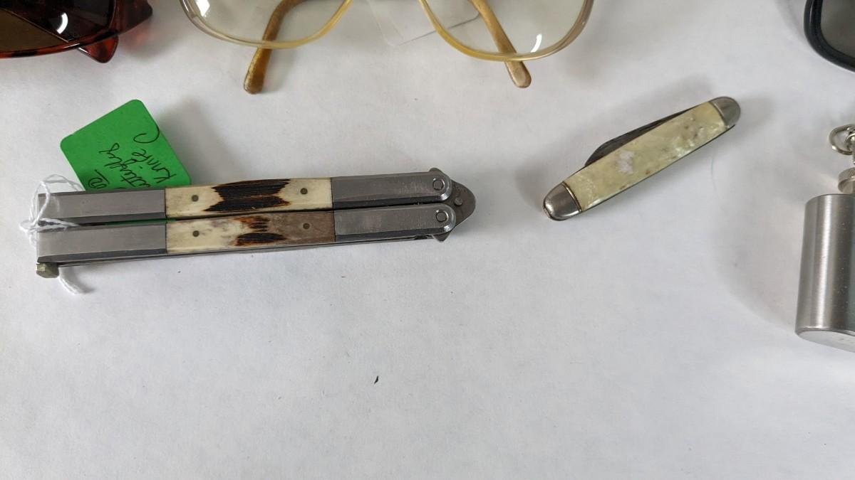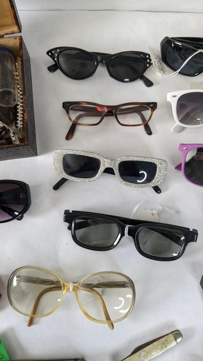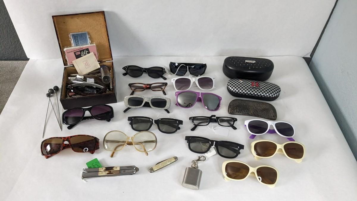 mix of contemporary and vintage glasses/sunglasses, cases, mini flask, and pocket knives.