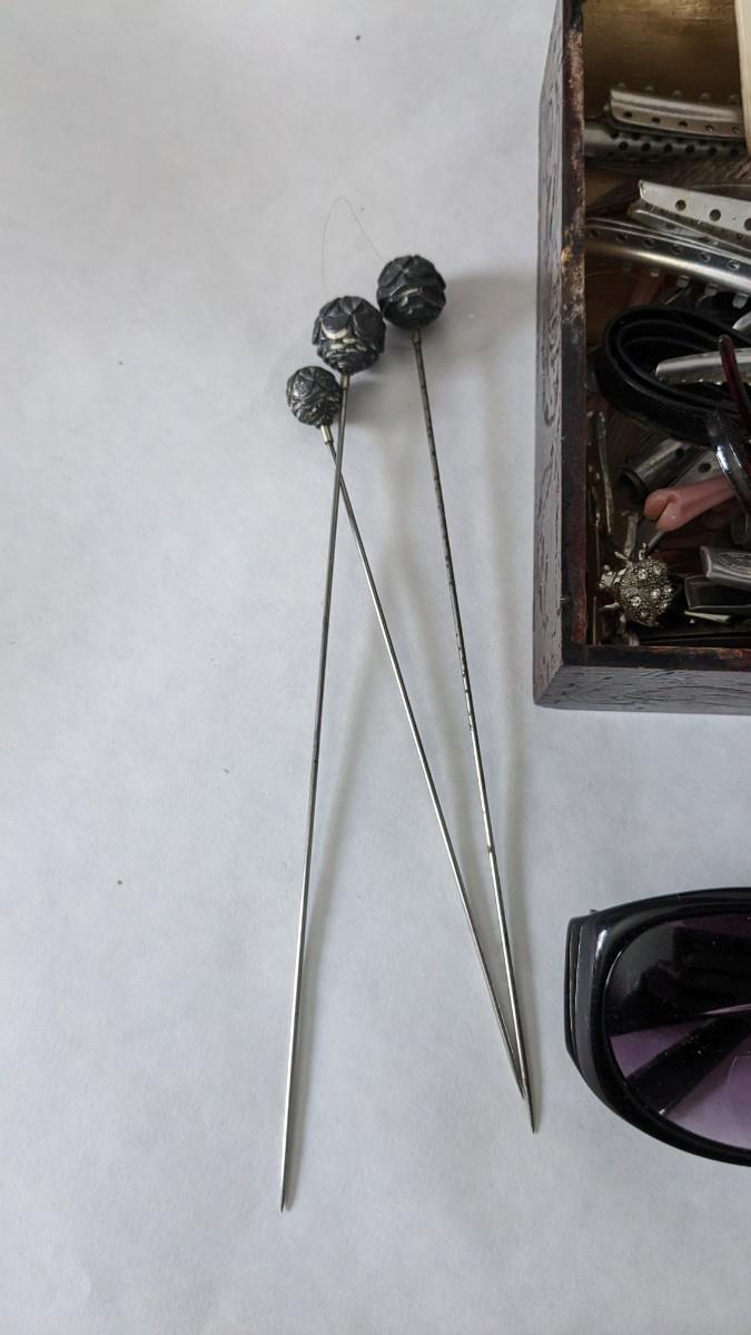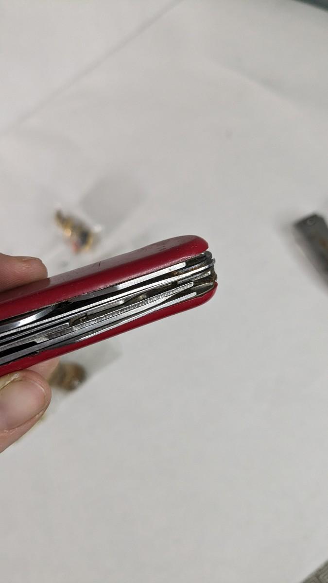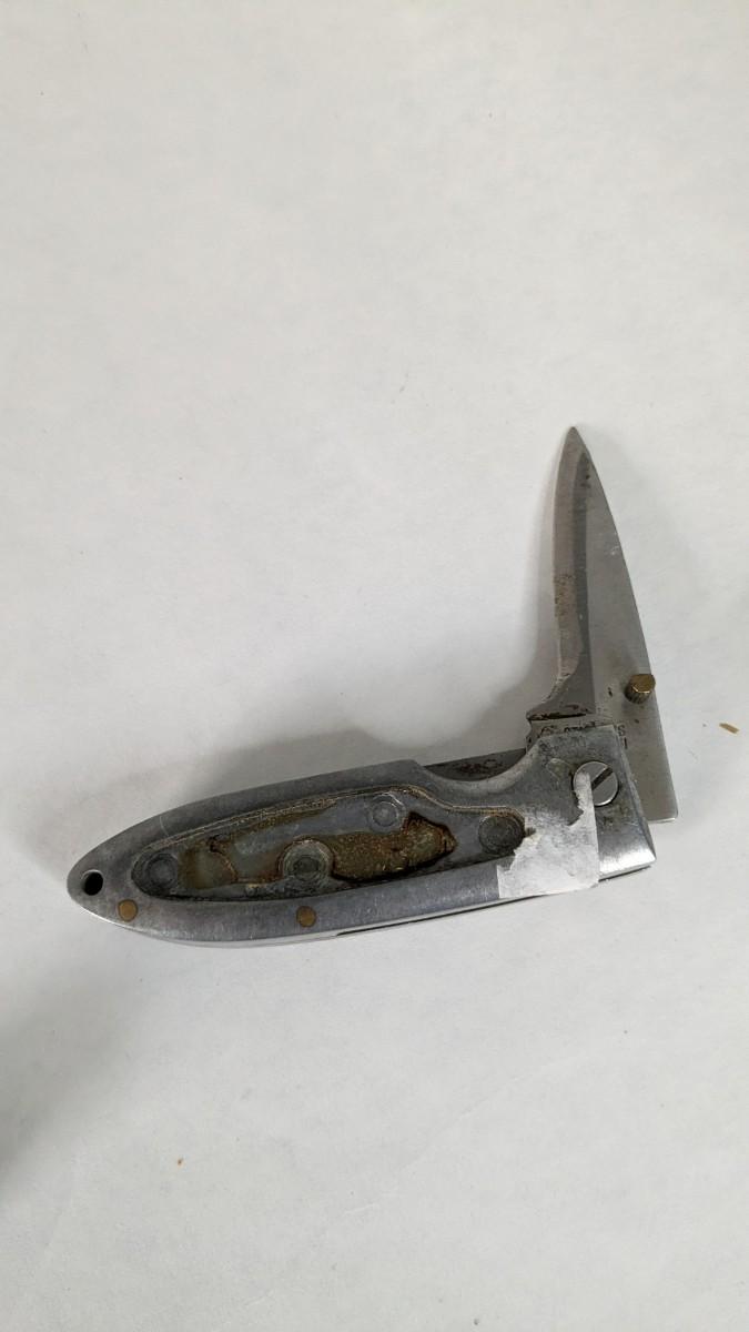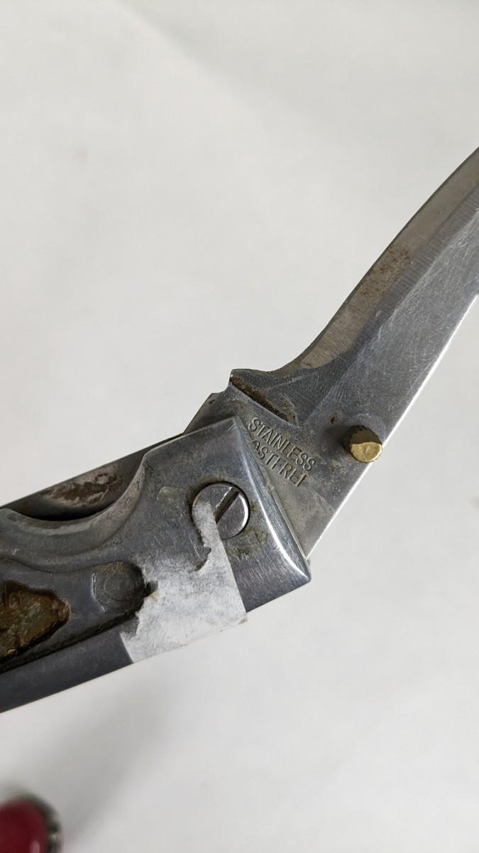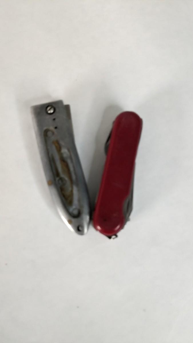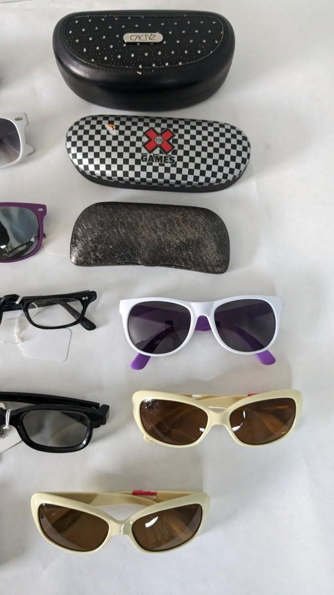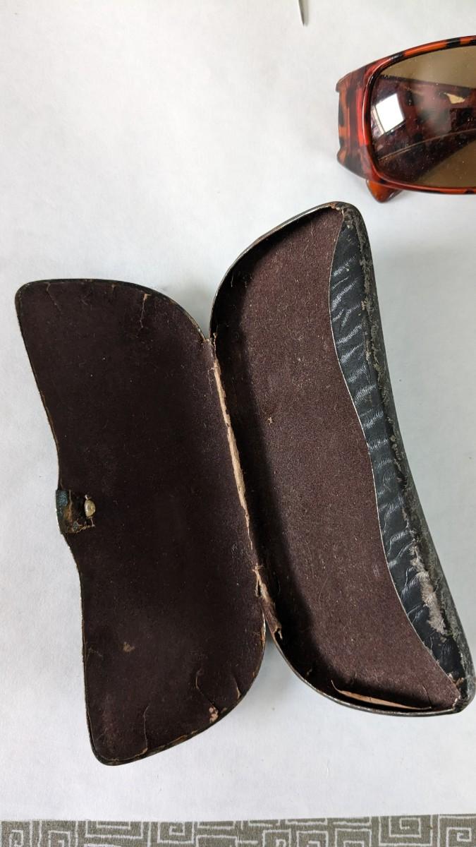 mix of contemporary and vintage glasses/sunglasses, cases, mini flask, and pocket knives.
