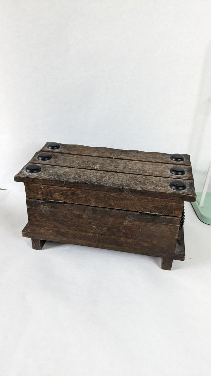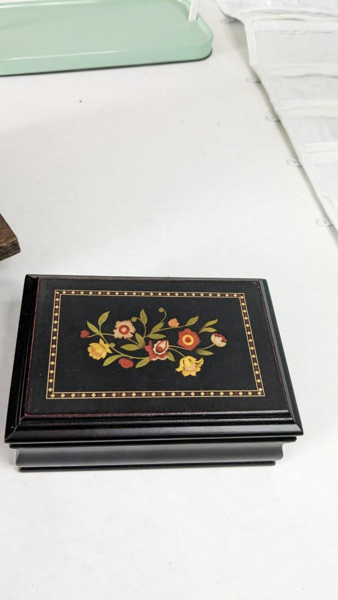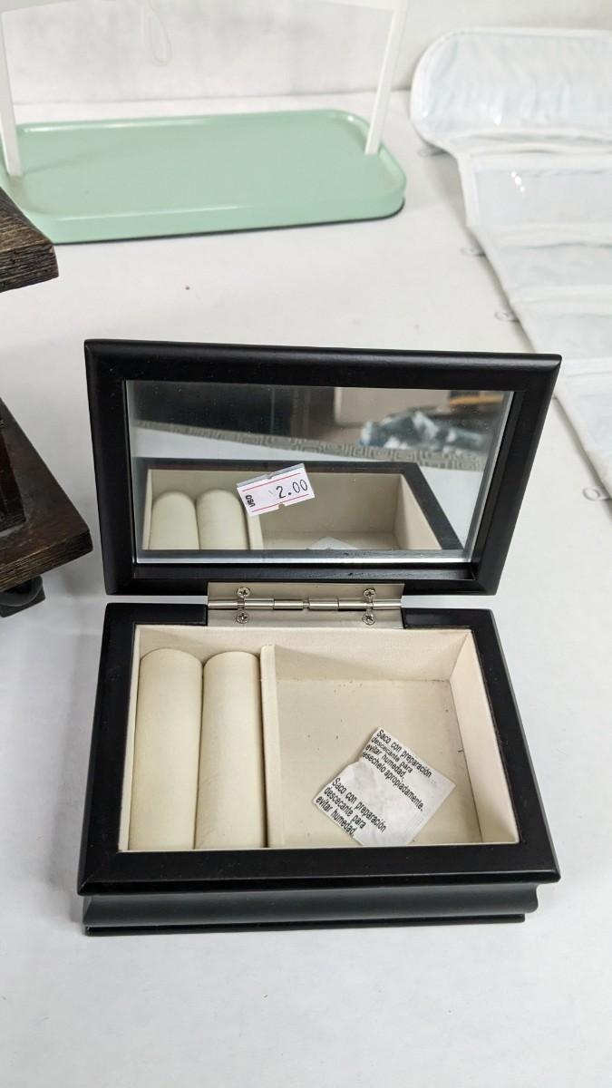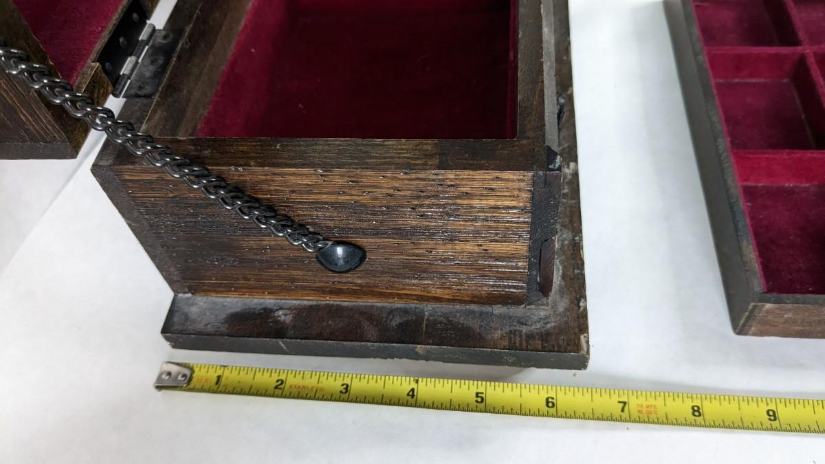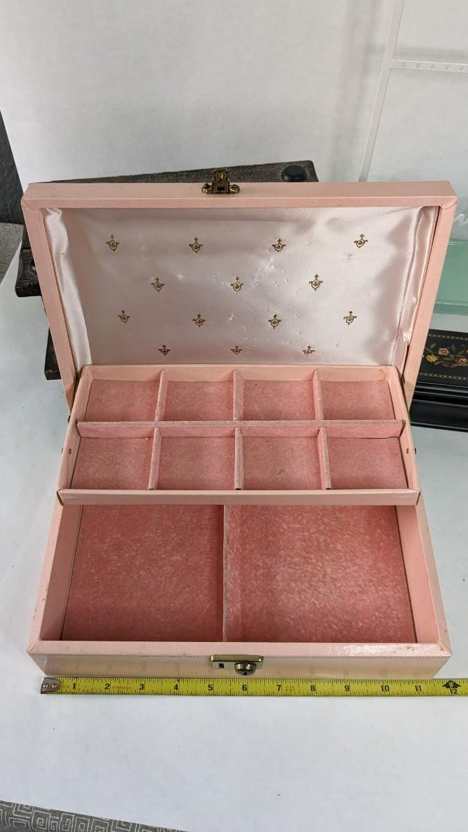2 vintage jewelry boxes. Wood one is a music box but doesn't work fully. Other pieces in good used condition. 2604