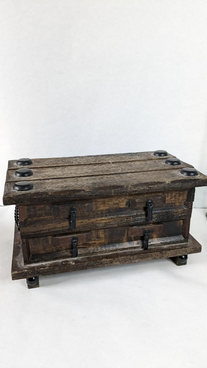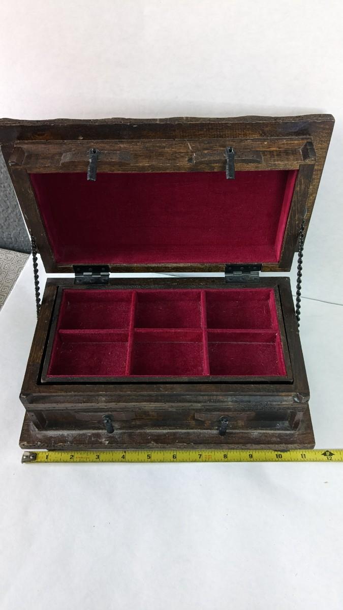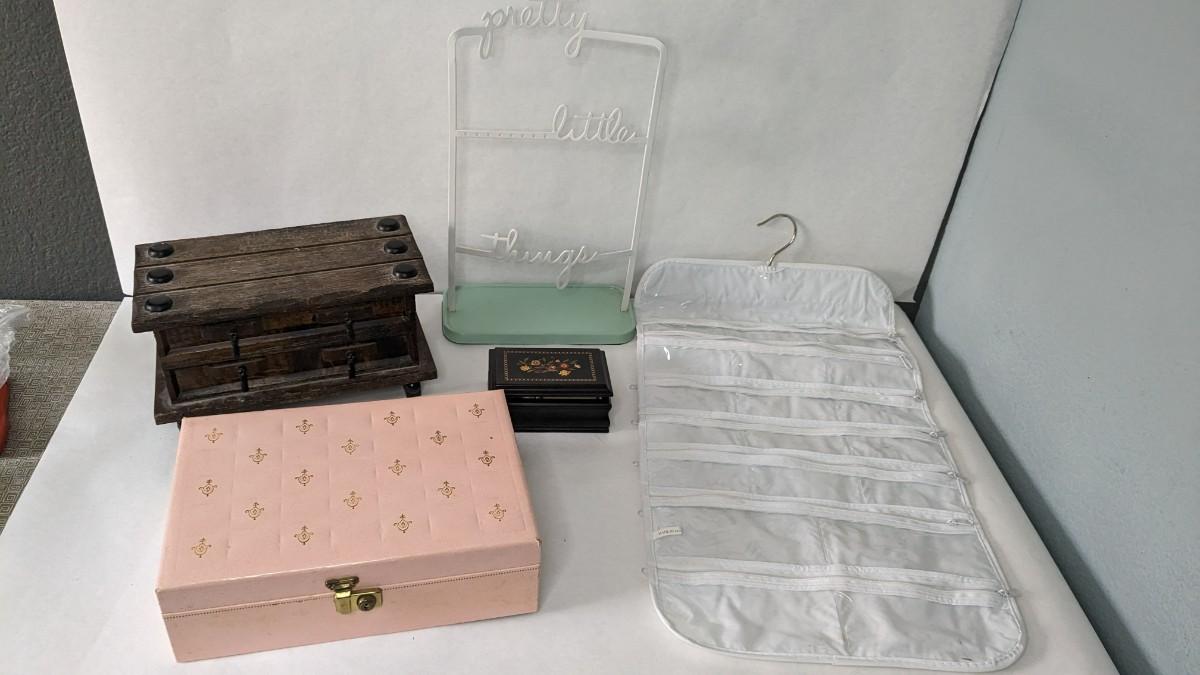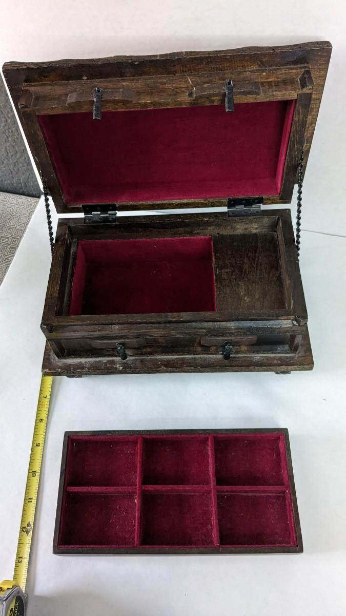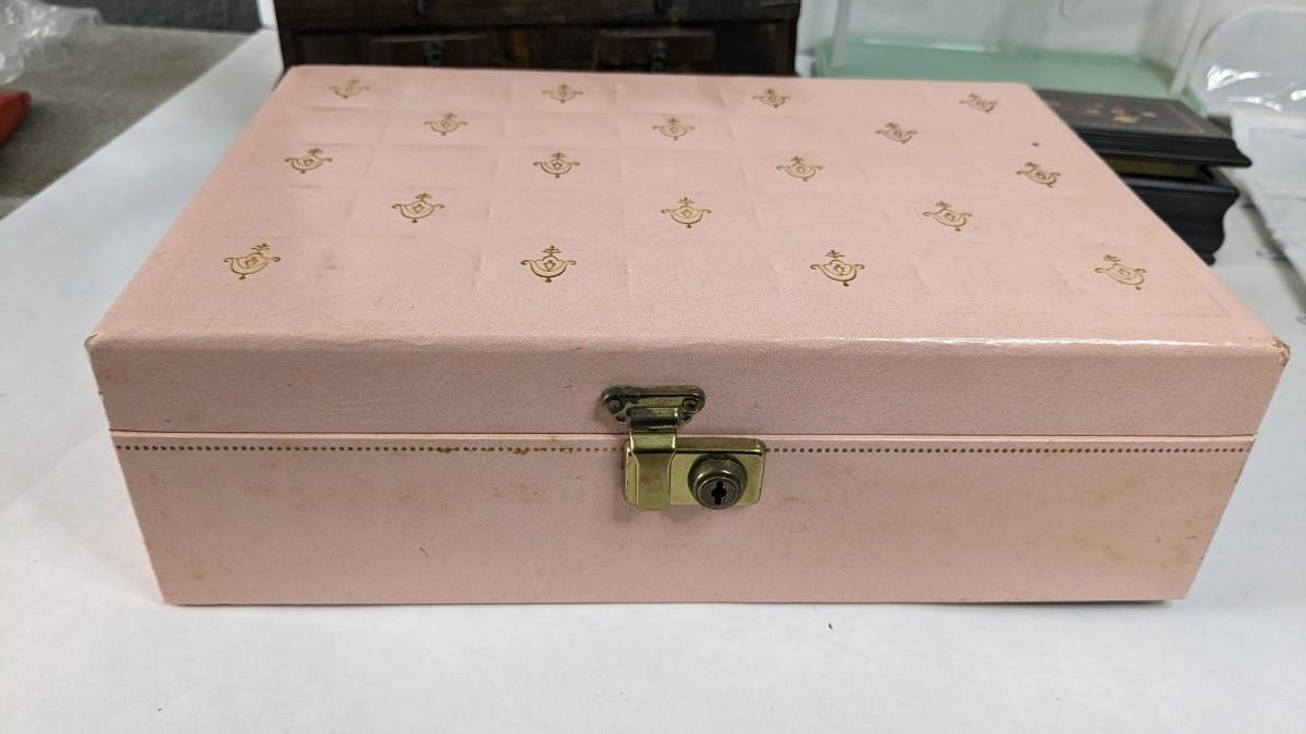 2 vintage jewelry boxes. Wood one is a music box but doesn't work fully. Other pieces in good used condition. 2604