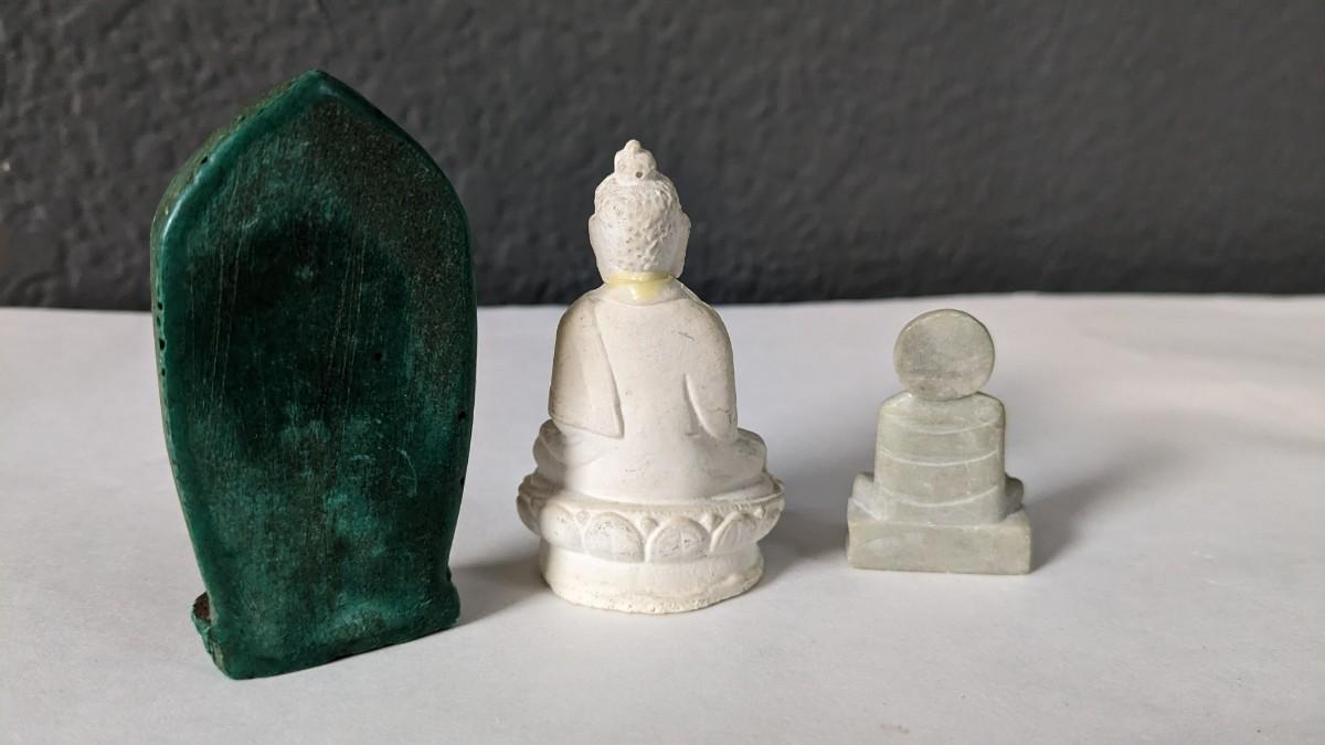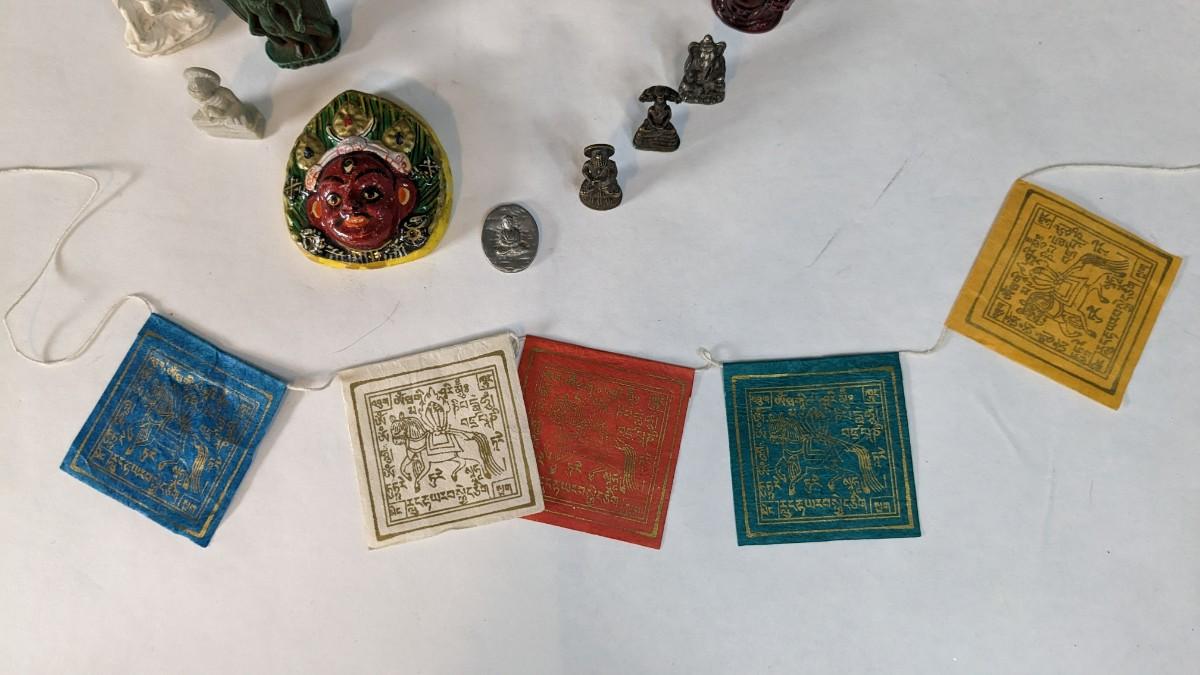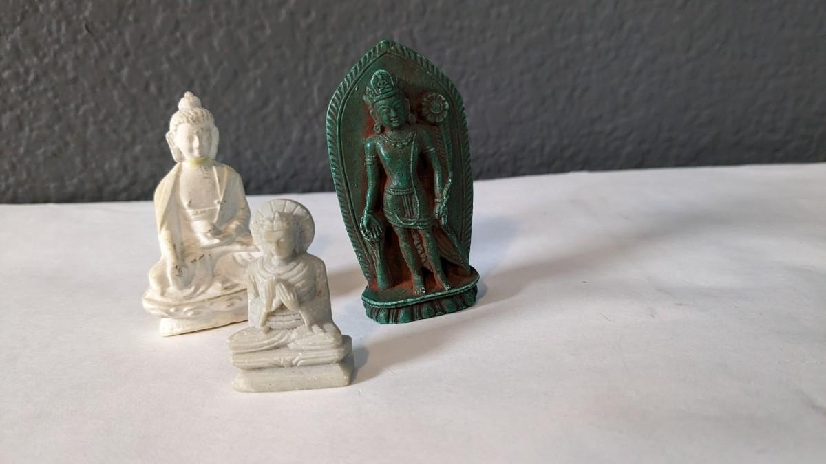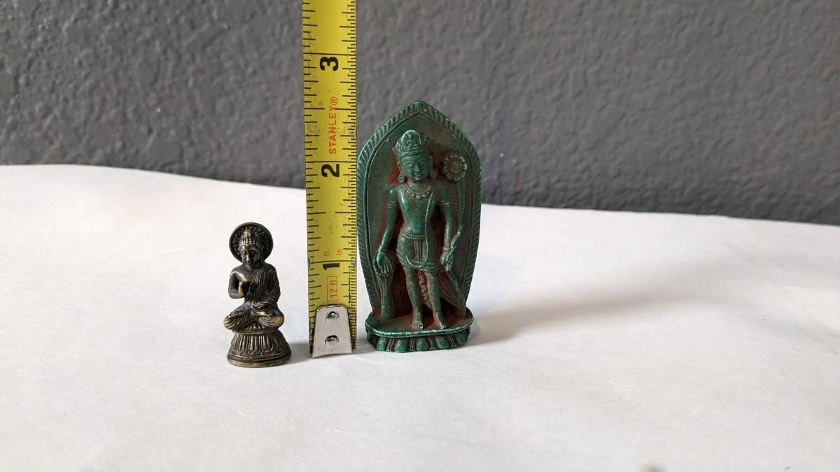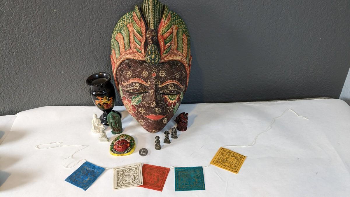 a lovely array of beautiful Hindi and Buddhist items. Includes stunning handcarved pieces, metal dieties, wood Indonesian mask, wood vase, and more! Note one Buddha has had a repair and mask has a light scuff on chin, the rest is in great shape.