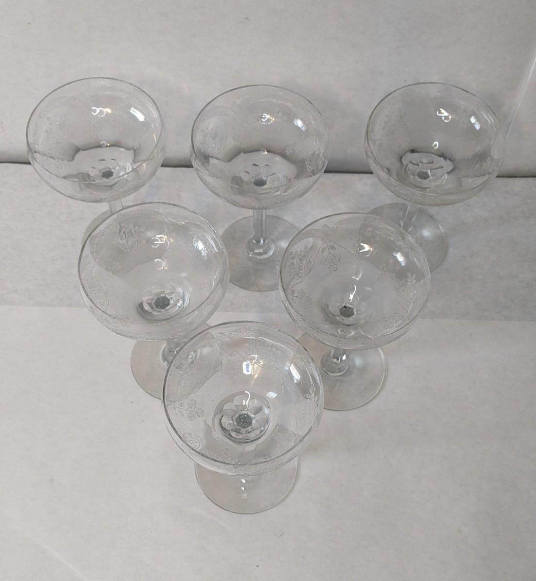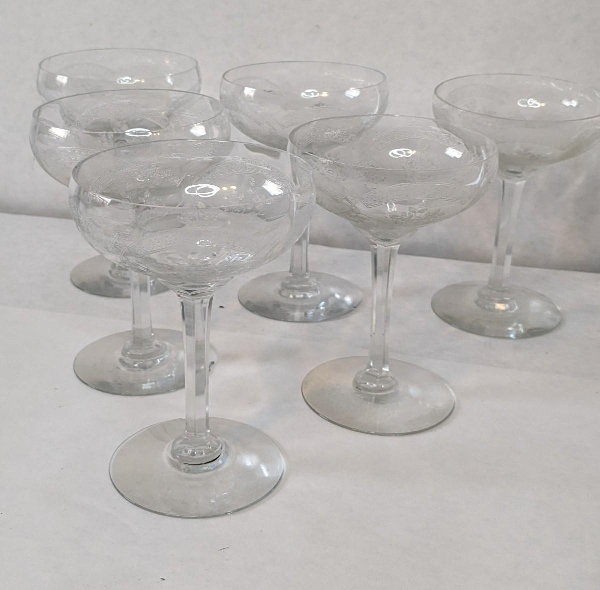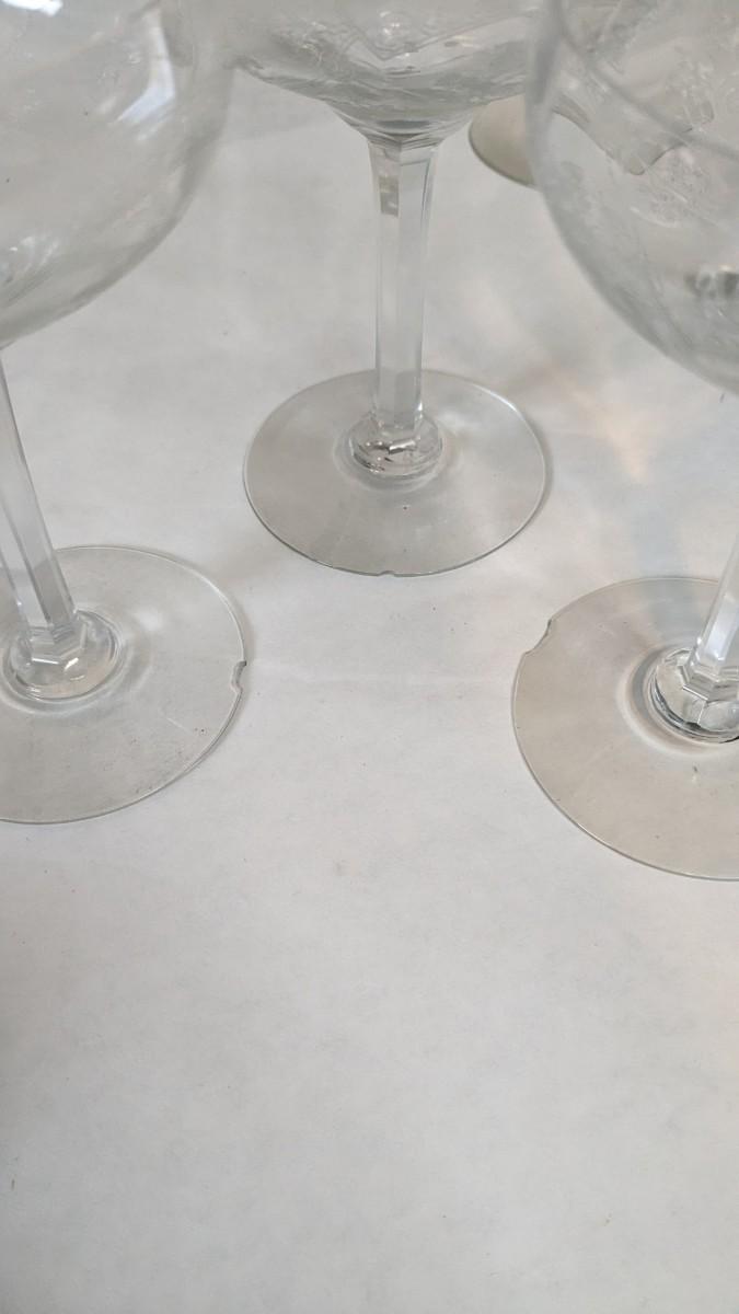 6 matching etched glasses. 3 have bases with chips, in otherwise great condition. Extra handling fees will apply.