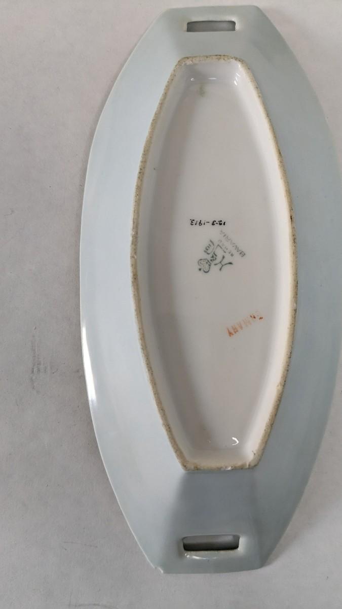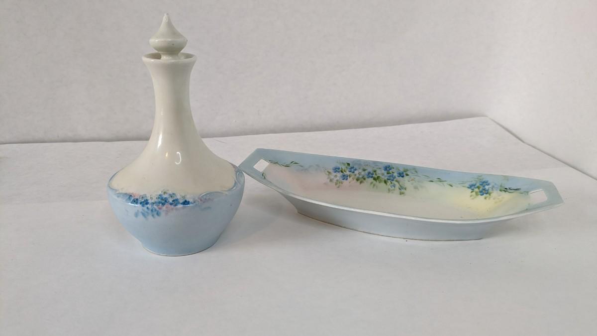 a beautiful display for the vanity. A lovely Limoges marked perfume decanter and 1913 Germany marked tray. Please note tray has small chip in one corner. Entire lot is in otherwise great condition.