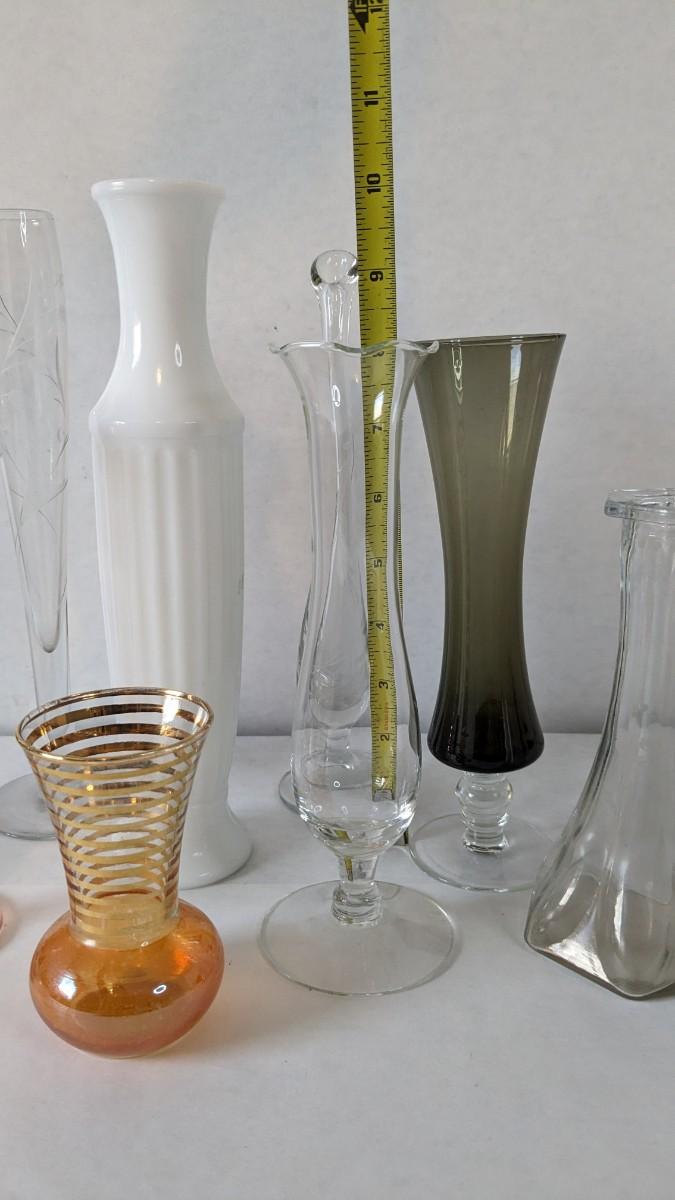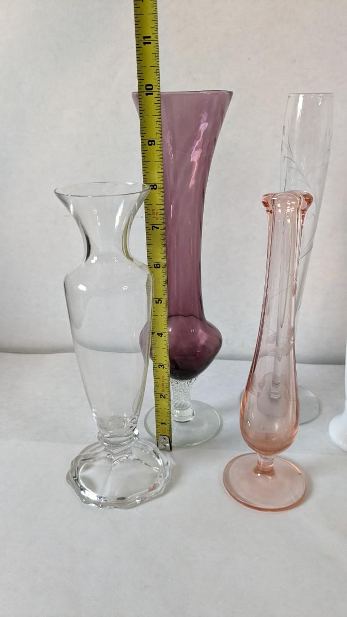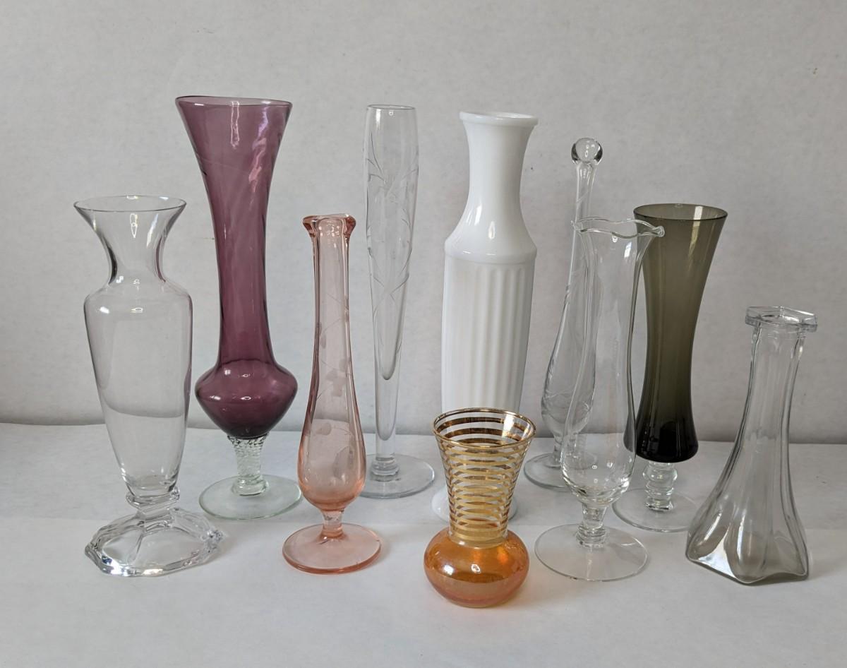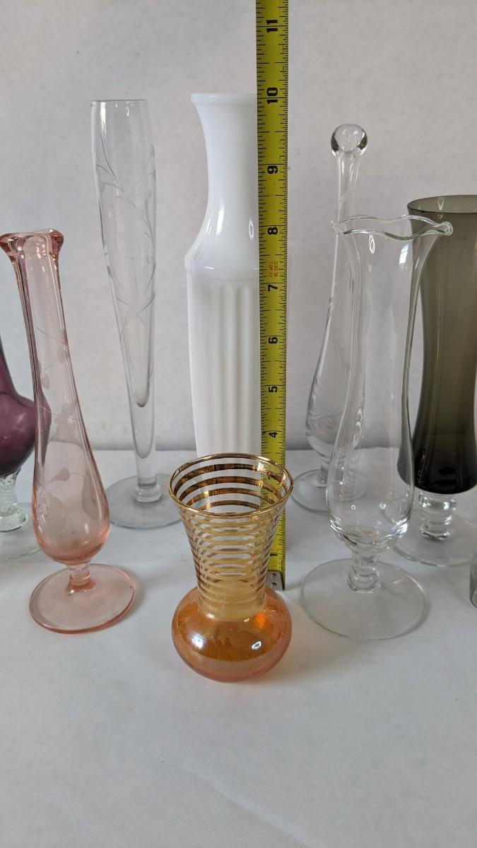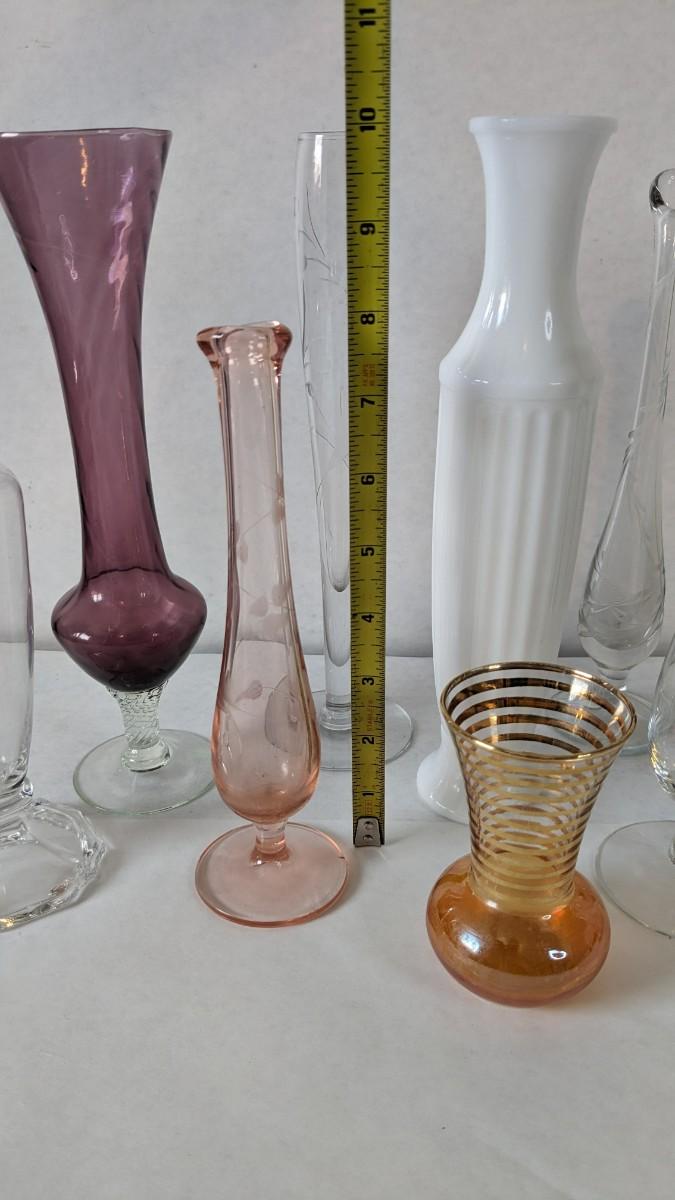 a beautiful display of decorative bud and single stem vases. Includes 2 etched swung vase pieces, clear glass, colored glass, and more! No shipping