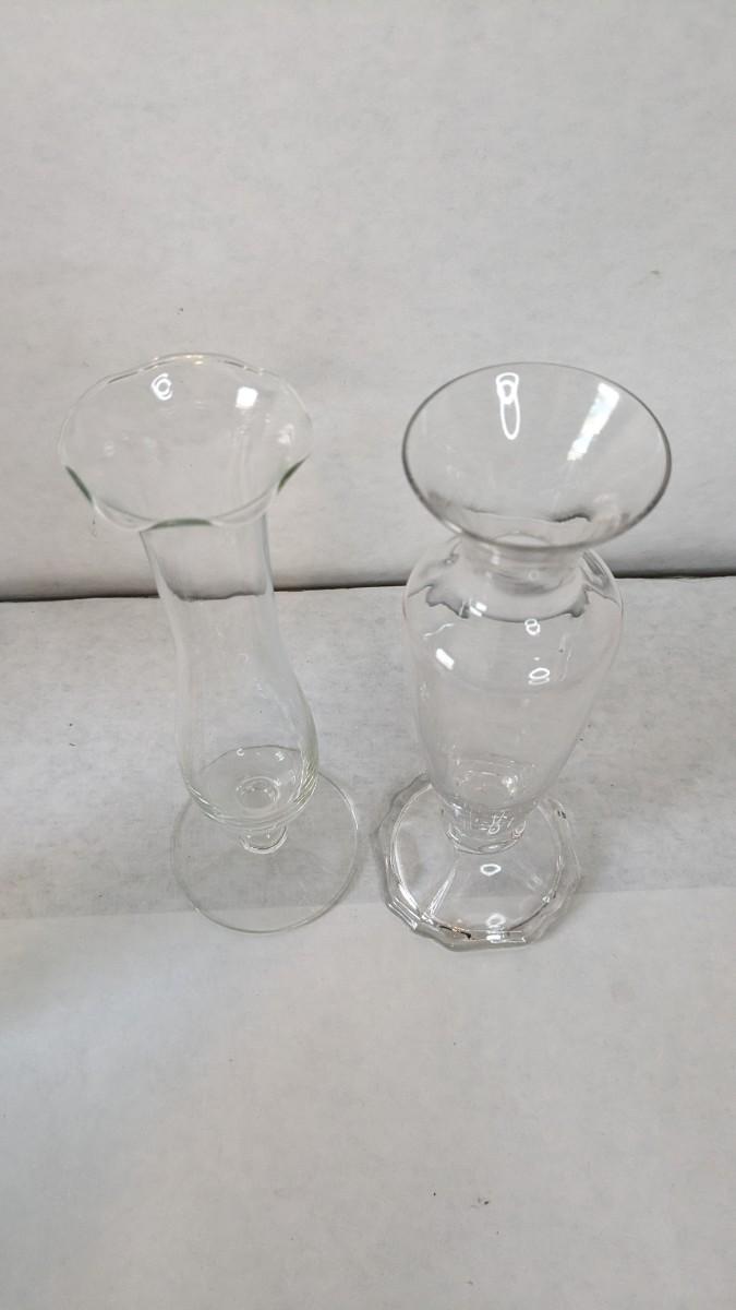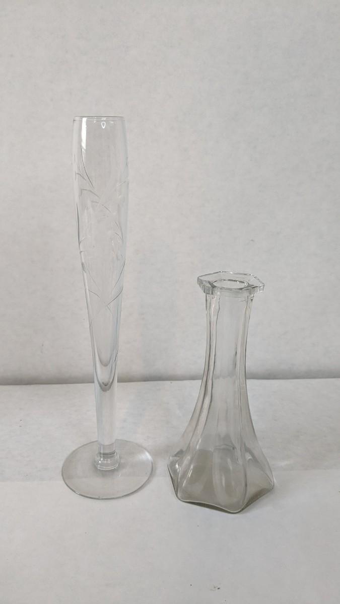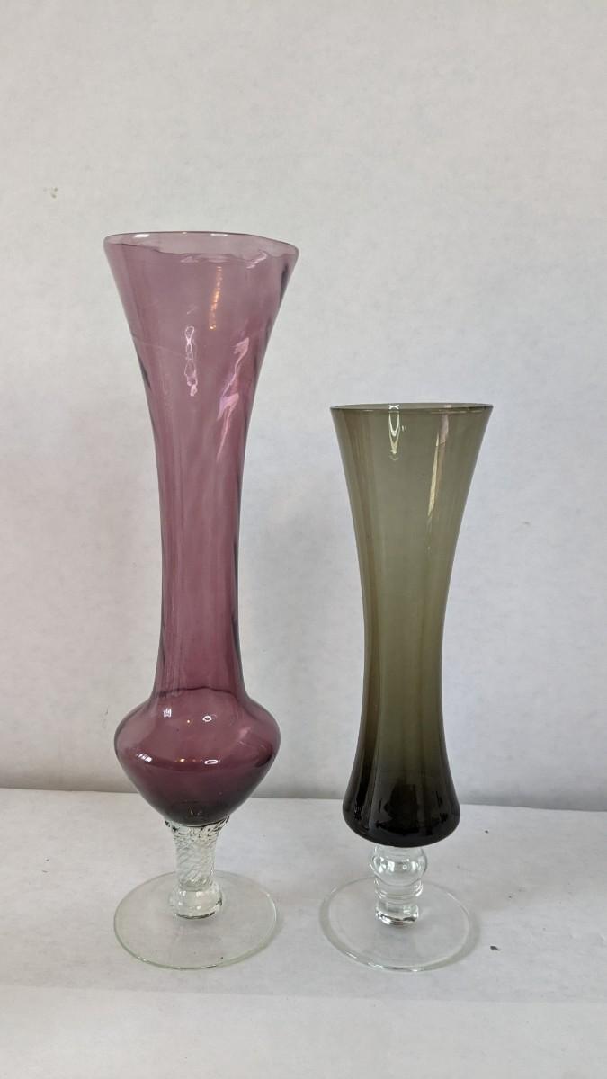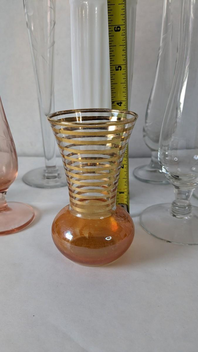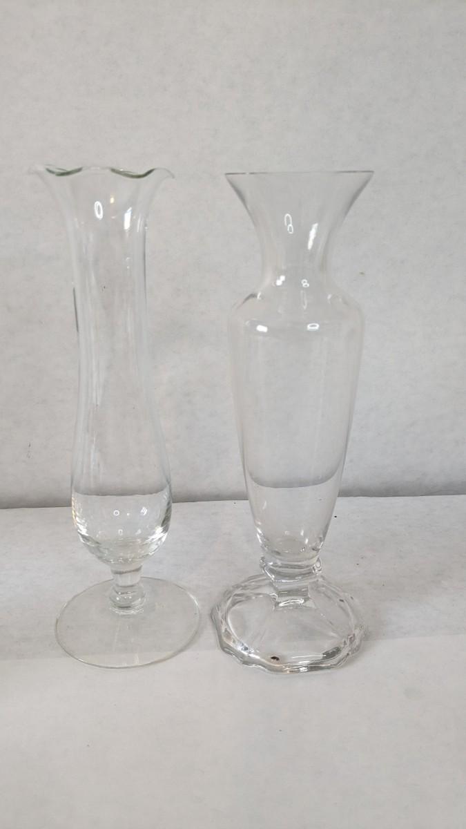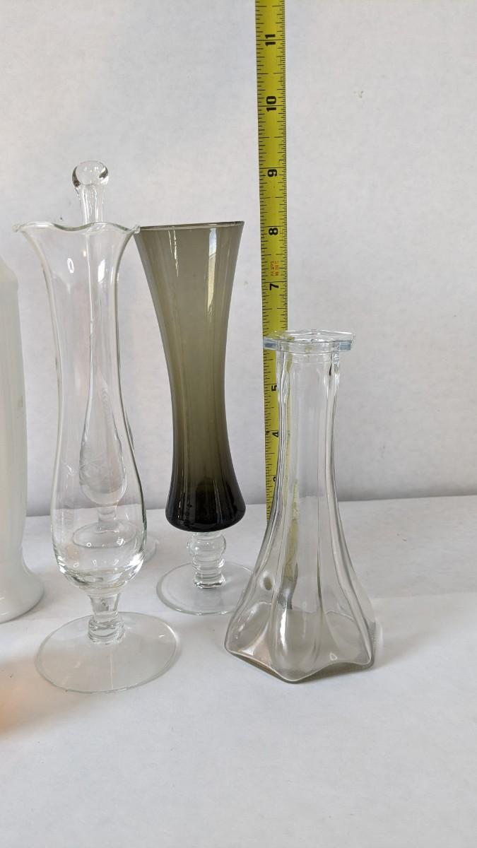 a beautiful display of decorative bud and single stem vases. Includes 2 etched swung vase pieces, clear glass, colored glass, and more! No shipping