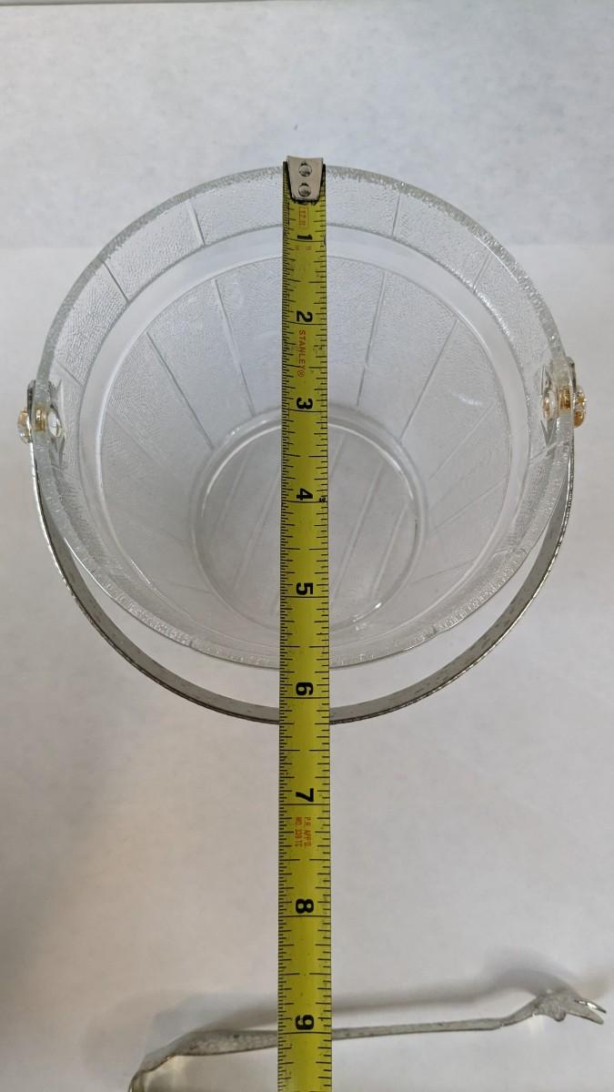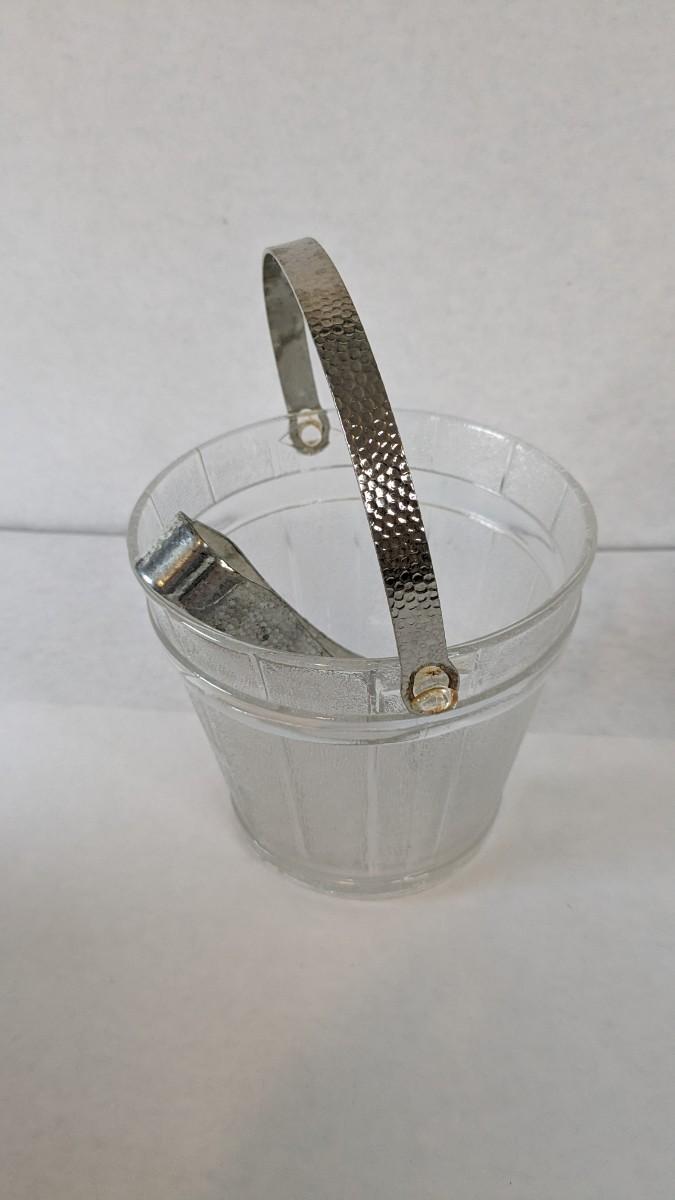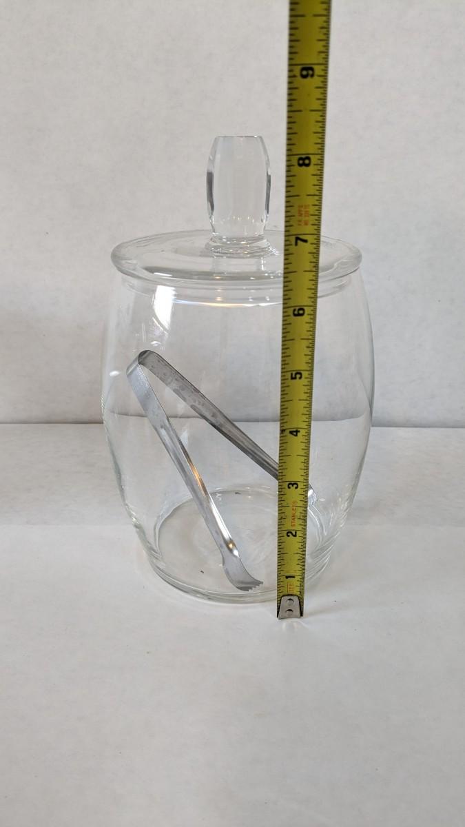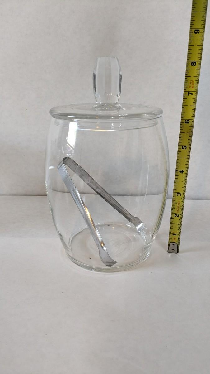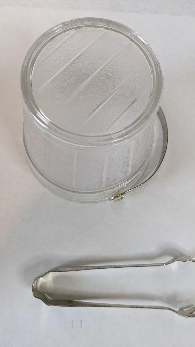 2 gorgeous ice holderws with tongs. Includes lovely basket designed piece and crystal style barrel piece with lid. Both are in excellent condition.