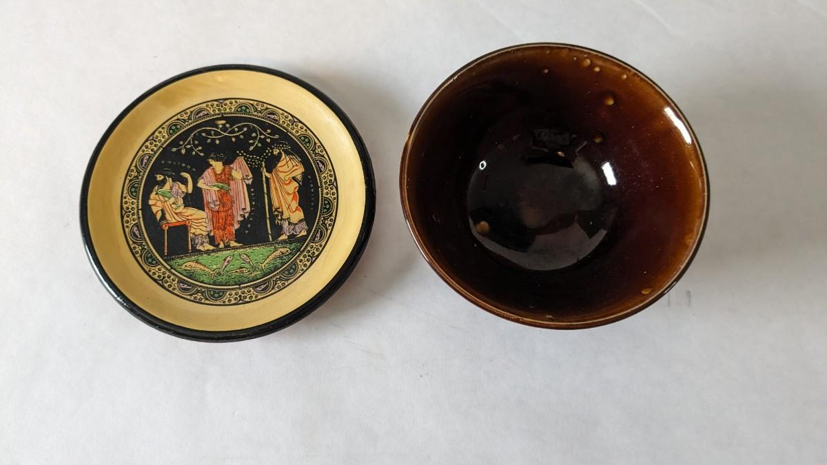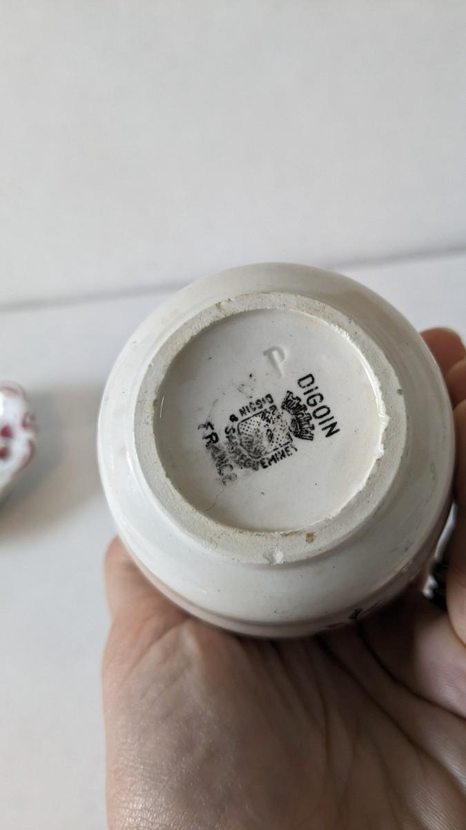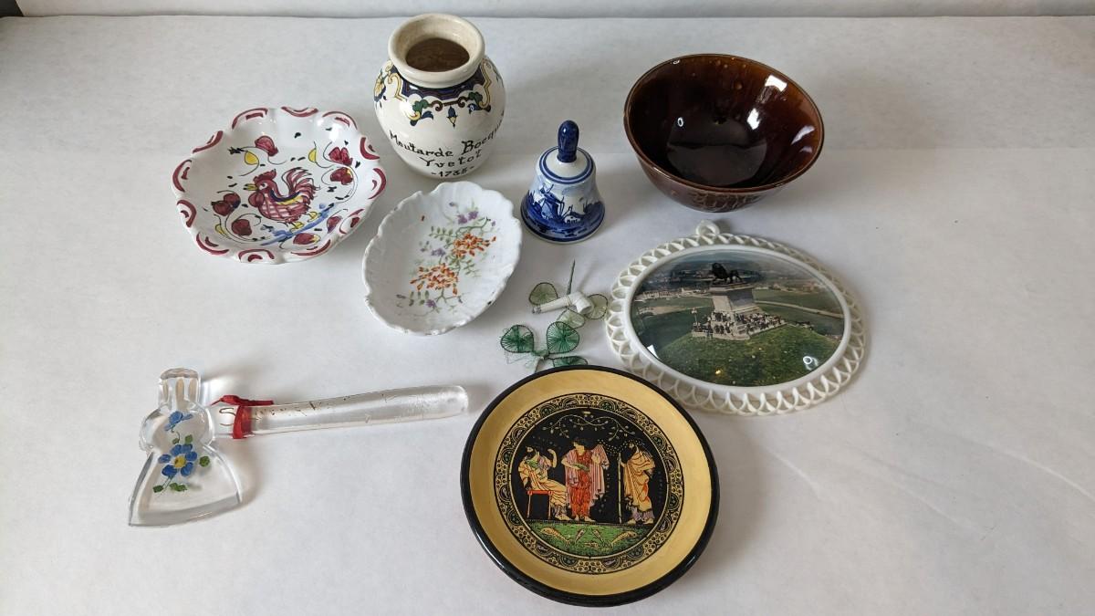 another "littles" lot of great items procured while abroad. Includes pieces from Belgium, France, Switzerland, Greece, and more! Delft, Digoin, and Deruta in this one! All pieces in good shape with exception to missing lid on the mustard pot and slight fray to clover pieces.
