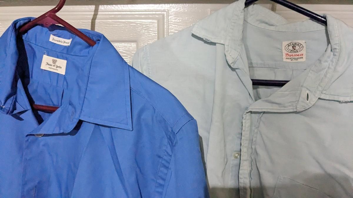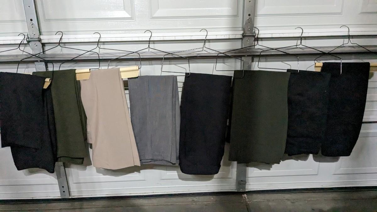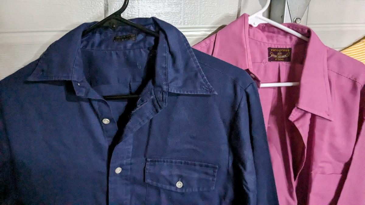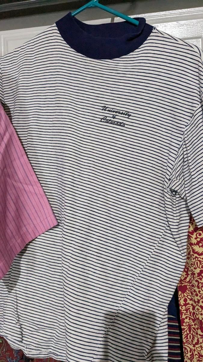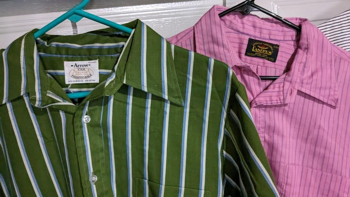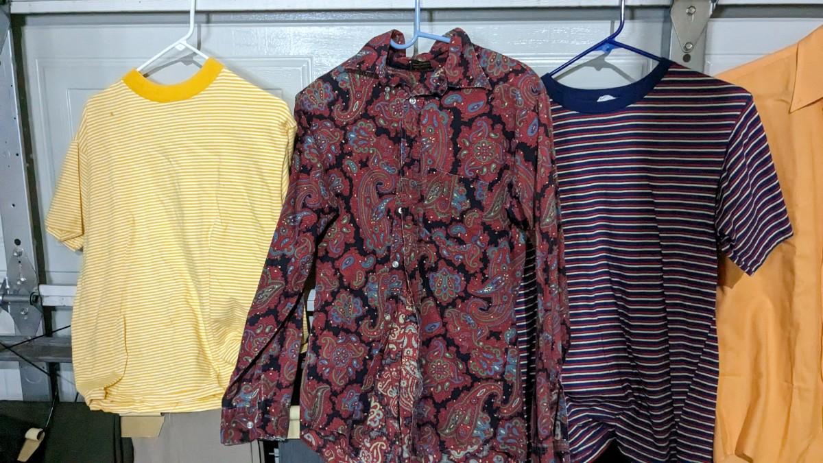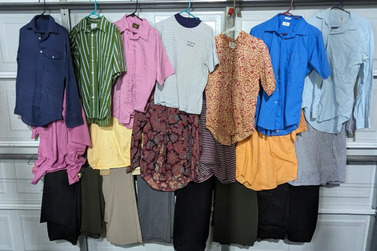 A great little lot of vintage mens shirts including a great University of Colorado knit tee. All show minor wear and small staining, nothing has been treated. Also includes (8) pairs of womens pants size 8 and cuter than the dickens sock hangers.