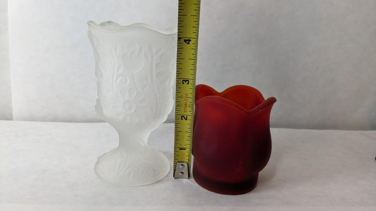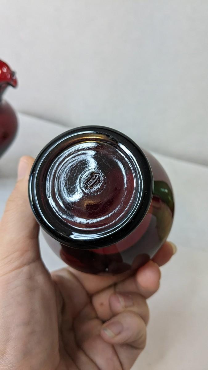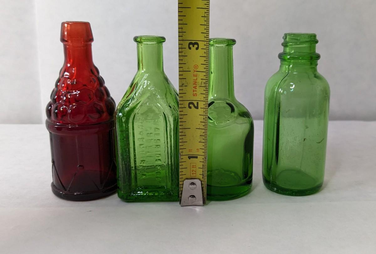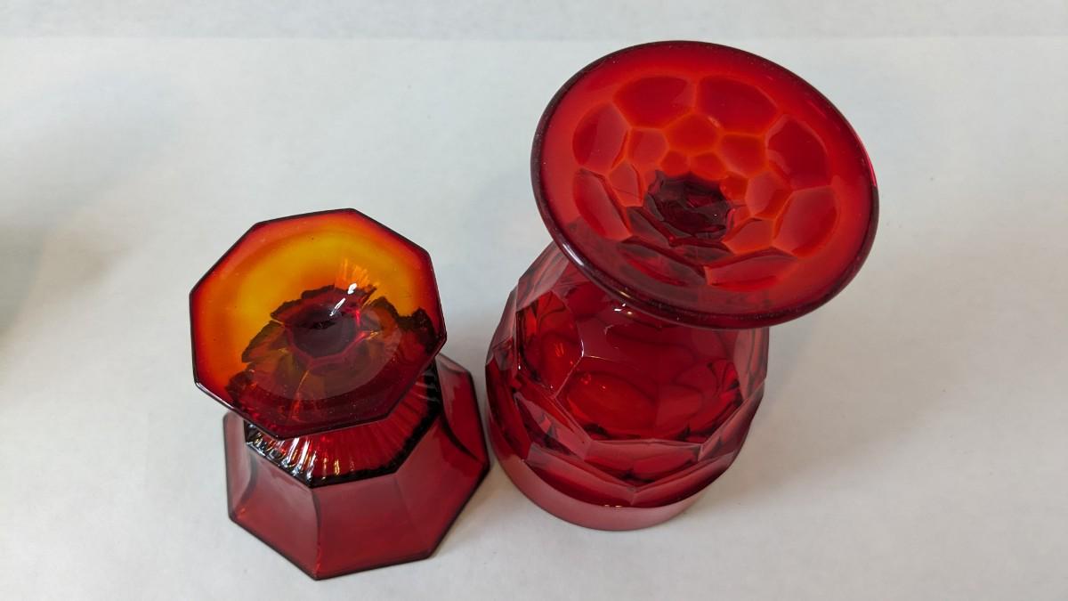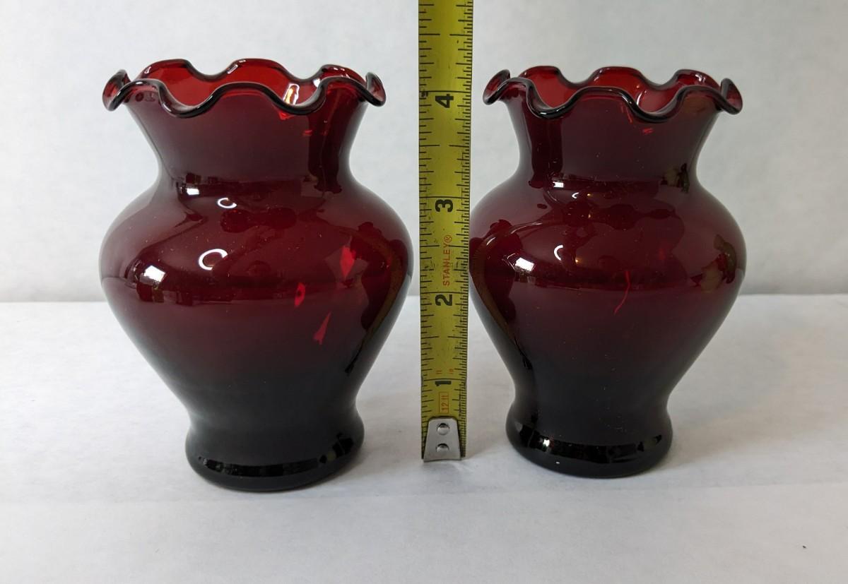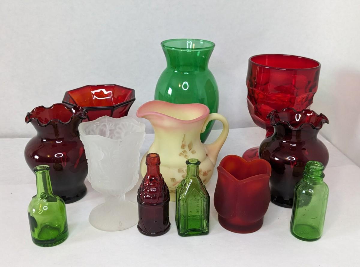 a beautiful display of mainly red and green glass vases, miniature bottles, and a couple of frosted/satin glass pieces. Includes 2 ruffle top mini vases from Anchor Hocking. All in great condition. No shipping