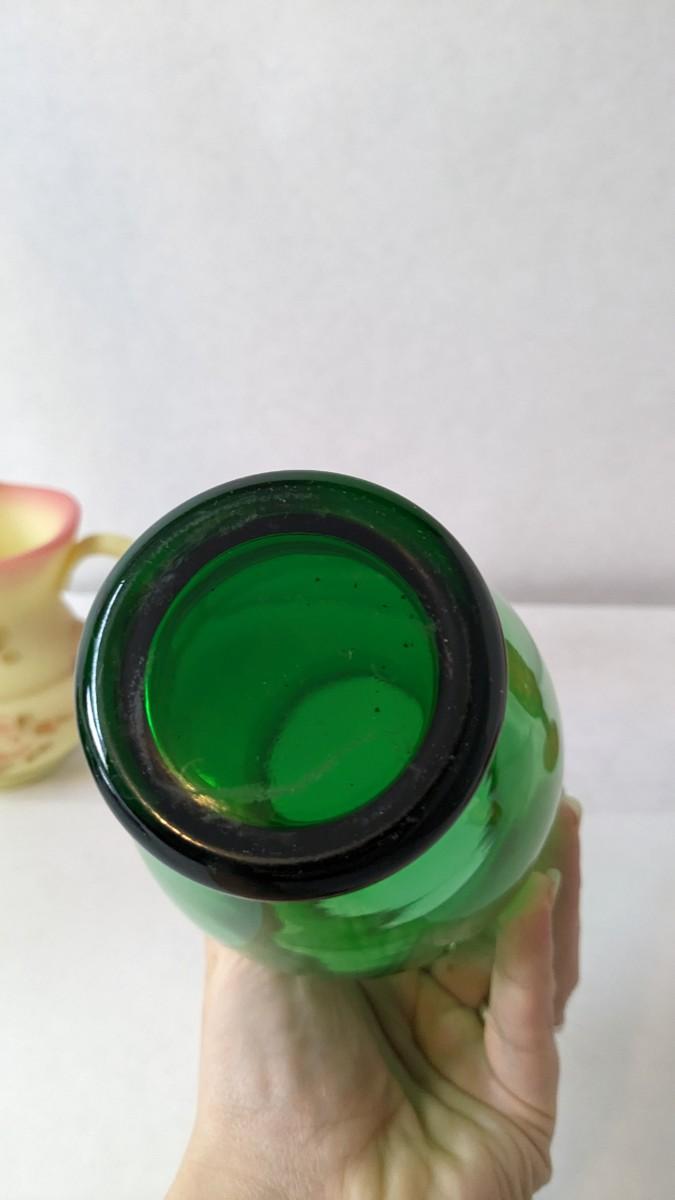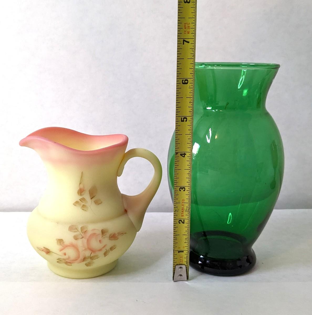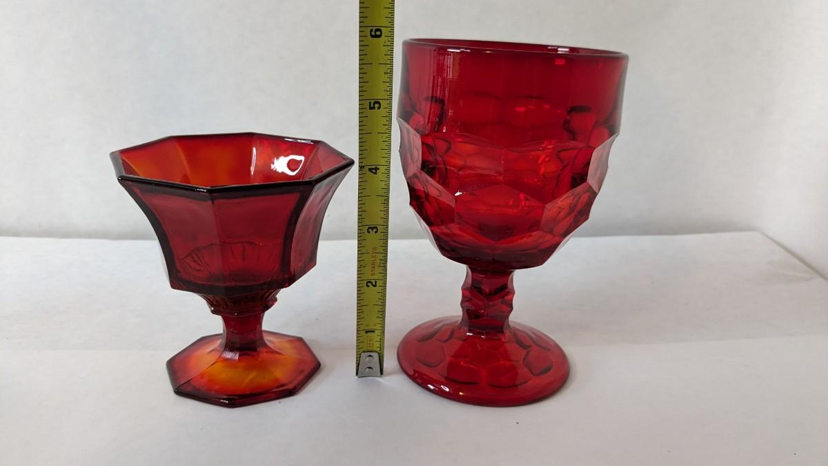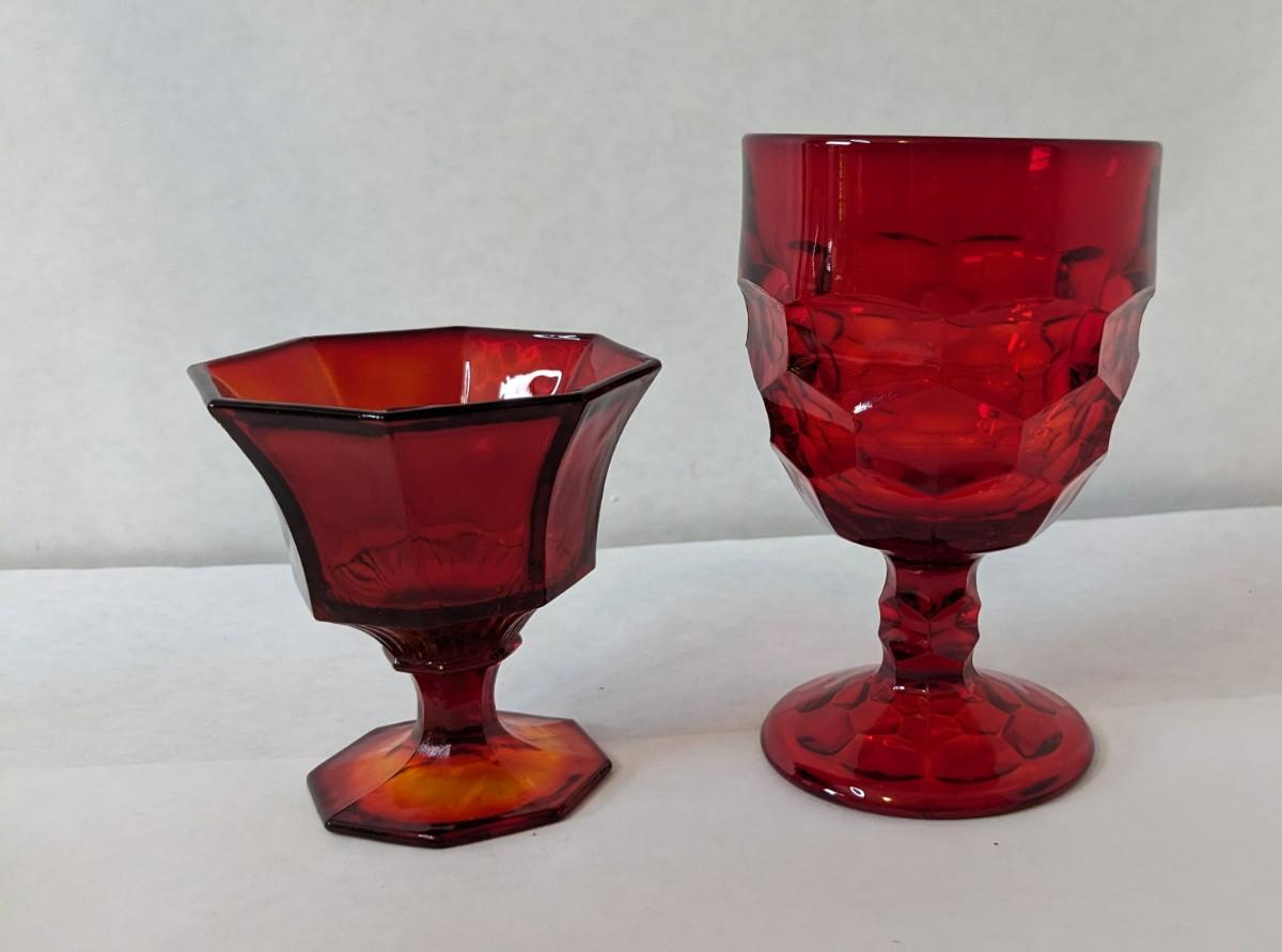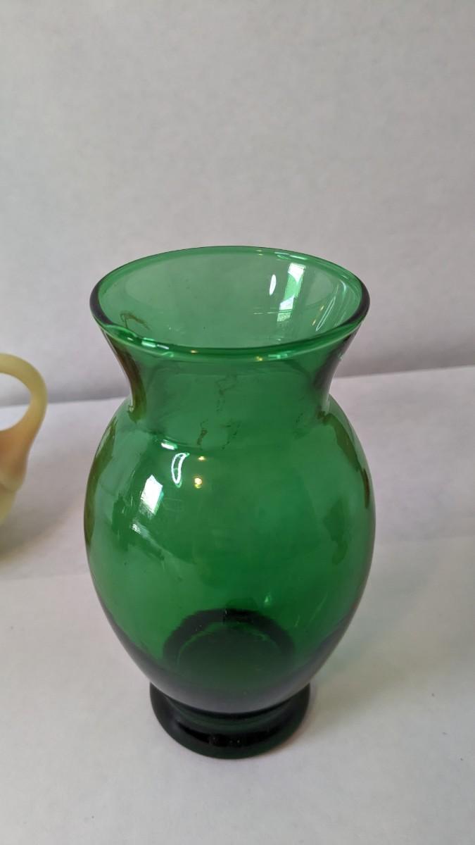 a beautiful display of mainly red and green glass vases, miniature bottles, and a couple of frosted/satin glass pieces. Includes 2 ruffle top mini vases from Anchor Hocking. All in great condition. No shipping