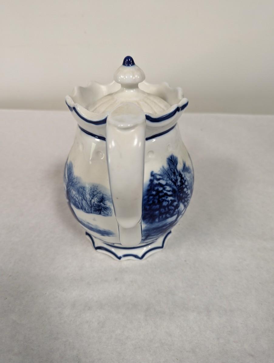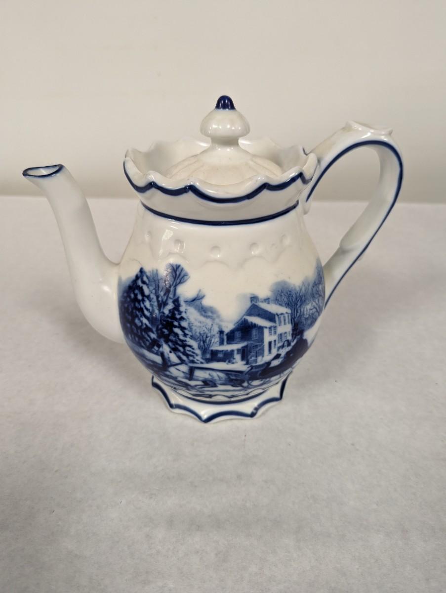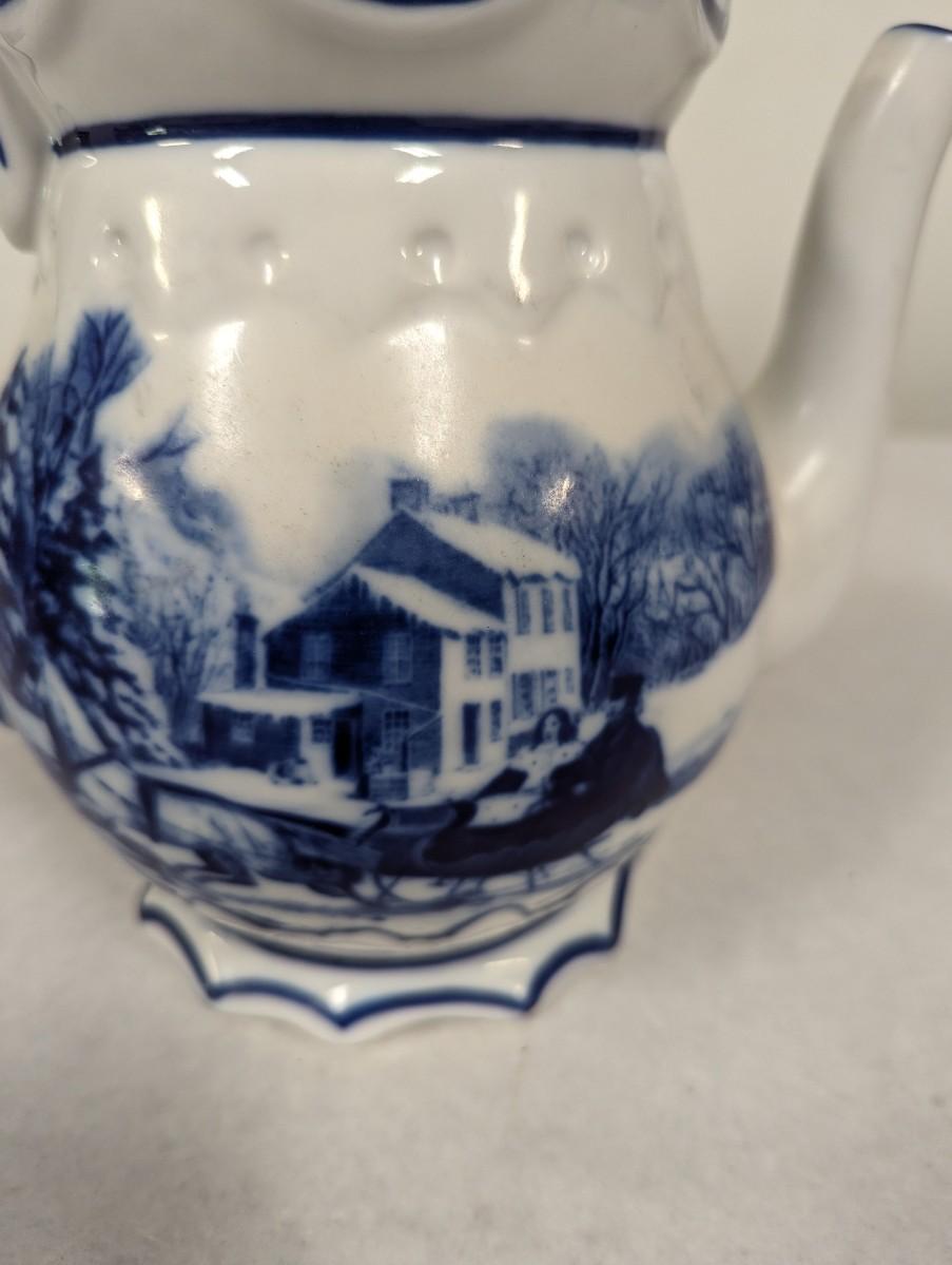 Unmarked Blue & White Ceramic Tea Kettle With Winter Scene Horse & Sleigh Ride