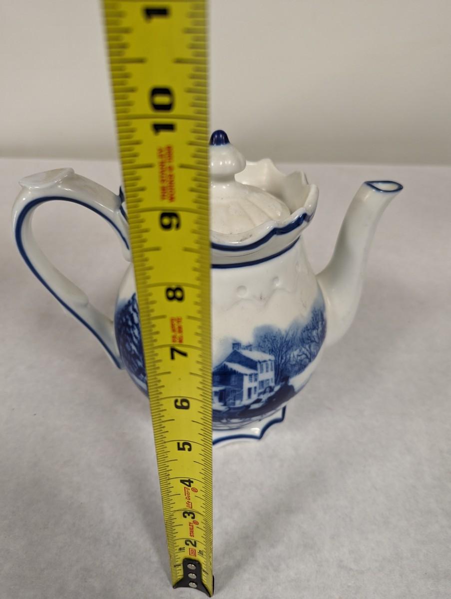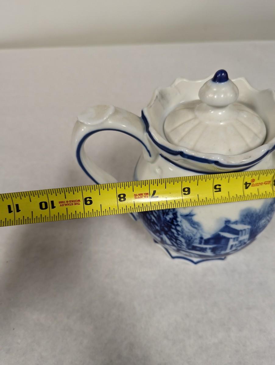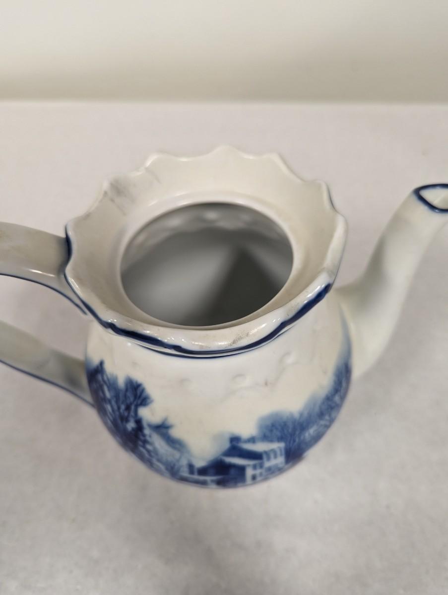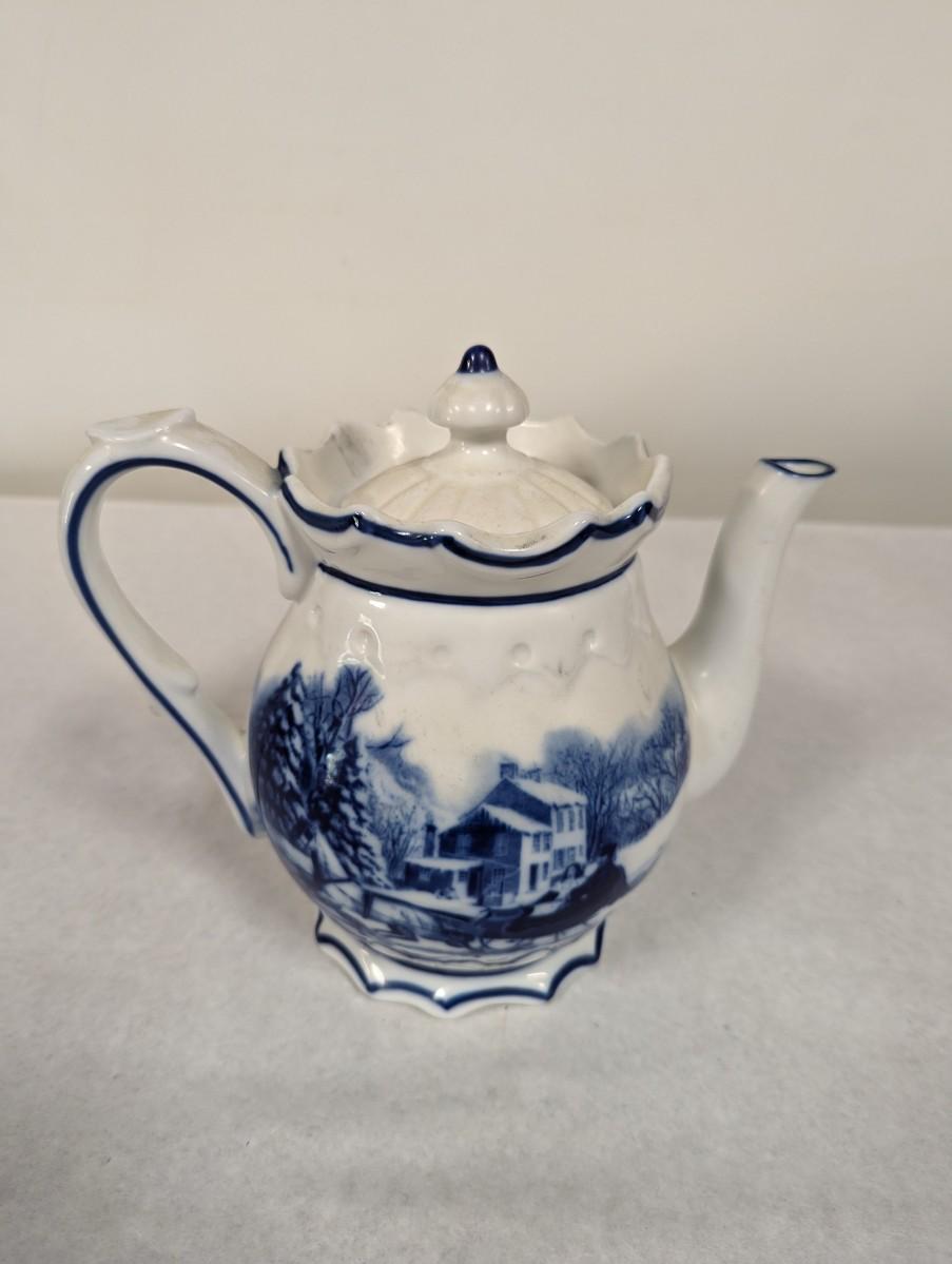 Unmarked Blue & White Ceramic Tea Kettle With Winter Scene Horse & Sleigh Ride