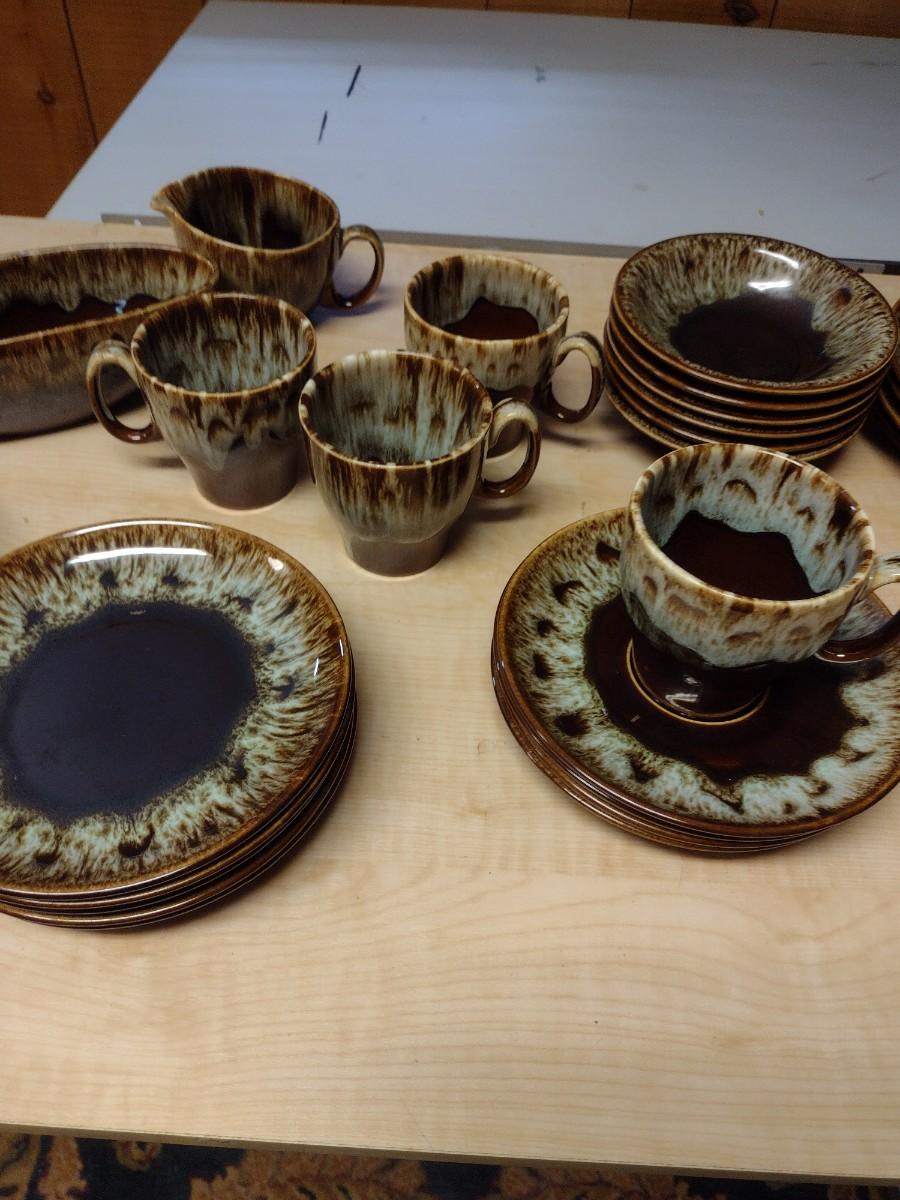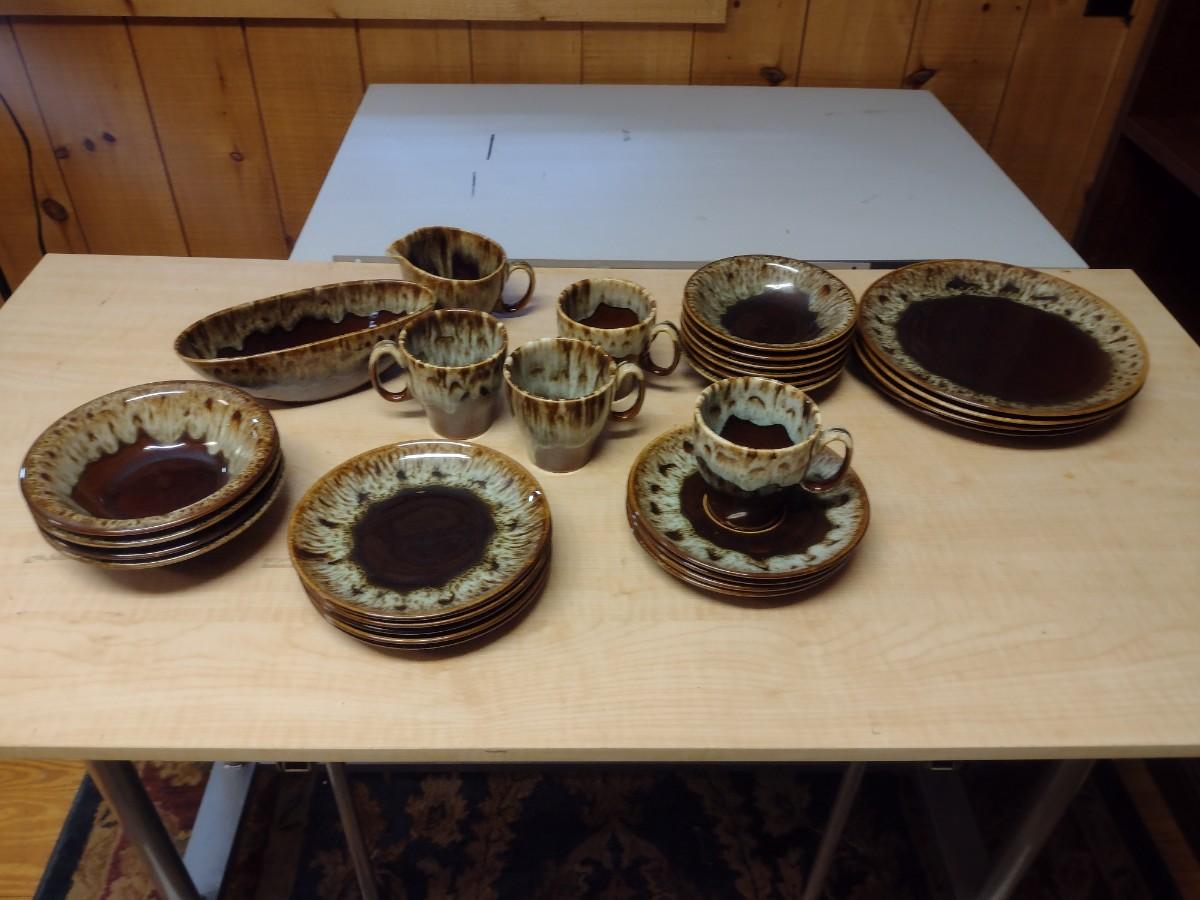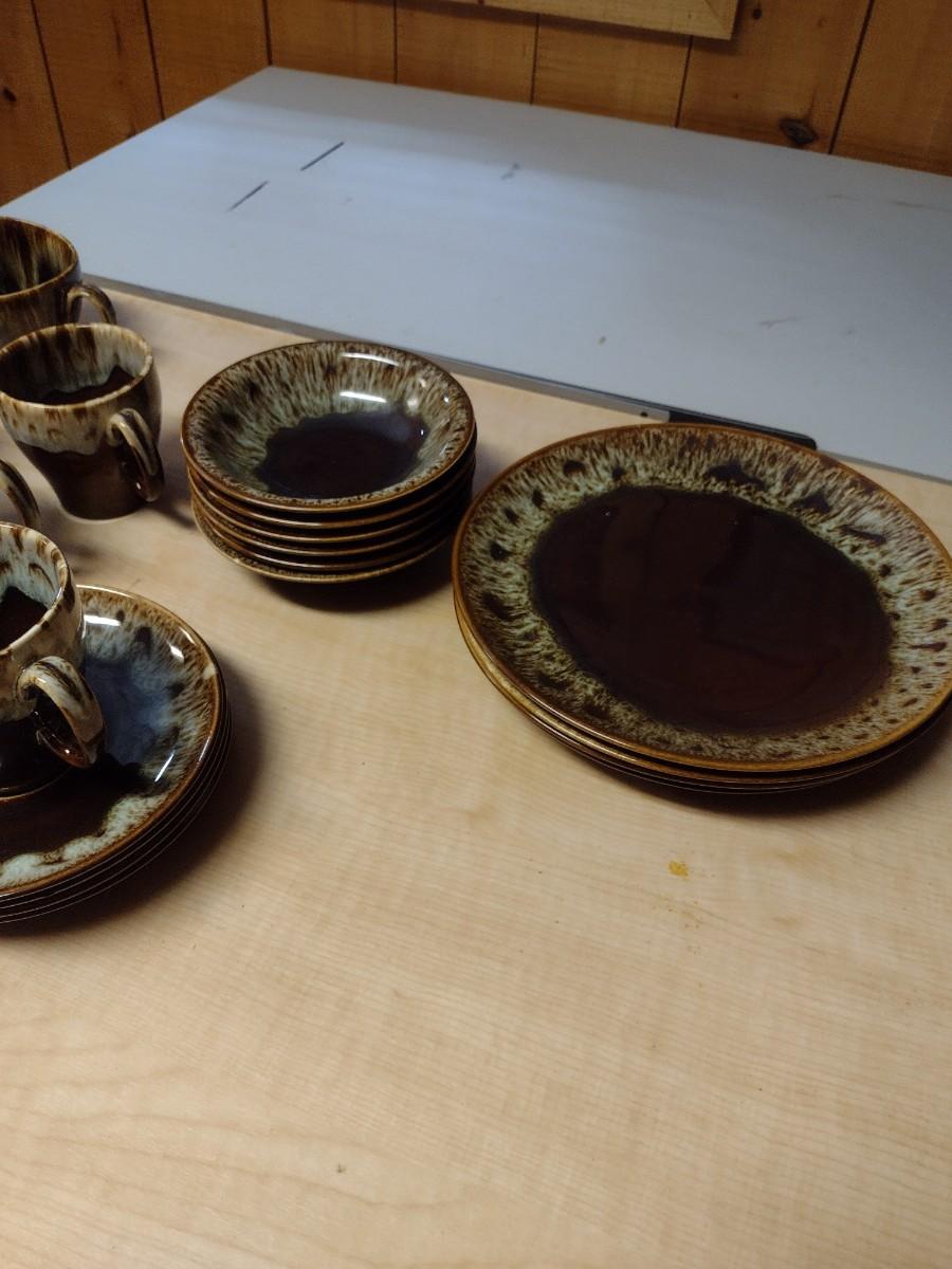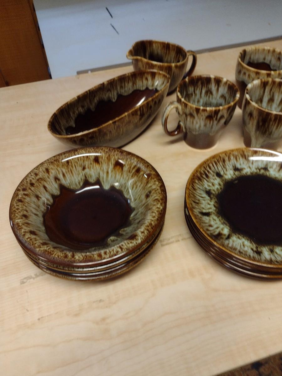 Unmarked Drip Glaze Pottery Dinnerware. Approx 27 pcs. Dinner plates - 4, salad plate - 5, soup bowls - 4, dessert bowl- 4, cups - 4, saucers - 4, oval serving bowl - 1, creamer- 1. All in used condition, please expect occasional chip or crack. PLEASE NOTE:. Due to no internet connection or wireless service, all invoices must be prepaid via PayPal, Stripe, or Zelle prior to arrival at pick up. Exact change cash onsite is acceptable but absolutely no debit or credit cards at time of pick up.