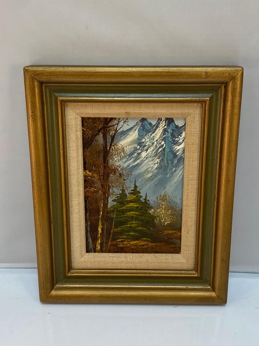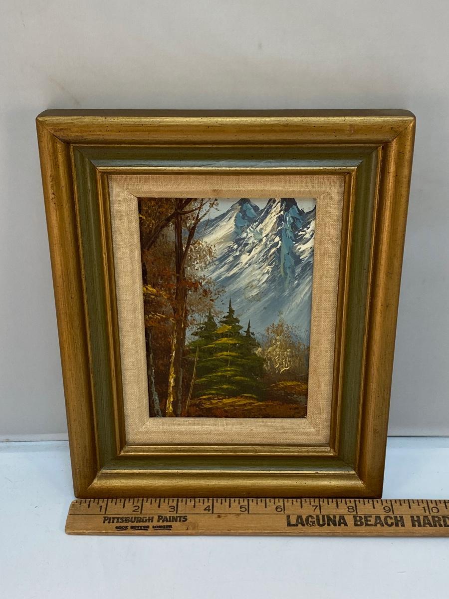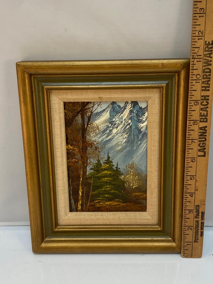 Small Vintage Forest with Snow Covered Mountains Oil Painting Framed 9x11. In good condition. Painting not a print.
