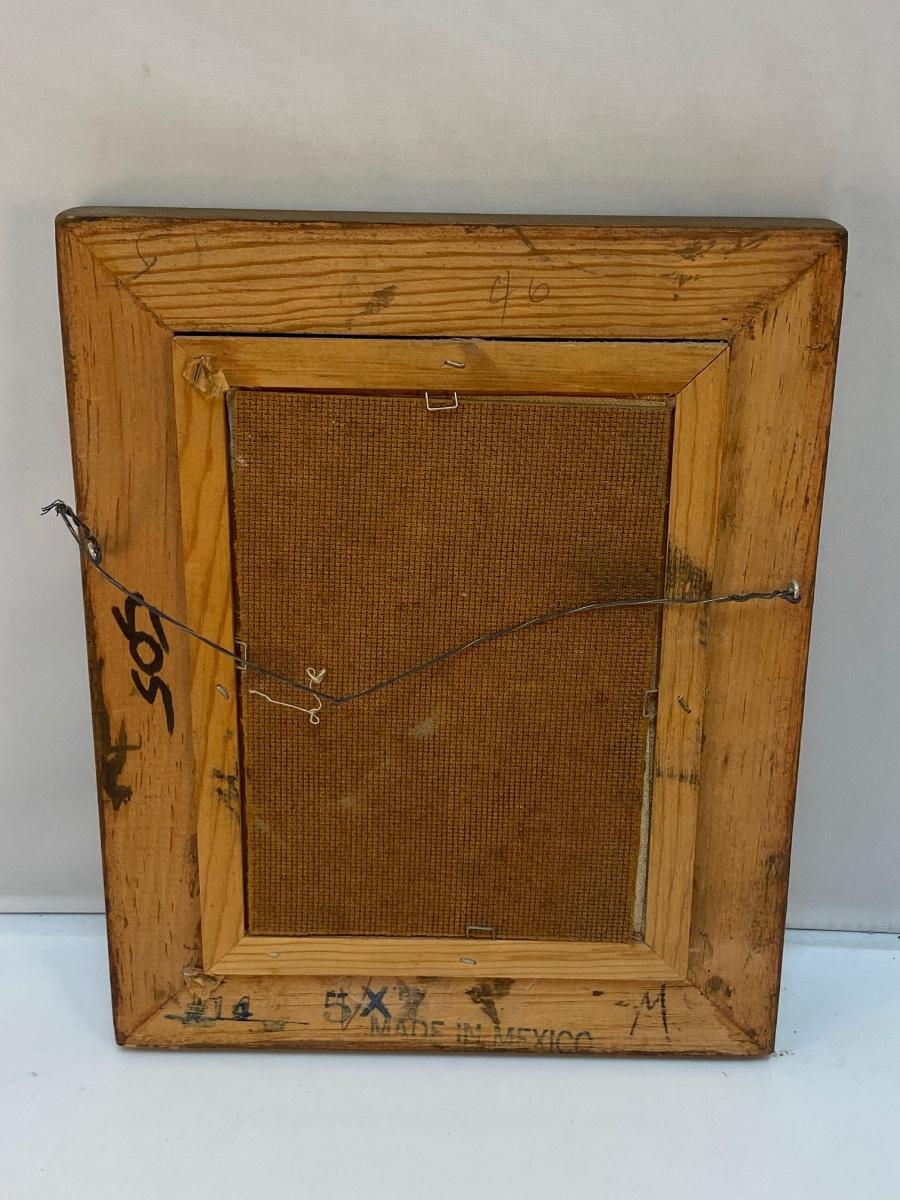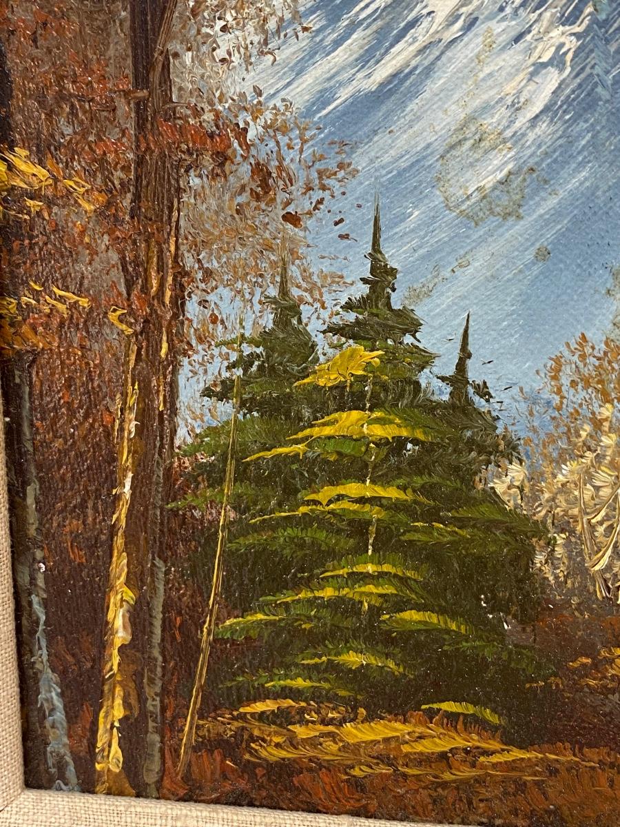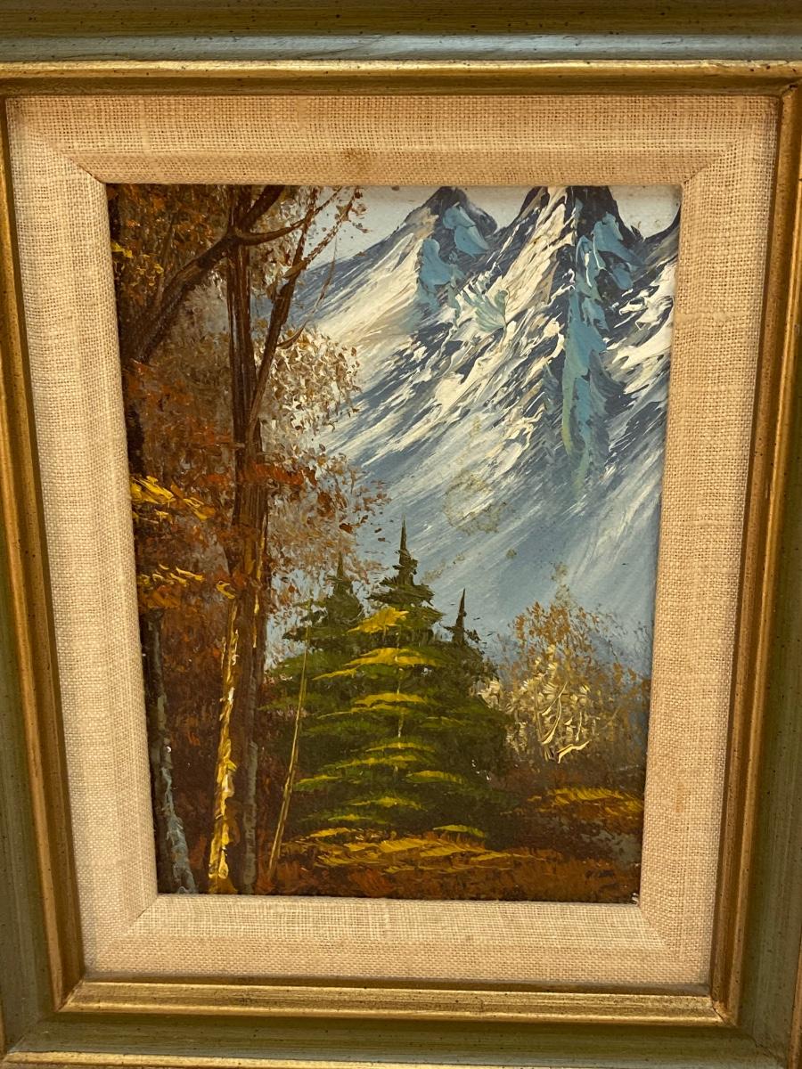 Small Vintage Forest with Snow Covered Mountains Oil Painting Framed 9x11. In good condition. Painting not a print.