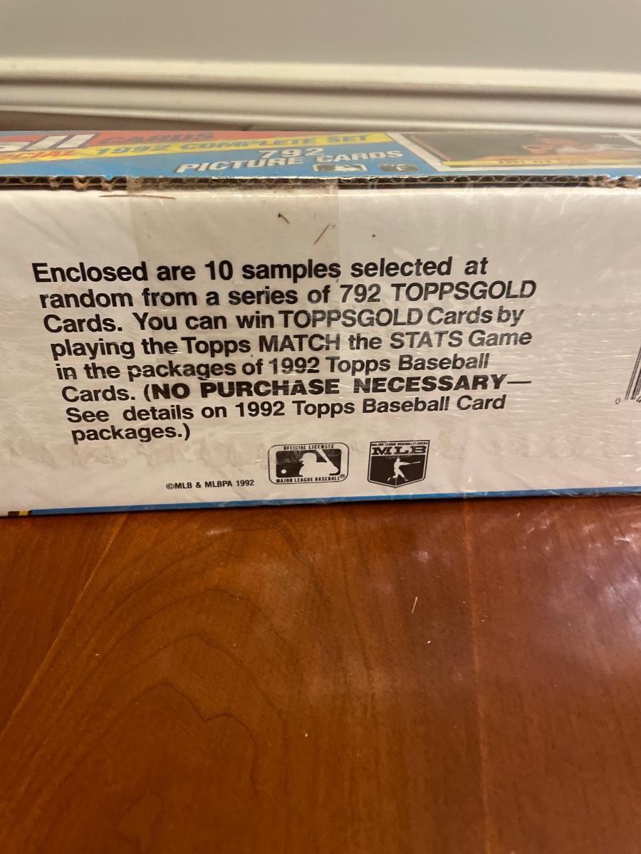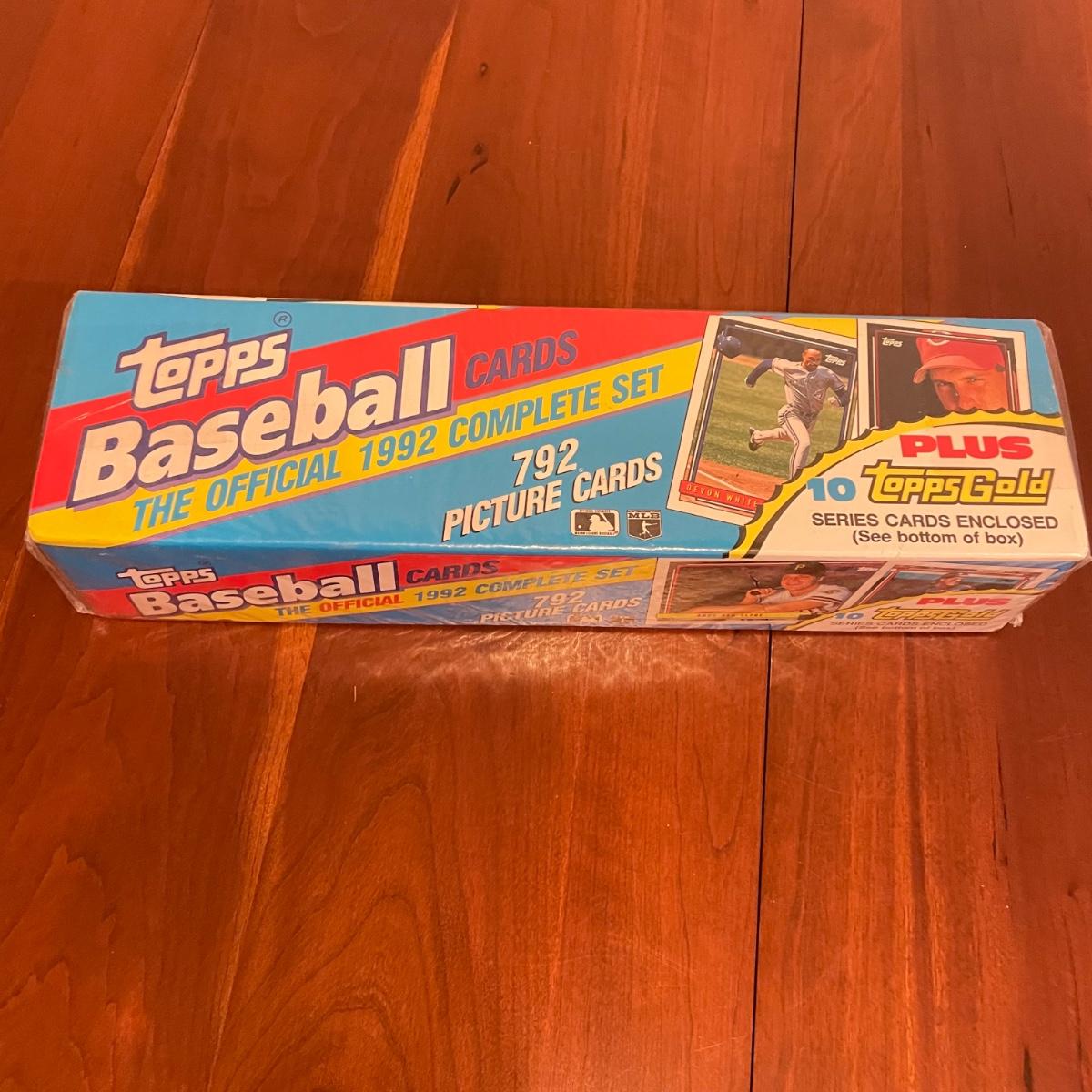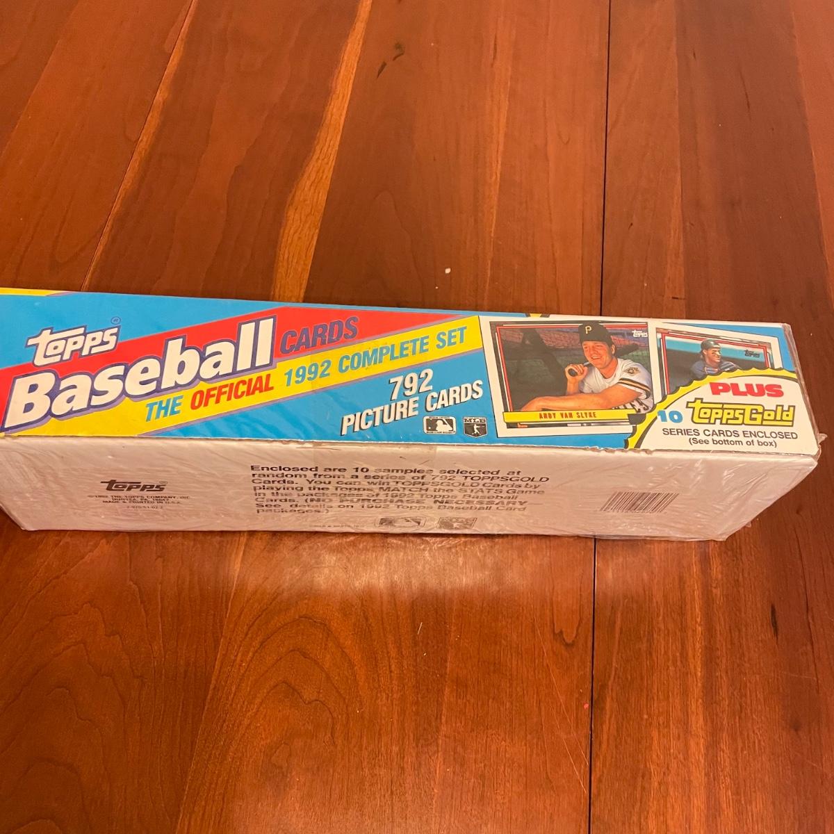 Wrapped in plastic, the Topps Baseball Cards, The Official 1992 Complete Set with 792 picture cards. Box boasts “Plus 10 Topps Gold Series Carss Enclosed”. See images. Shipping available.