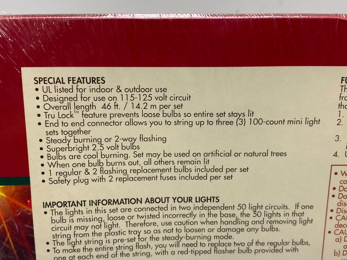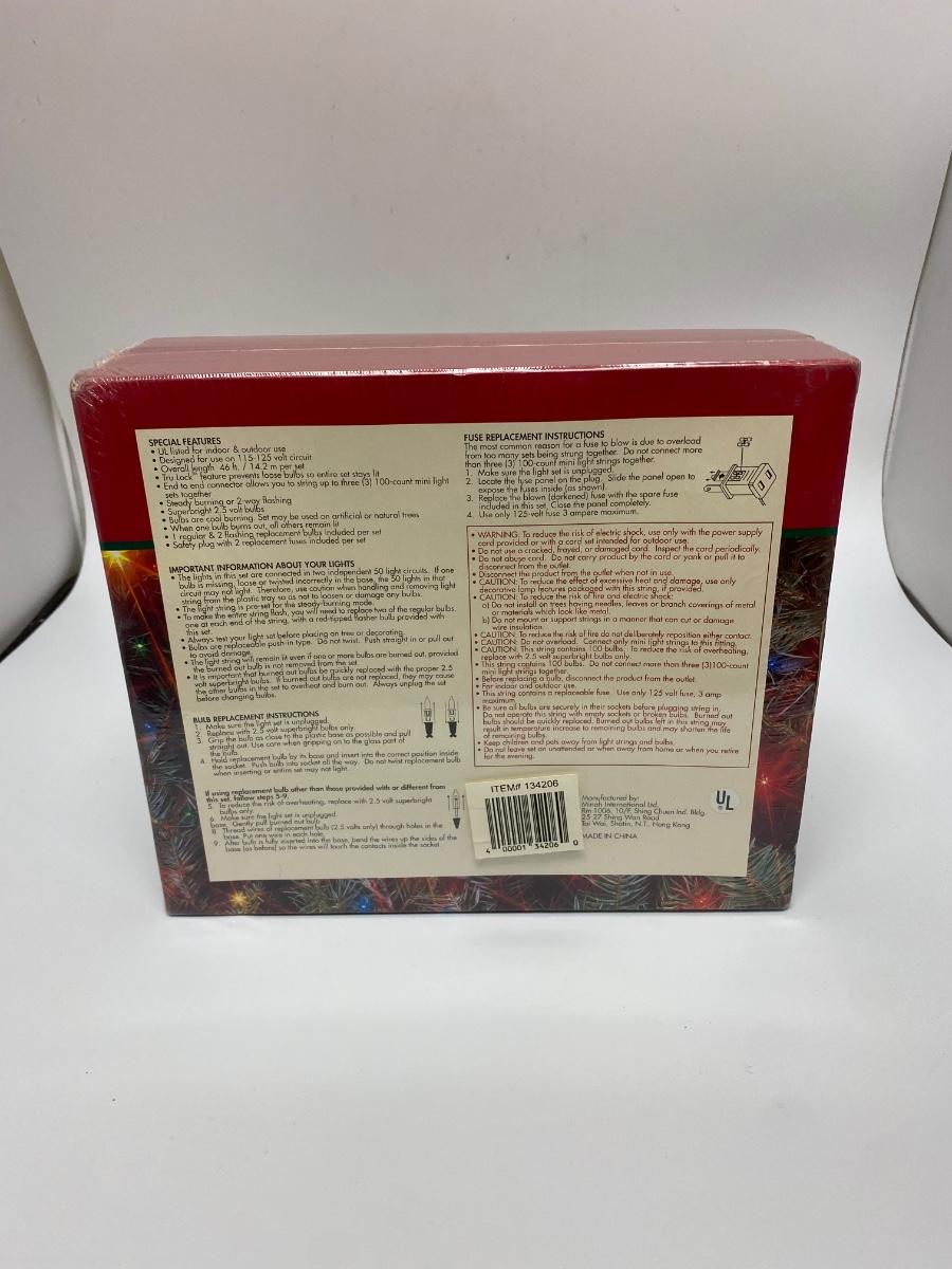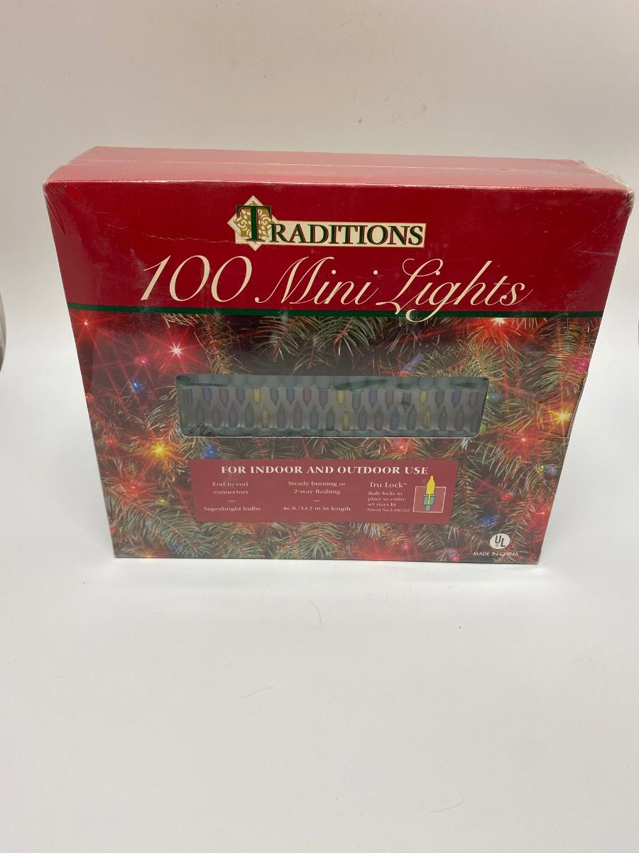 Unopened, shrink wrapped boxes of mini lights. Three boxes, 100 light strands. Can be used indoors or outdoors. Multicolored strands.