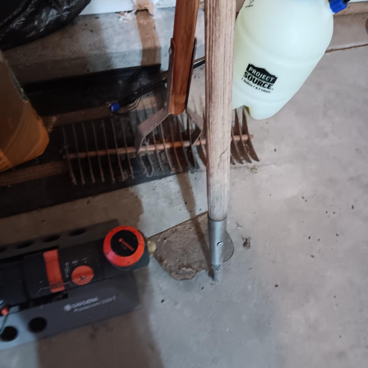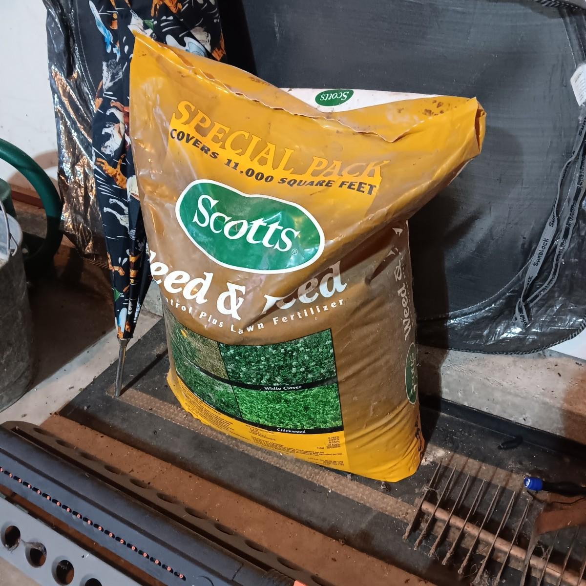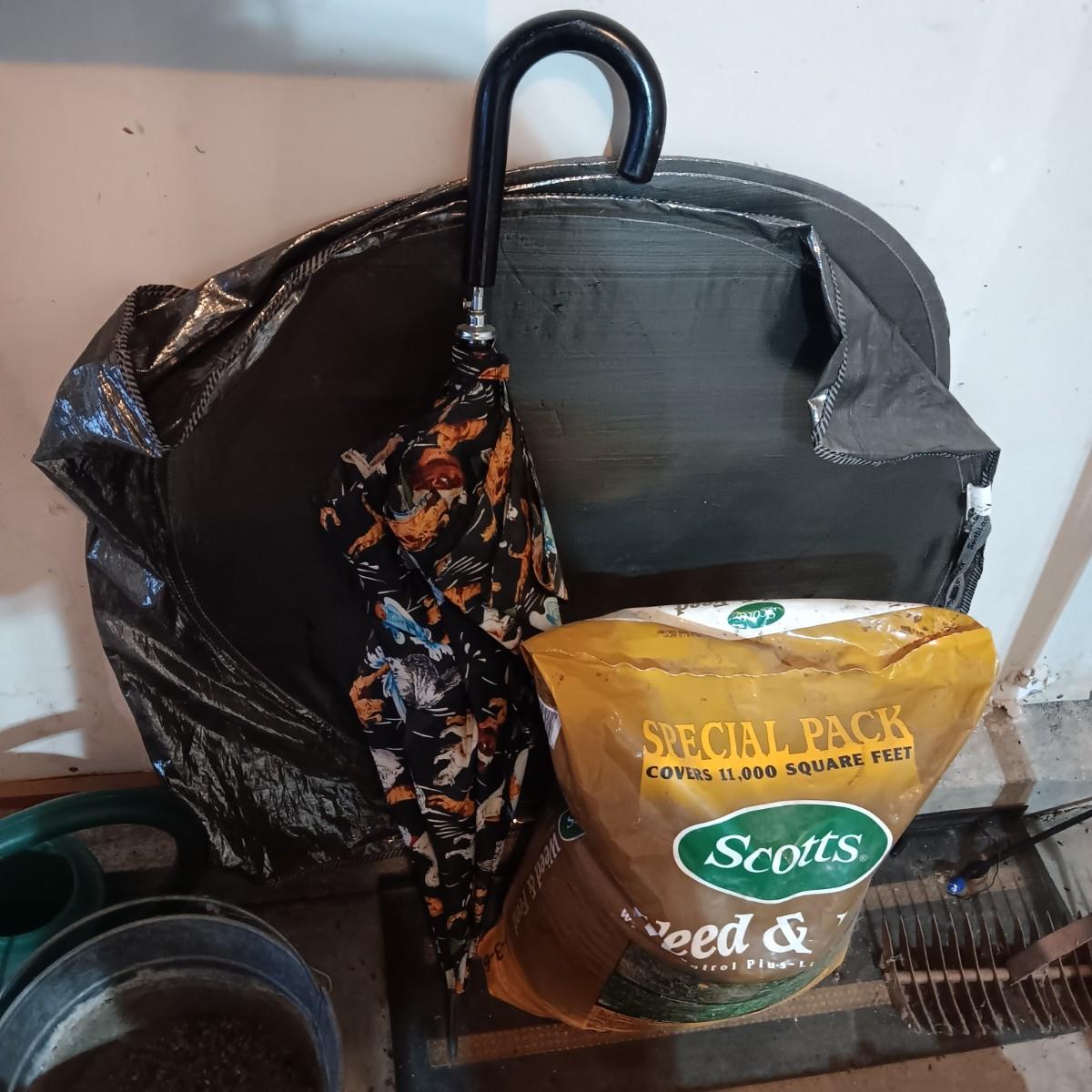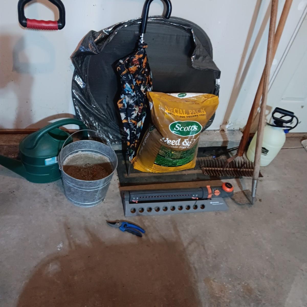 UNOPENED BAG OF FERTILIZER, YARD TOOLS, WINDSHIELD SUN SHADE AND MORE