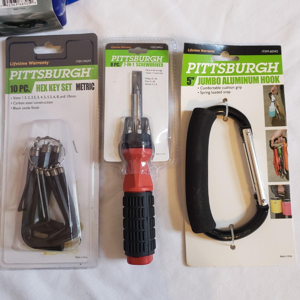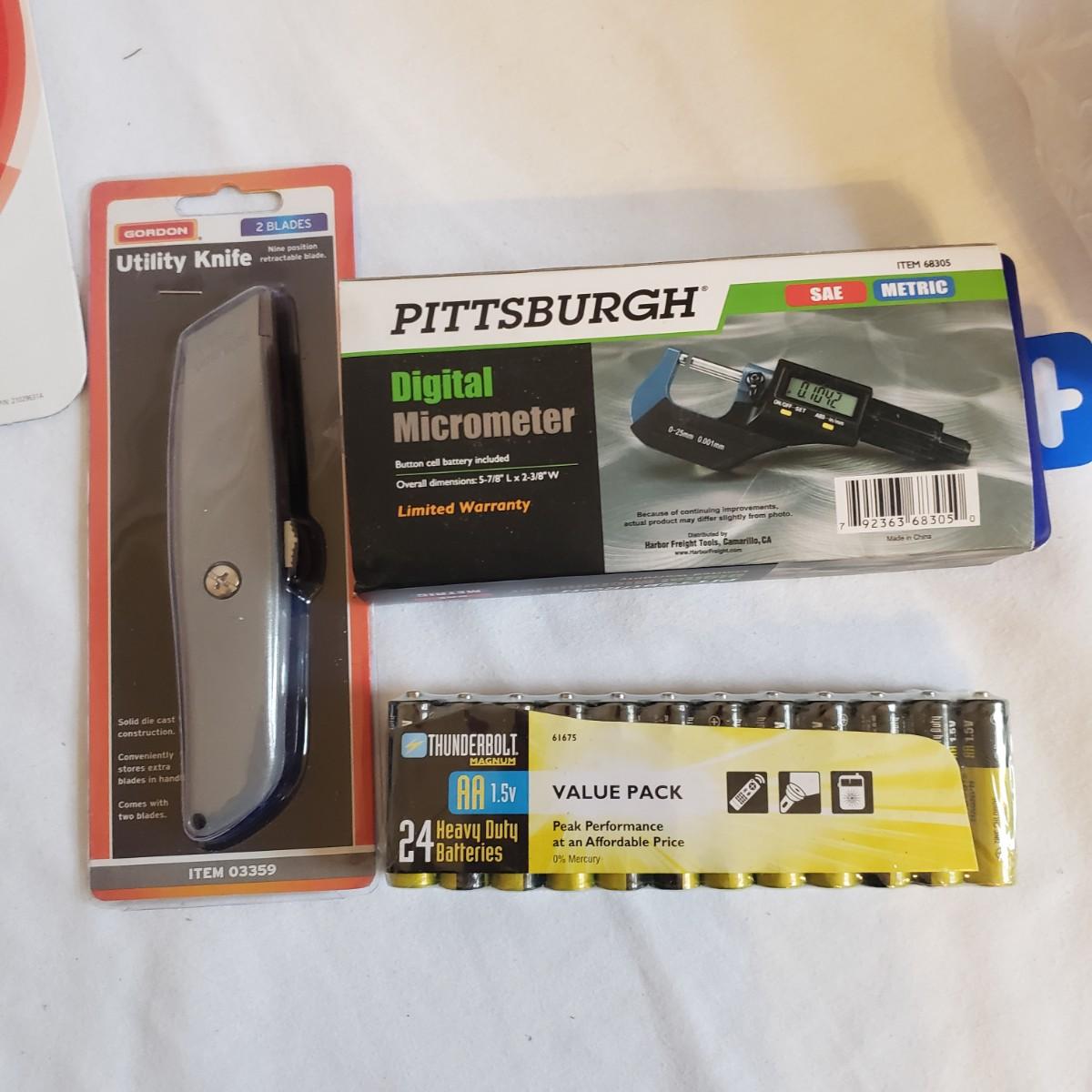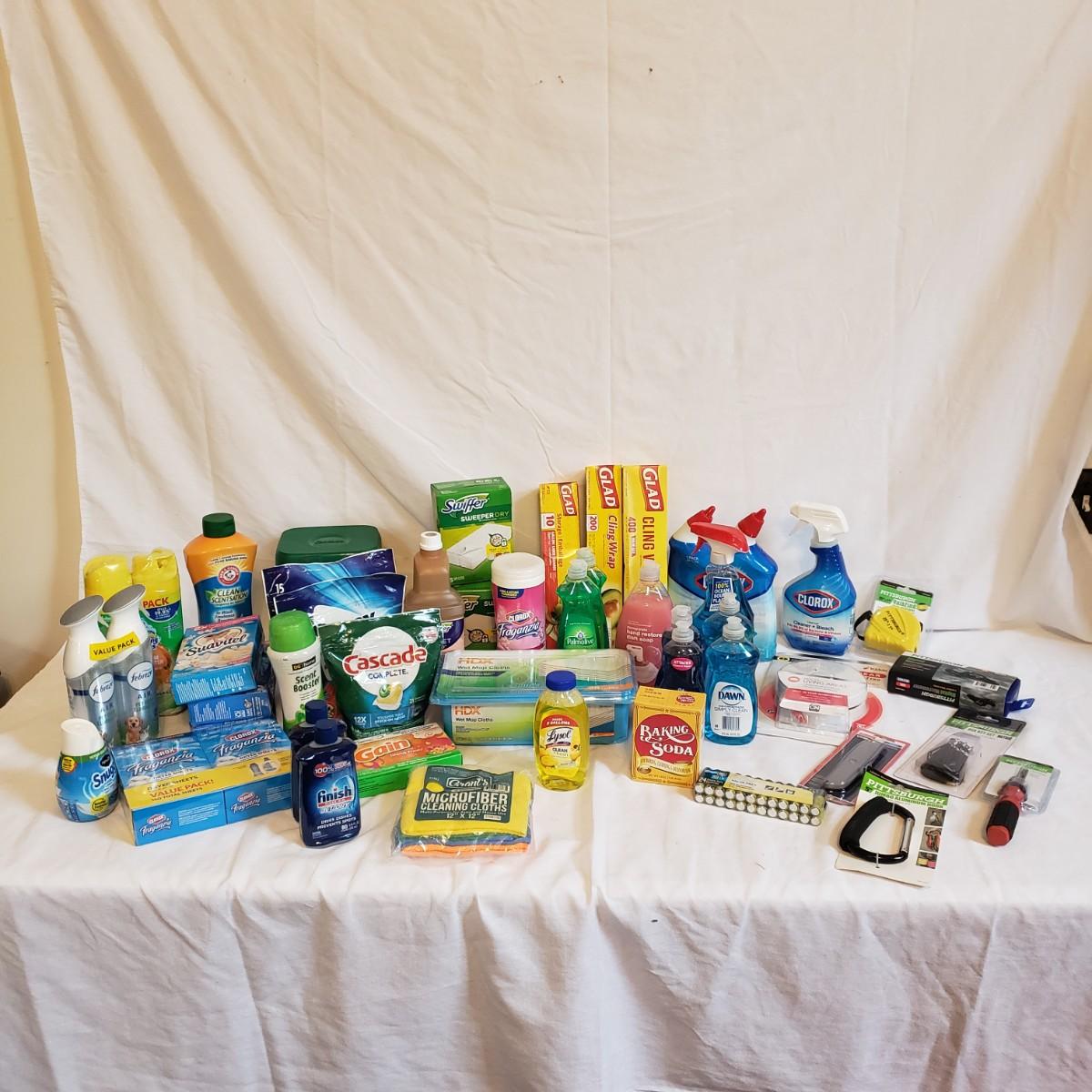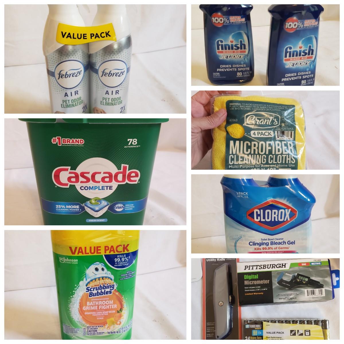 This is your one stop shopping for cleaning supplies and some tools!! This lot ranges from floor care, to Clingwrap, to laundry! See pictures for quantity and brands.