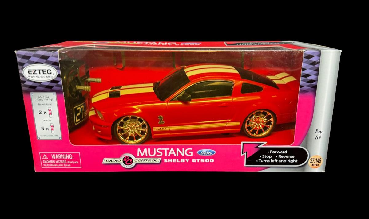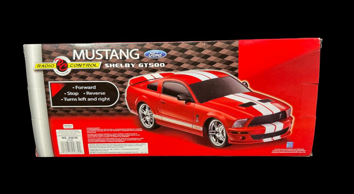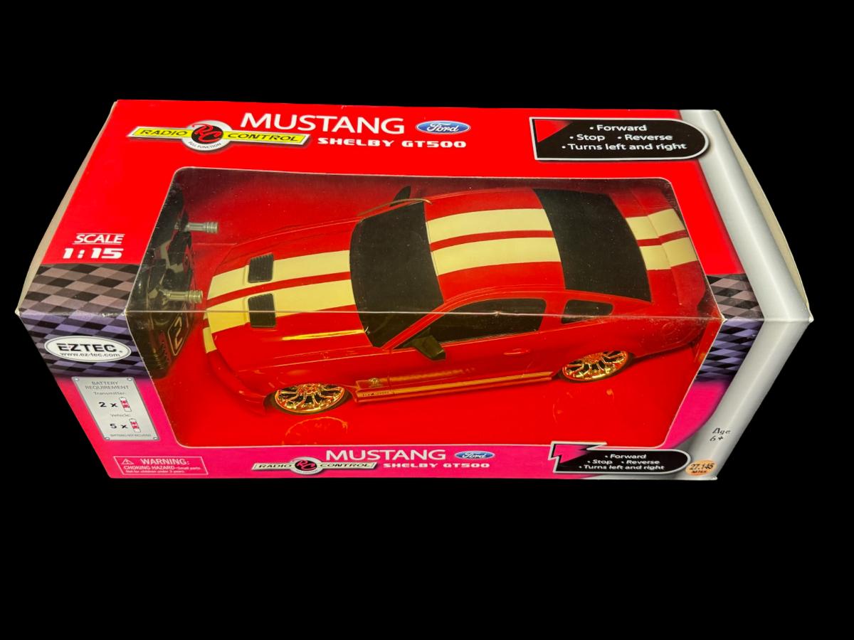 NOS. This is a Ford Mustang Shelby GT500 in 1:15 scale, full function RC car with drive, reverse, and turning. It is officially licensed by Ford, and requires AA batteries. In the original unopened package. Pre-auction estimate: $50-$100.