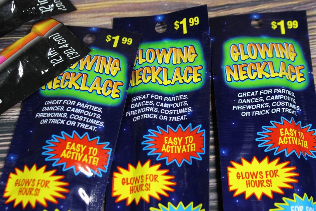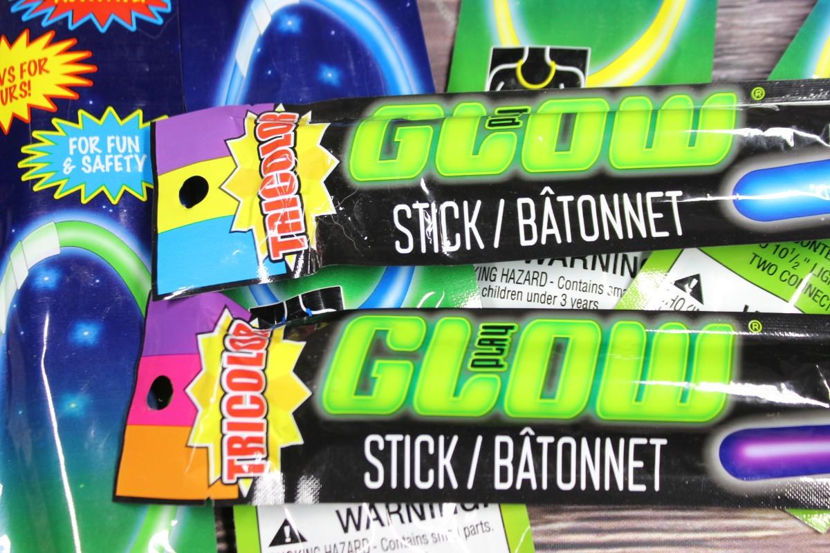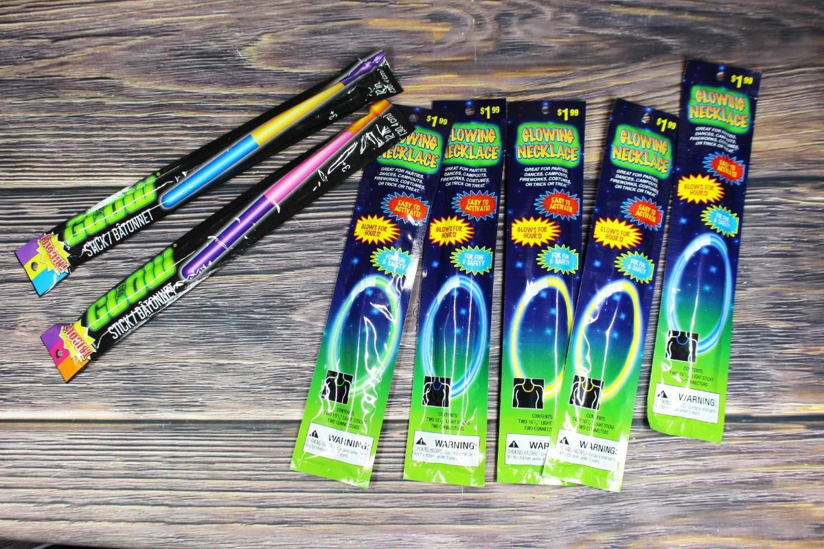 Unopened packages of glow sticks and glowstick necklaces.