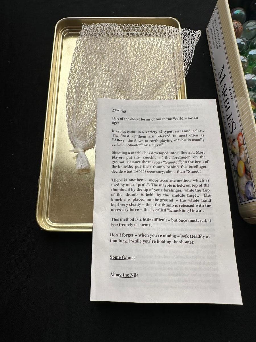 UNOPENED JUNGLE BAG AND A TIN OF MISC MARBLES