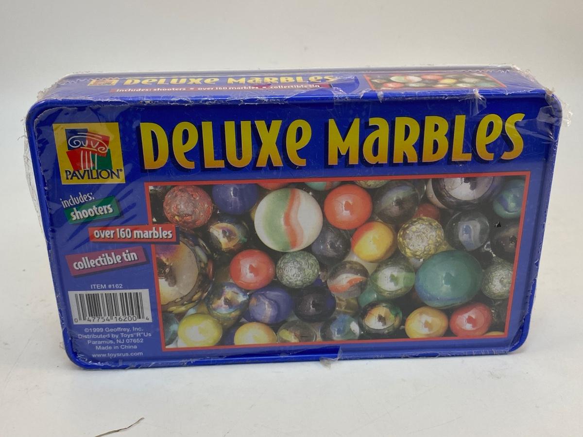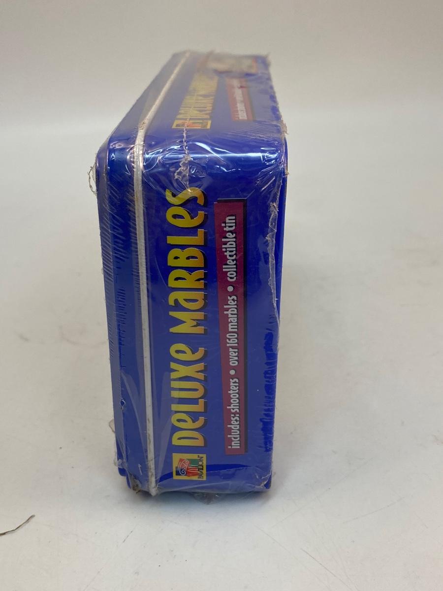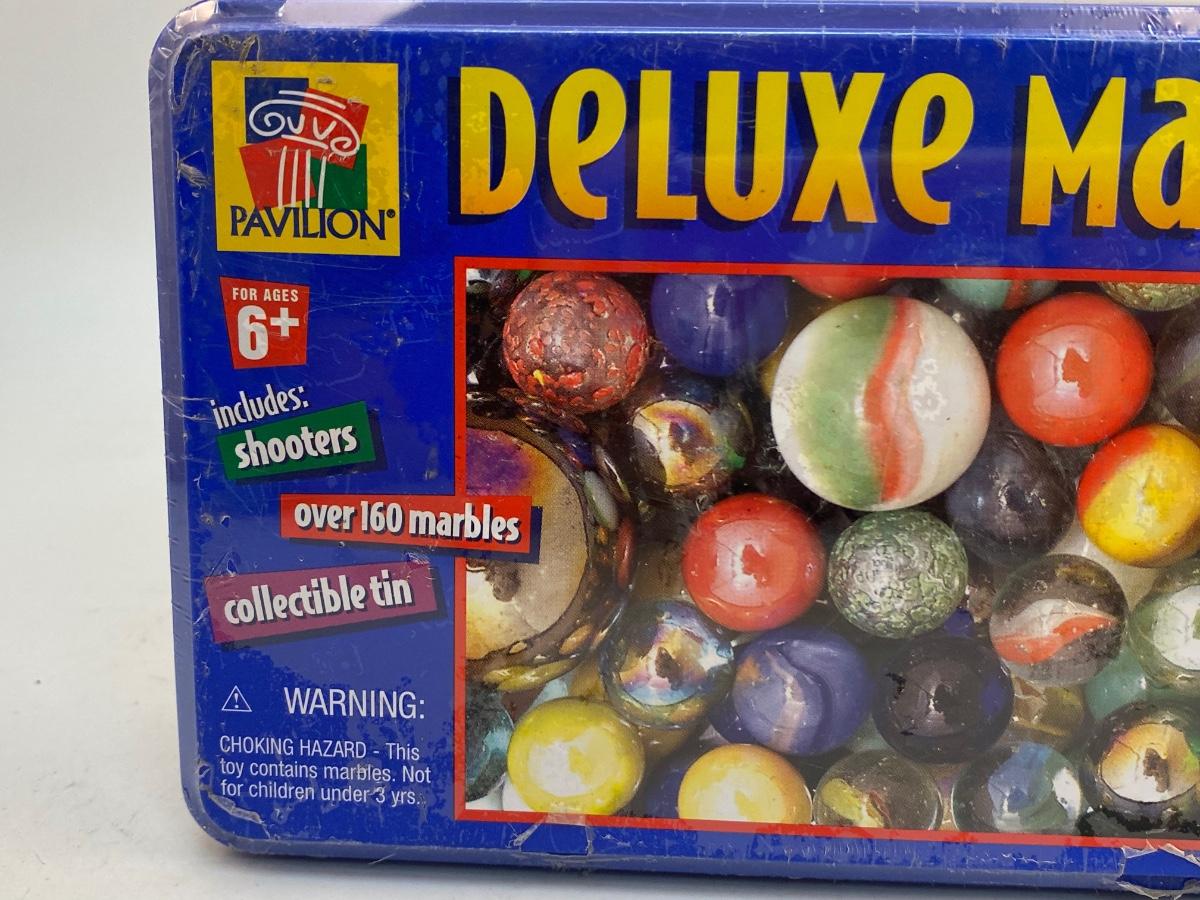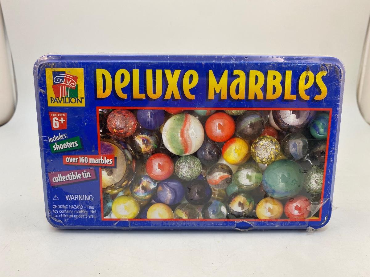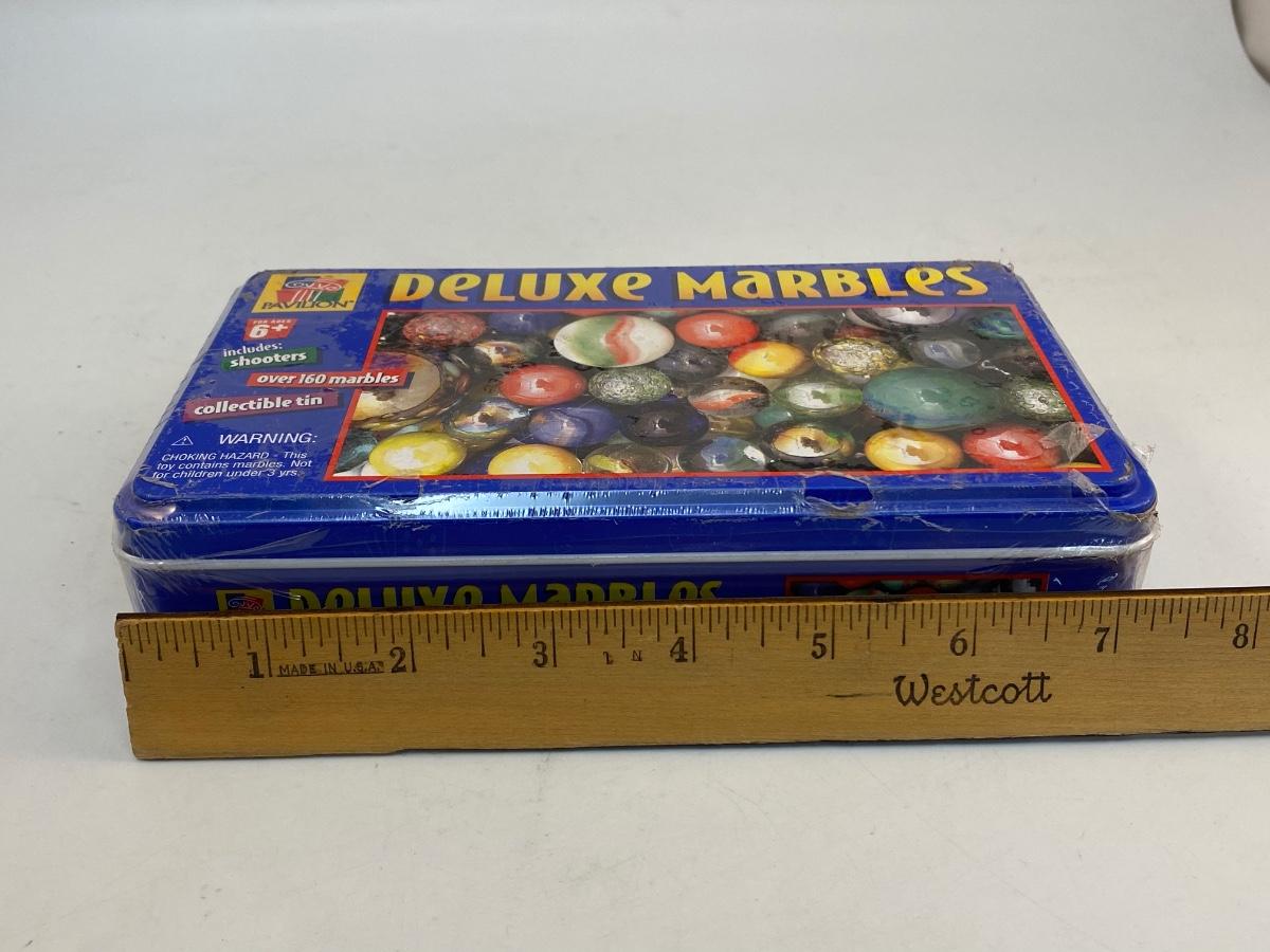 Unopened Metal Tin of Deluxe Marbles. Over 160 marbles, still shrink wrapped in plastic.
