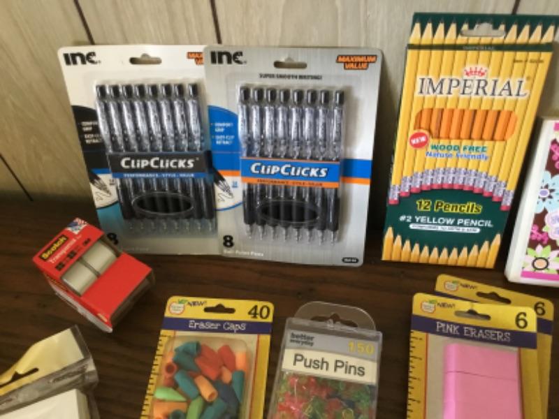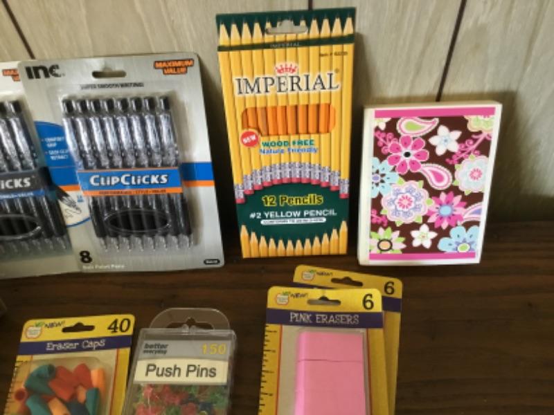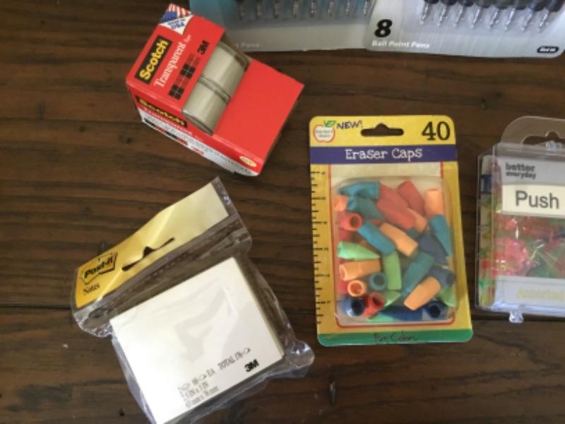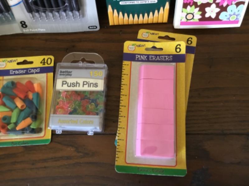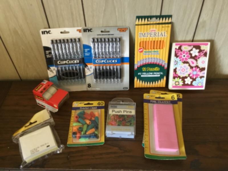 10 item school supply lot. 2 packs of pens, pencils, 2 packs of erasers, push pins, pencil top erasers, post it notes, tape, and a small note pad. Unopened packs.