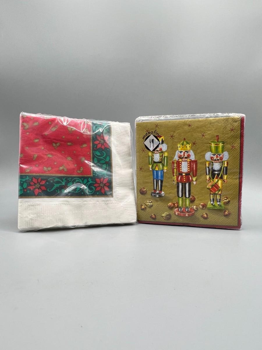 Two unopened packages of seasonal Christmas cocktail napkins.