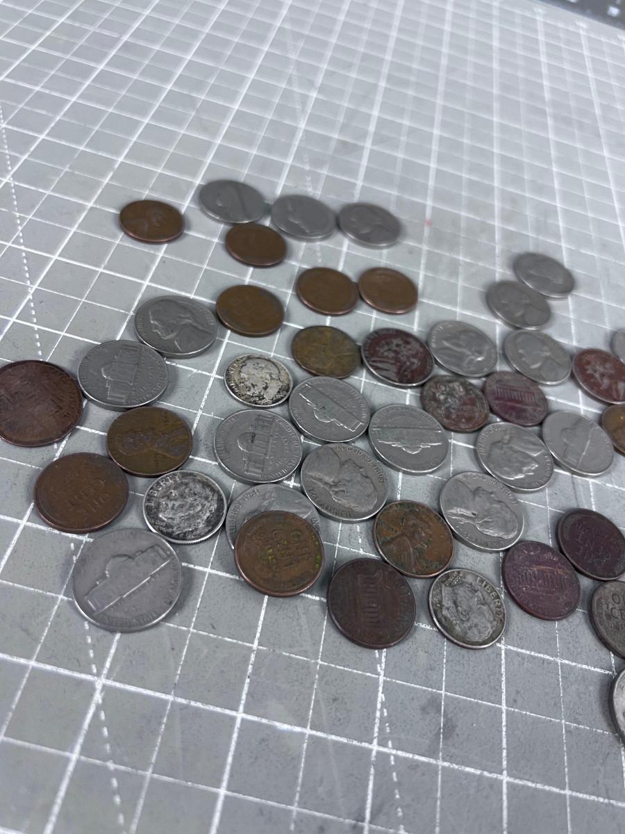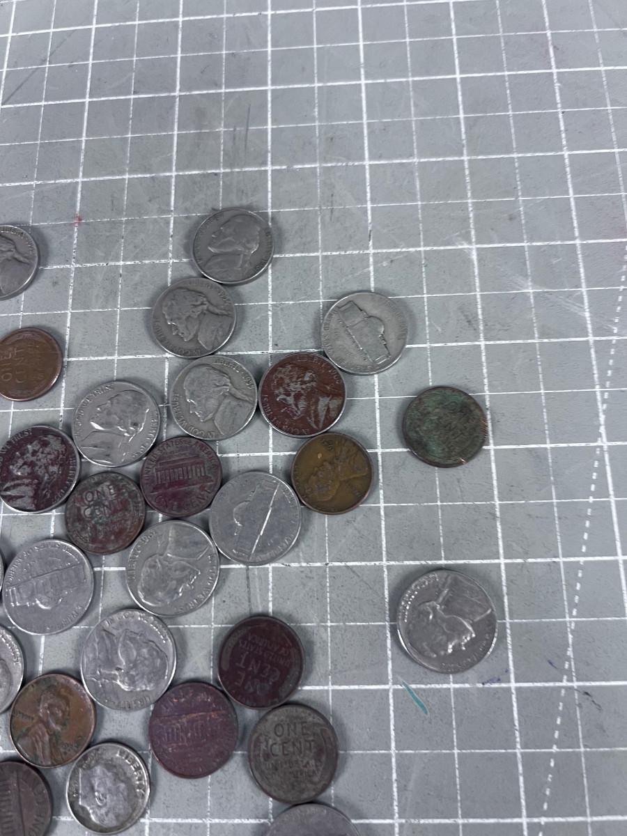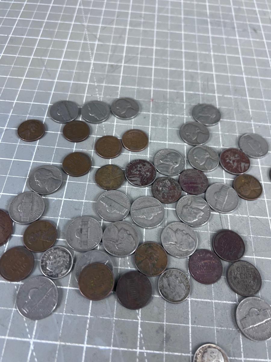 Unsearched Pile of Coins; Silver Dime, Wheat Pennies and old Nickels From Piggy Bank