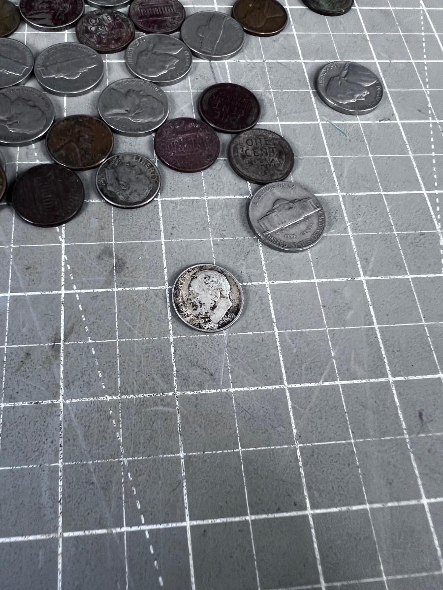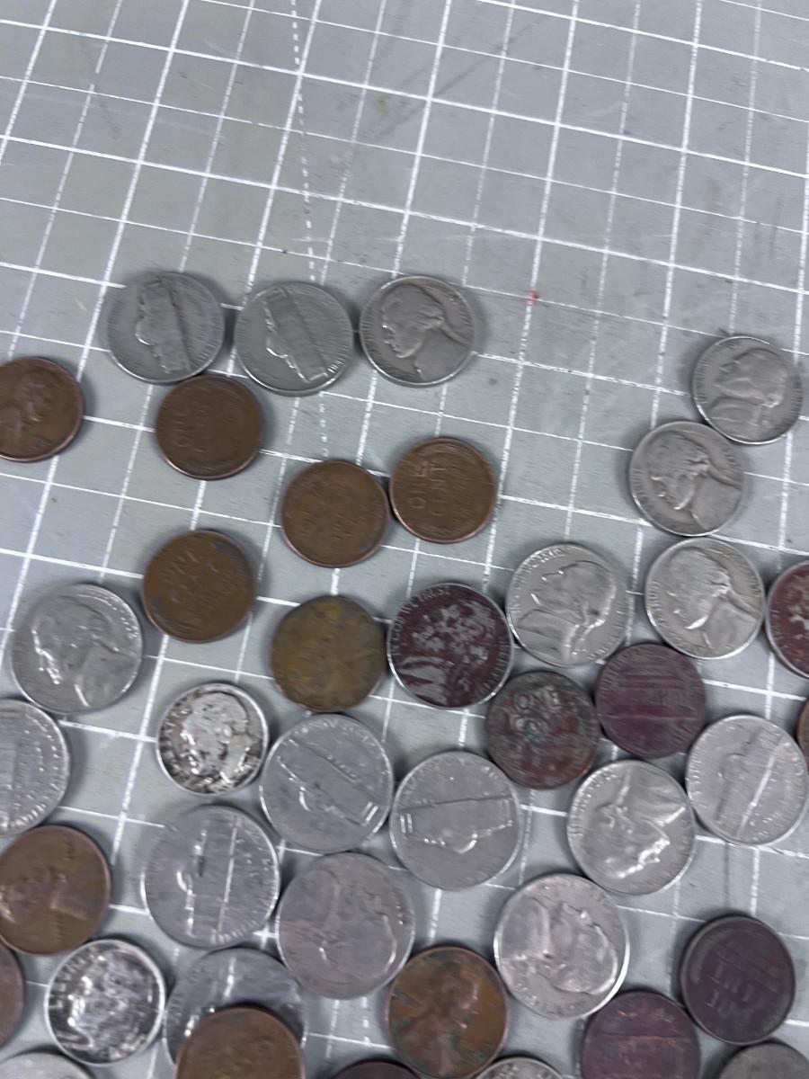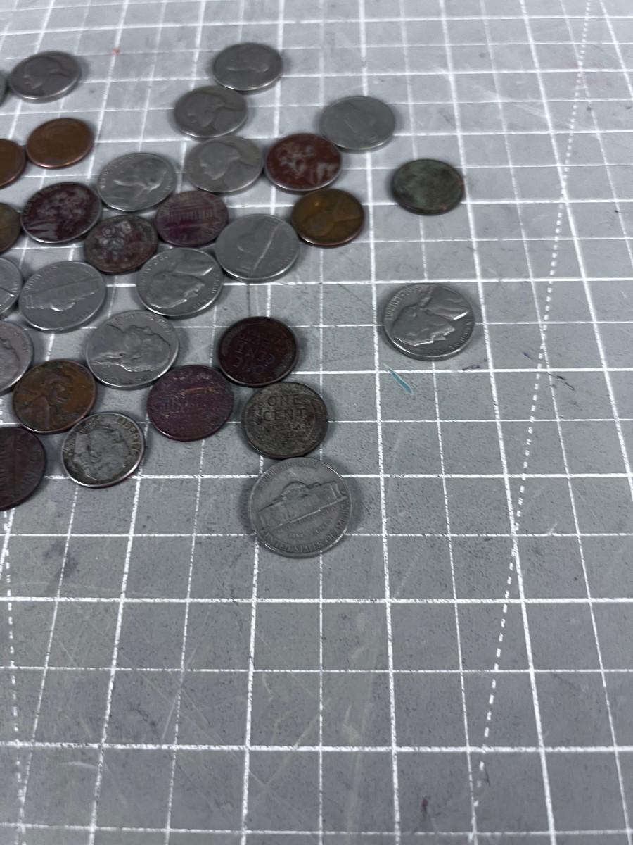 Unsearched Pile of Coins; Silver Dime, Wheat Pennies and old Nickels From Piggy Bank