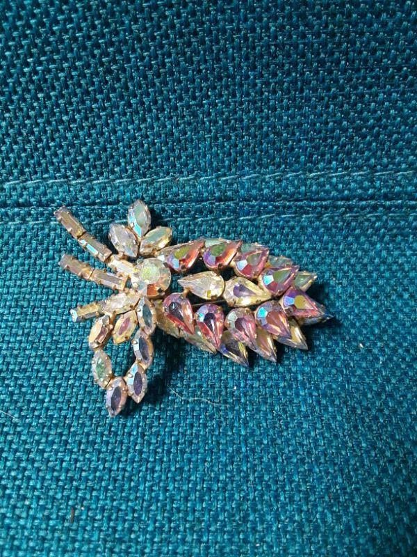 Beautiful AB Gold Pink Rhinestone Brooch. Sparkles every color of the rainbow. Goldtone setting. Measures about 2.5".